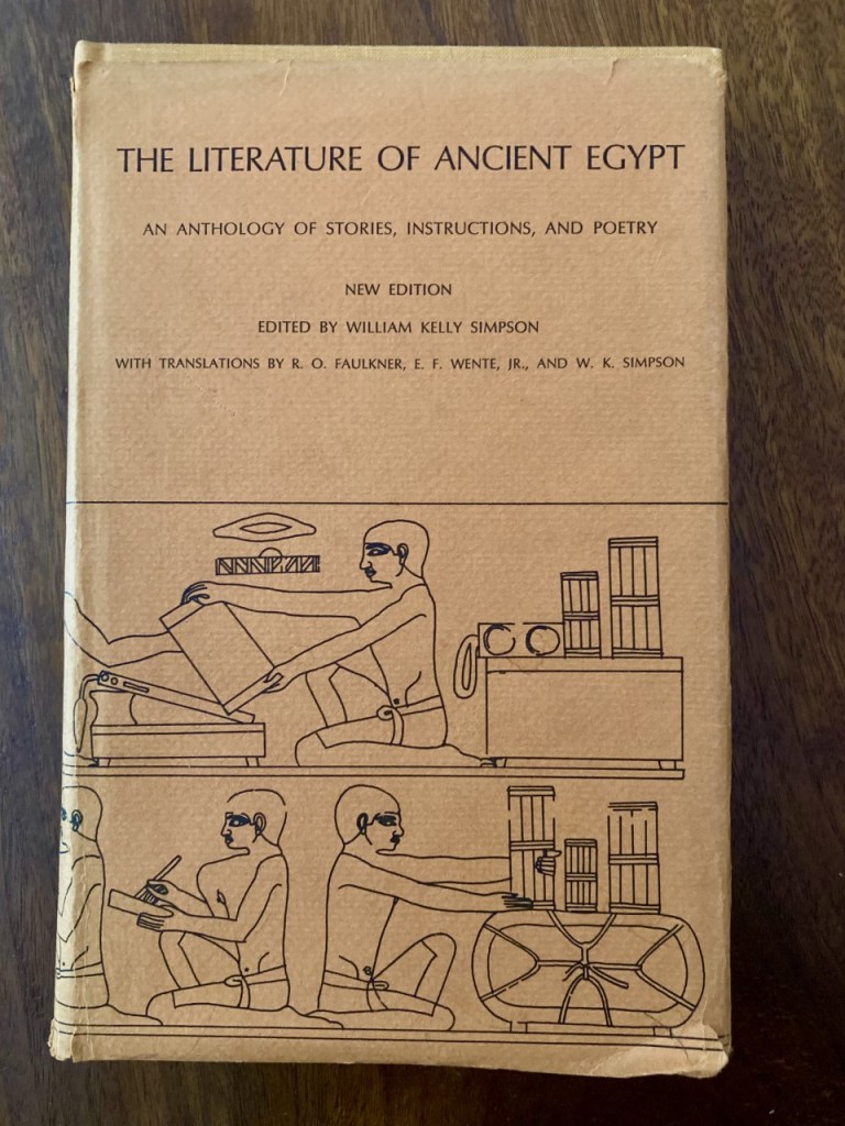 Lately, at our Dickensian flea market, there’s been a man with a table full of books about ancient Egypt. He’s got books on history, on art, on myth, on language. It’s a full collection, somebody’s entire library. I wonder how it all ended up here. I imagine a Tintin character, a scholar with a long white beard and round glasses, an Egyptologist, who gives it all up, sells all his books, and goes on an adventurous journey down the Nile. I bought a beautiful book called The Literature of Ancient Egypt. I will freely admit to you that I didn’t even know such a thing existed. Of course I knew about the myths and the gods, but I didn’t know there were stories and poems, that we could still read lengthy narratives from all those years ago.
