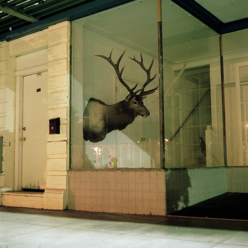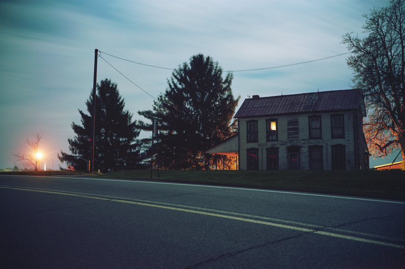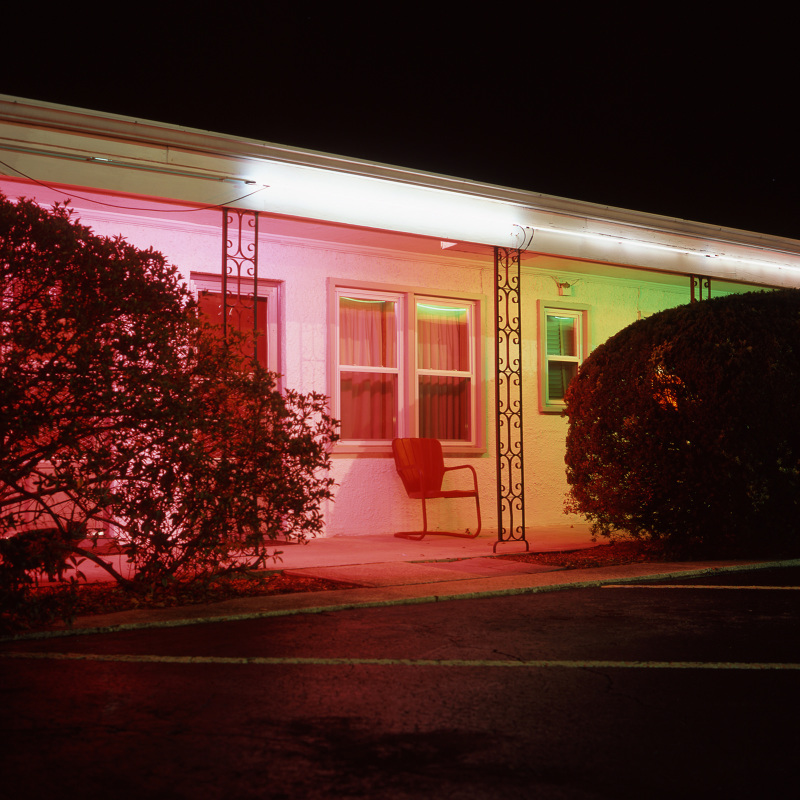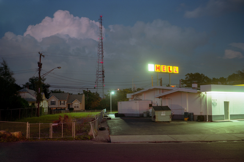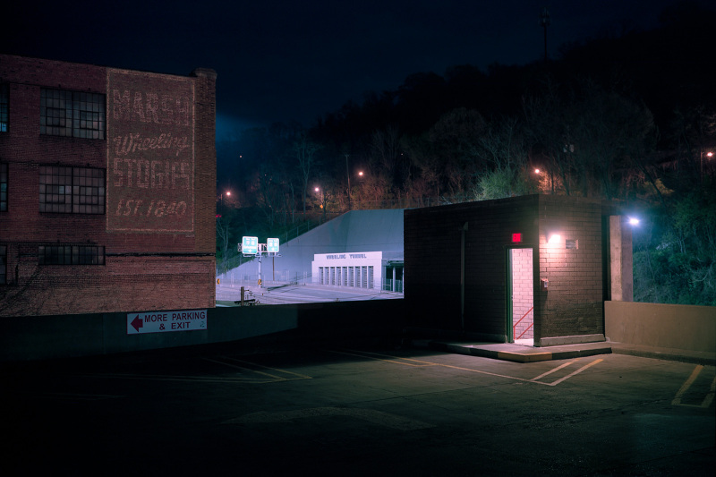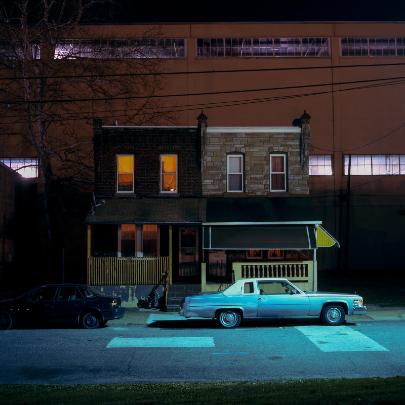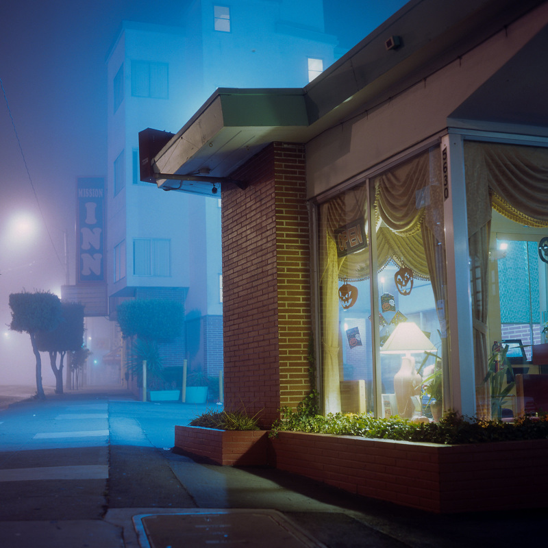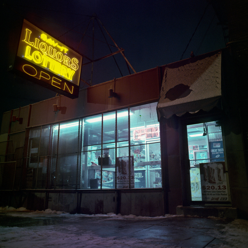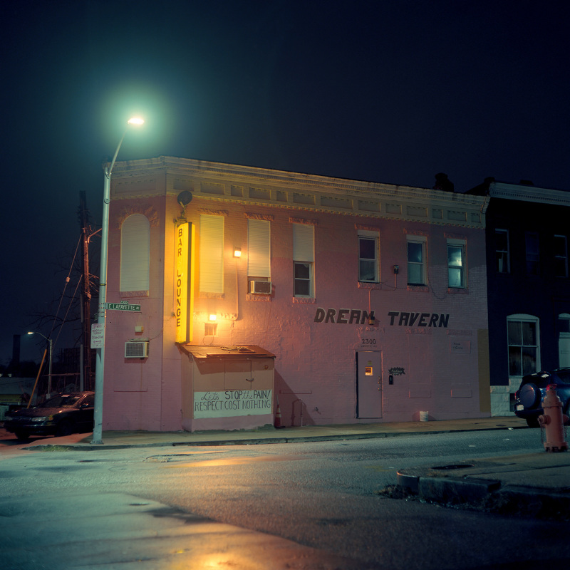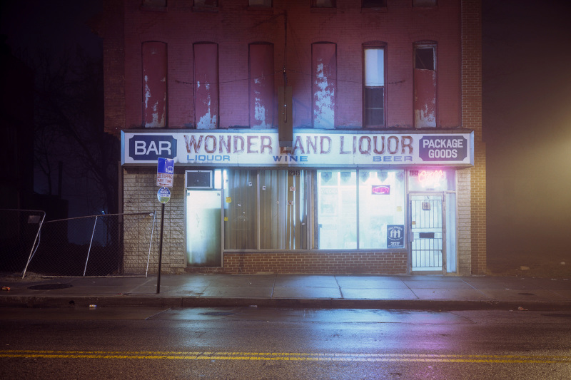 Patrick Joust’s urban photography seems to capture a moment between night and day and a place between spaces humans have made. The coolness of the outside light melts against the warm light of windows, the hot light of neon signs, the trail of headlights from a passing car. The buildings have stories to tell, they’re worn down by the lives of the people who have inhabited them. And though people are very much in evidence–they built the buildings, lit the lights, and drive the cars–they haunt the photographs like dreams or memories.