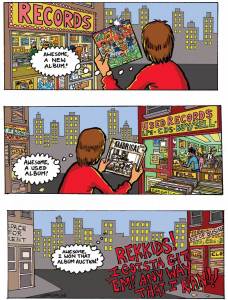 I saw a quote from Jack White of the White Stripes where he said the only major difference from “making it” and “not making it” was the ability to not have a day job, so that as soon as the White Stripes were able to  not have day jobs, that felt like crossing the boundary of success, even though they were still quite small and struggling at that time, and there were many more levels of success to grow and grow to. I think that makes a lot of sense, the levels of success are always infinite, there’s always somebody else who’s more well-known, more respected, making more money, so you can always feel like you “haven’t REALLY made it all the way,” but just based on the initial success of having ANY fans and ANY chance to “be an artist,” that does seem like a reasonable landmark. My own level of success is still where there’s a lot of “day job” elements to what I do, a lot of administrative work keeping track of how many CDs to bring on tour, when to reprint the comics that are selling out, talking to all the clubs to find days and deals, mailing out posters, a hundred things that are not drawing or songwriting. So, to me, a higher level of success would be the ability to not have to do as many of those tasks, if there were people handling that stuff and leaving me to do more drawings and songs. But it’s kind of fun doing all that stuff too, in a weird way. It’s fun being in total control of everything, in a weird way. Even if I seem to complain about it a lot.
