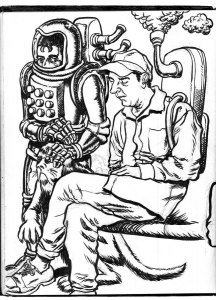 I don’t do much technical stuff so it’s less relevant for me, I just do my drawings with pencil and ink on paper same as I always did, although I do color things on computer often (mostly because everything is printed digitally, so you get much easier color matches when you’re printing digital colors from digital colors – if I did watercolor or colored pencils etc I think I’d have to do a lot more editing work to get the scanned digital colors to look right, before printing). The songwriting stuff is also different from any kind of digital improvements, although I do prefer to write in a text program than on a page a lot of the time. I’ll usually write a song on paper first, then type it in to my laptop, and from the laptop I can read the lyrics a lot more clearly than my handwriting, plus I can print out lyric sheets any time, once it’s typed in, plus it makes changes and edits a lot easier, I can move things around and take out lines and change words, a lot easier.
