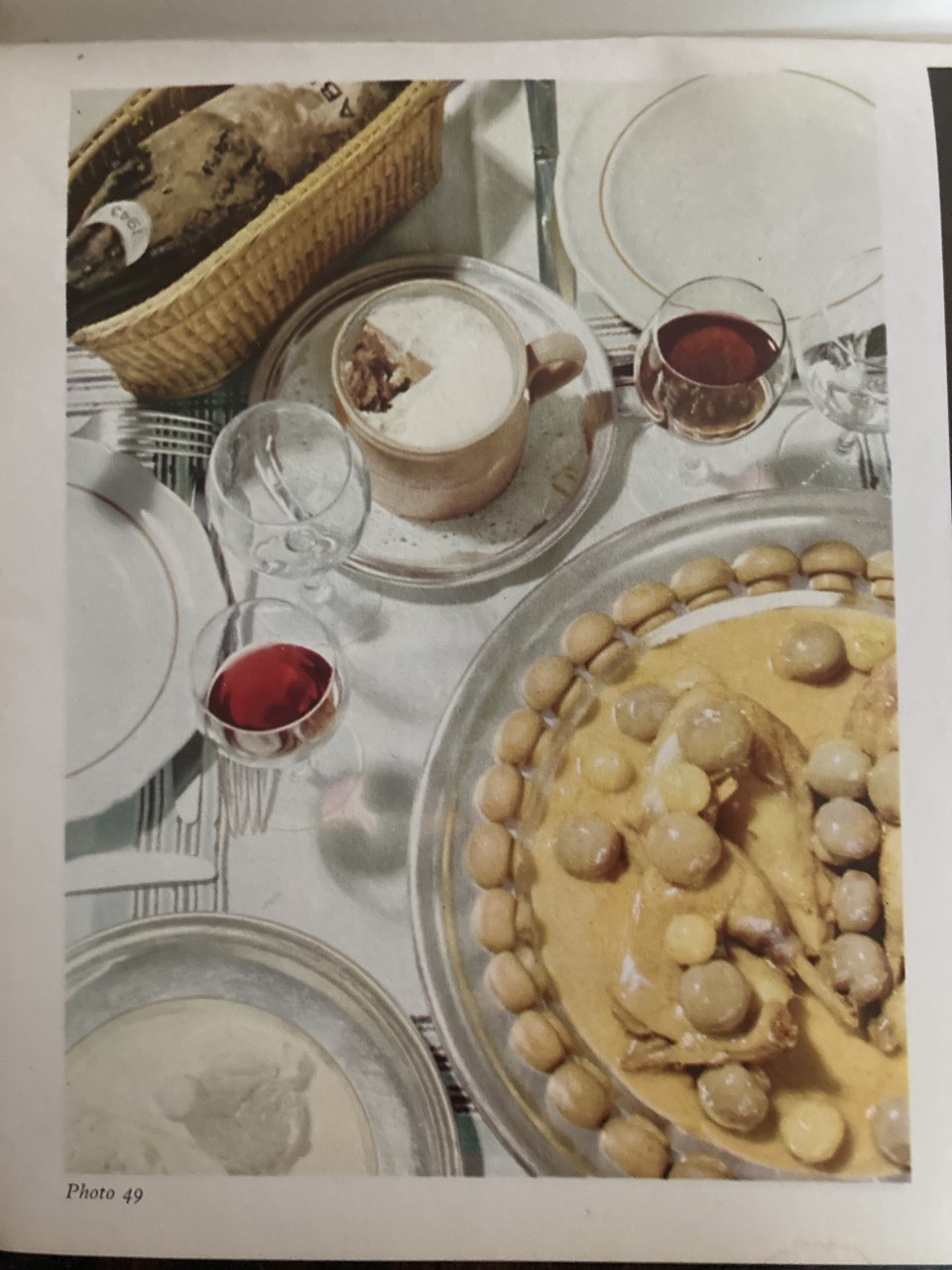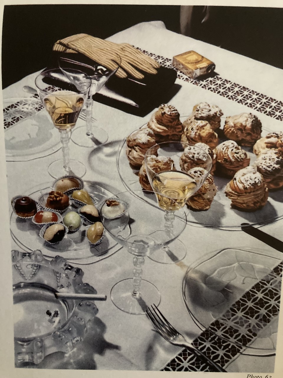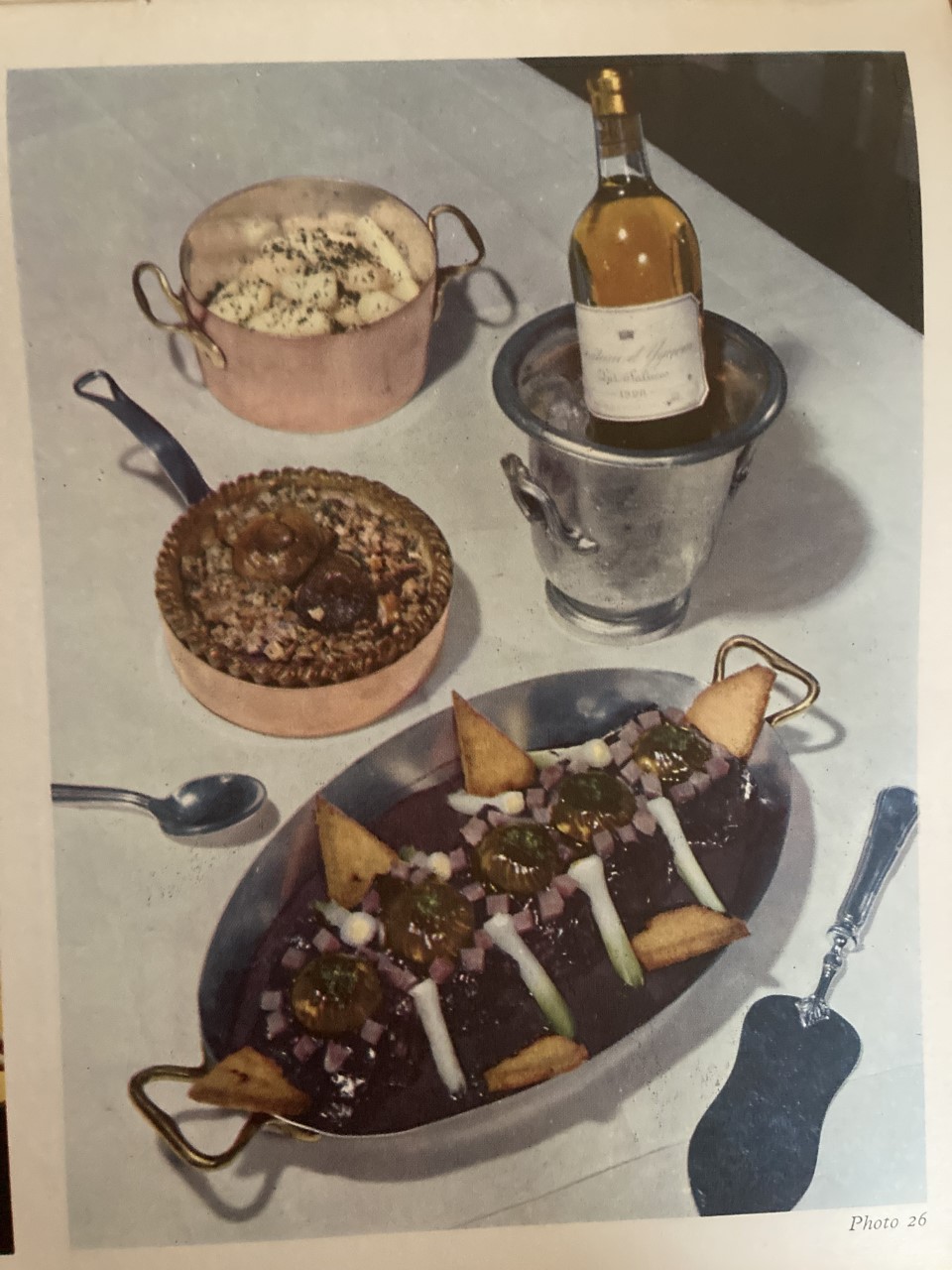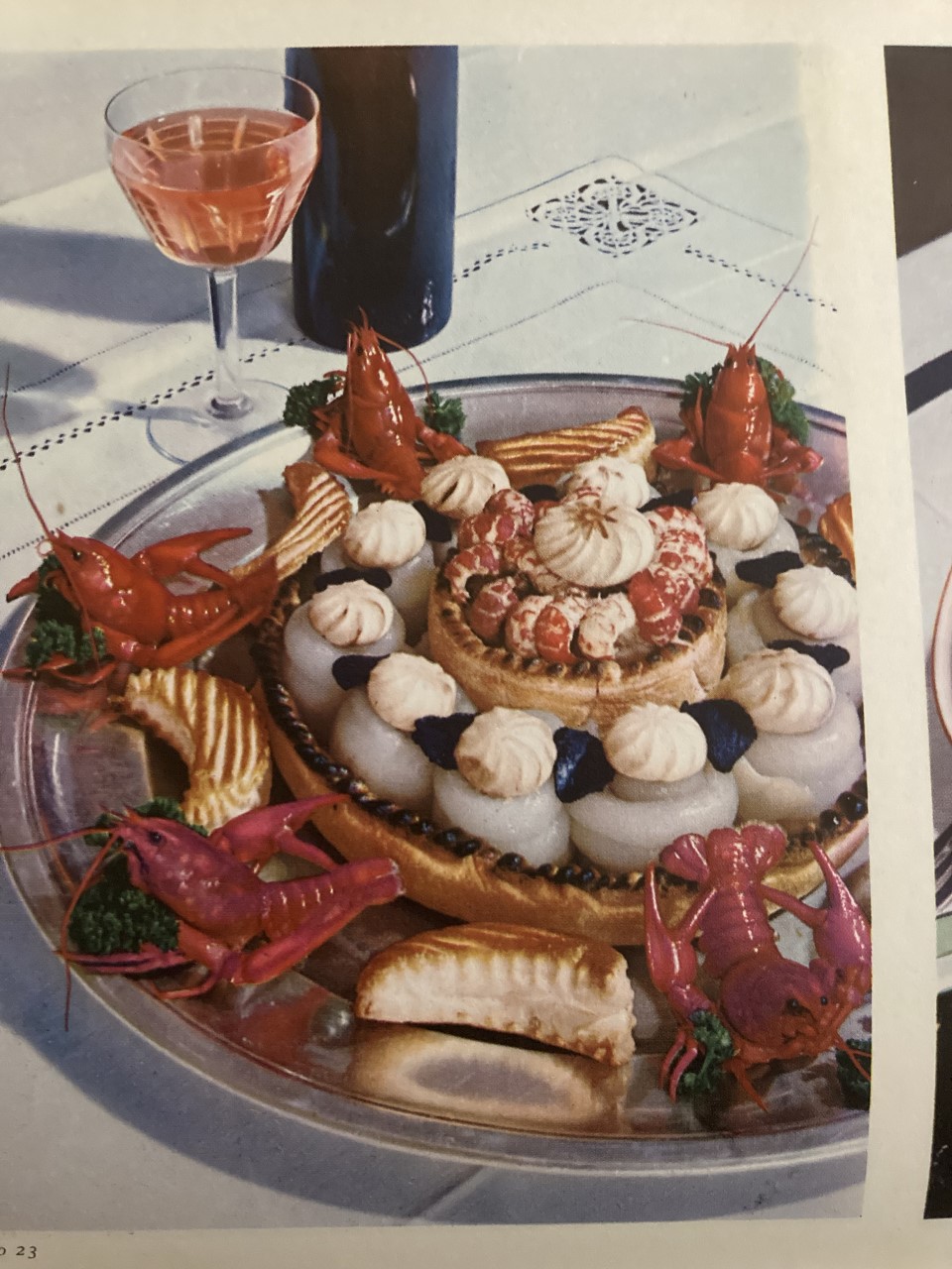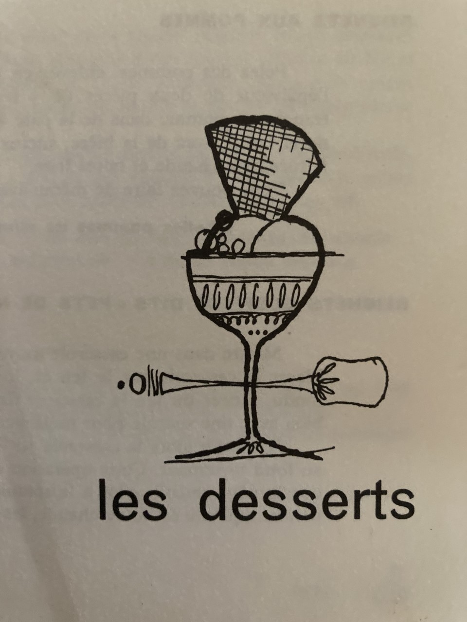 As a teenager my mother worked as an au pair in Belgium. She brought home a cookbook called Cuisine Moderne et Vielles Recettes. Despite having studied the language in High school and college, I don’t really speak French, so reading this is a fun challenge–Puzzling out the french words to arrive at a revelatory moment when I realize they’re talking about melted chocolate and delicious-sounding liqueur combined in beautiful ways. The pictures in this book are remarkable. Extravagant, stately, with baroque arrangements and funereal lighting. They’re so different from French movies of the same decade, which are suave and cool, understated and bathed in elegant sage green and chrome.