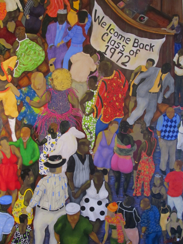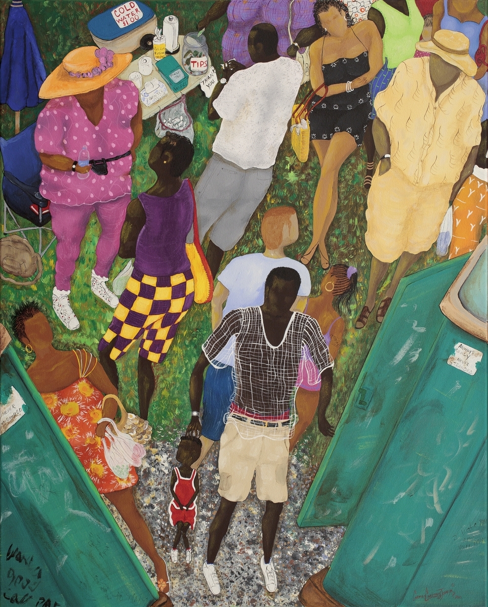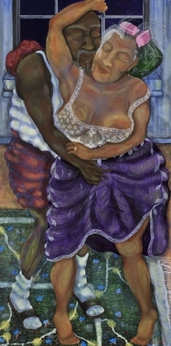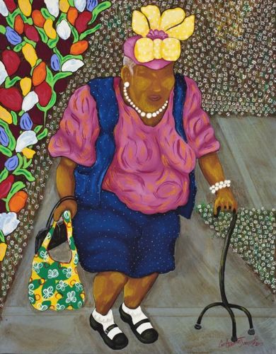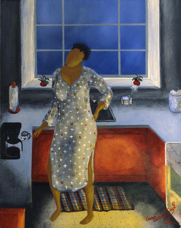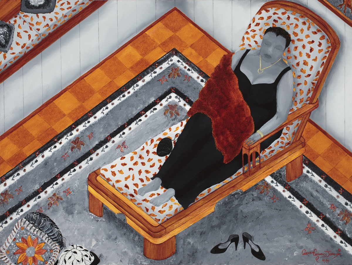 Carmen Cartiness Johnson creates narrative figurative work using bright and bold colors that tell stories of everyday people, largely women facing ordinary life’s challenges and joys. Her artistic influences include Diego Rivera, his use of color, political content and composition, the simplicity of Jacob Lawrence’s shapes, and the complexity of Romare Bearden’s collages. Her work is in collections around the country, including the Charles A. Wright African American History Museum in Detroit, The Philadelphia Museum of Art, and the Library of Congress. See more of her work here.
