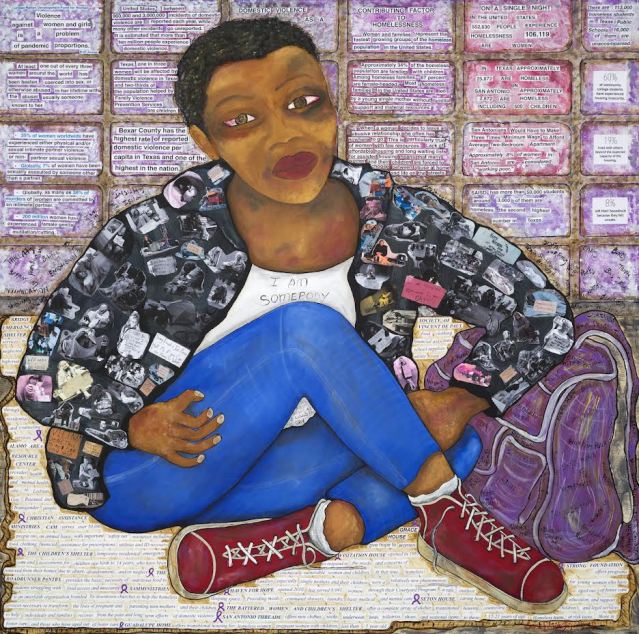 An abused woman, the background shows some reasons why women become homeless. The figure’s jacket contains pictures of homeless people. The backpack lists types of people who can become homeless. The figure is sitting on a surface that is a list of organizations established to aid those in need.