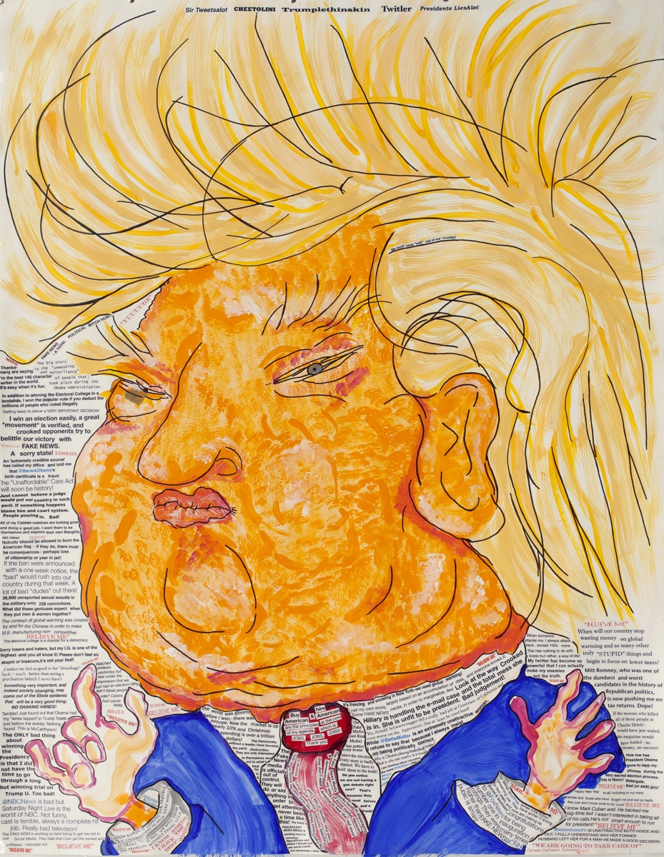 There’s a feminist saying that “the personal is political” and I think that applies to your paintings in many ways, in terms of examining the working of human lives, of our inner world of emotion and imagination, and our outer world of social interaction and family. Some of your works on paper are even more overtly (and brilliantly) political. How do you think about the role of politics in art?