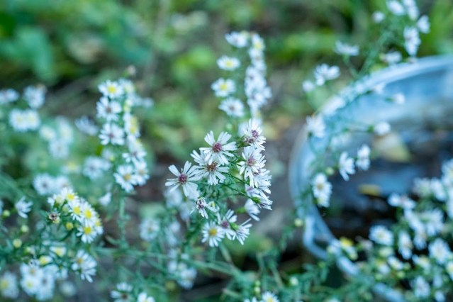 The flowers in the fall are tighter, smaller, and rather than stun us with their massive beauty or seduce us with mystery, they overwhelm us with prolixity. They’re everywhere. They’re even, and even especially, showing up in all the crappy, marginal places that shouldn’t get flowers at all: drainage ditches, untended medians dividing crumbling urban or suburban roads, back lots and parking lots, on the hills supporting railroad bridges, and anywhere just out of the corner of your eye. The poet and naturalist John Landretti wrote an essay called “On Waste Lonely Places” that eulogizes the leftover spaces of the contemporary American landscape, like highway onramps and cloverleafs, the kind of places that yield up an intimacy that the grandeur and sublimity of mountain ranges or mighty rivers just can’t. “The places I came to know best,” he writes, “were the ones in which I found myself at dusk.” That’s what I often think about when I park my car or walking the dogs in the early twilight and realize that everywhere around me bushes of small asters are in bloom. We tend to think about some natural scenes as destinations, as places worth striving toward. The scenes of fall wildflowers seem accidental, and because we’re often alone with them, more intimate.
