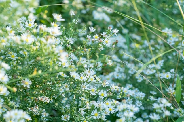 It’s not just the small late-blooming asters: it’s goldenrod, it’s snakeroot and boneset. Dog fennel and ragweed too. Stemmy, woody, thatches of fall flowers are suddenly at the edge of every road, office park, apartment building, park, or playground. Small, tight flowers in pale colors on long stalks. Some like ragweed could hardly be considered flowers at all. Some, like the bushes of small asters are sweetly beautiful when seen in the right light. You could drive for hours and not see the end of it. I’m not exactly sure how far this would spread – these are plants that are native to this area, and in the case of late-blooming asters and goldenrod, there are many species and more than one genus that can be found close at hand. Still I know it must cover quite a large area.