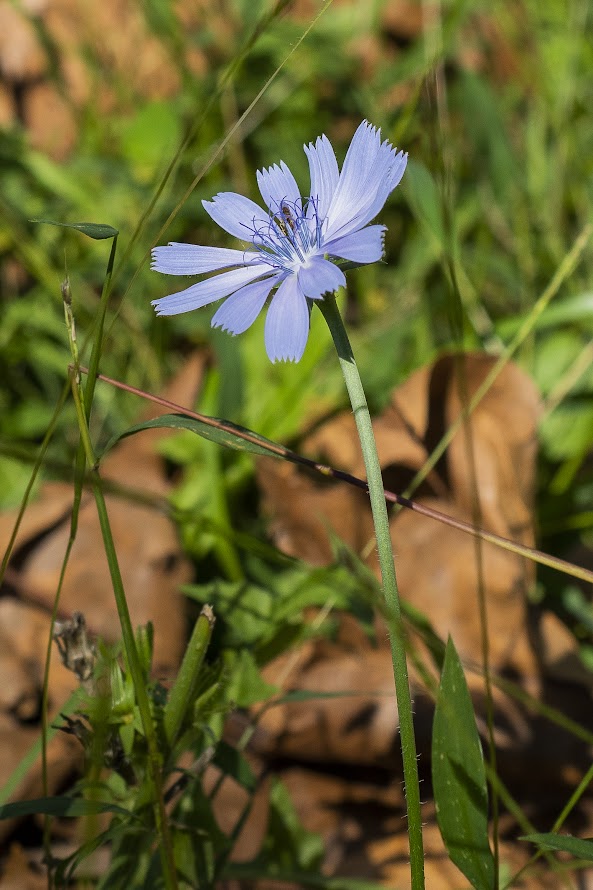 Just before the full-ditch efflorescence of all, there are some harbingers that come from other areas. Some of the most striking late-summer roadside flowers are the common mullein and the chicory flower, both introduced from and quite common throughout Europe, where they also grow in ditches and abandoned fields. Mullein is hard to love, though easy to be impressed by. Its leaves are broad and large and massed in a large circle flat against the ground, and its flower stalk that’s covered in quarter-sized yellow blossoms grows straight up for five to six feet. Dried out by the time we’re fully into fall, that stalk makes for a great imitation spear for children to throw. Chicory, a large blue daisy-like aster, a single flower on a medium stalk, is much easier to love, but both flowers are striking, and they’re both seemingly universal. A roadside ditch in late summer is more or less the same if you’re anywhere in the temperate zone of the northern hemisphere. I have confidence that in the fall the same sort of roadside scene happens across a wide swath of the globe as well, even if the plants aren’t all the same.
