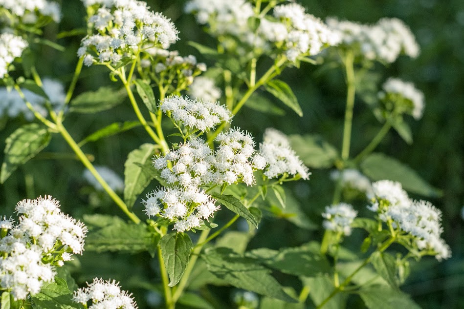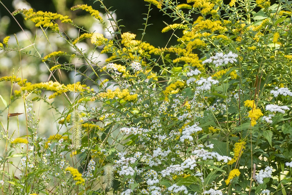 The asters are weeds too, and unlike the knapweeds, are treasured by gardeners specializing in native plants. But they don’t need much encouragement to send out each fall those long stems covered in tiny blossoms that range, depending on the species, from white to blue to purple. Mostly white, and fairly plain when you’re looking at just a single blossom. That’s the aesthetic of the season: a proliferation of small, monotone, woody blossoms that overwhelm and charm in their sheer number and repetition, mostly white and yellow, and a few edging on a faint purple. There are dissenting notes: pokeberry has its almost gruesome red berries out the same time, but that’s a different conversation. The flowers are in agreement among themselves, and the somewhat less common weedy natives too, like boneset and rabbit tobacco, speak in wedding-dress whites alone. Even the names of the weedy fall wildflowers are humble. Snakeroot, for example, a lowliest of names. Even less attractive as a plant when it’s not in bloom than goldenrod or late-blooming asters, snakeroot’s flowers in the fall merge at the end of stalks into soft, curved platforms of blinding white. I’m always ambivalent about its presence in the gardens all summer, but it’s going to get in somewhere no matter what. And by the time it blooms I’m not going to remove it.