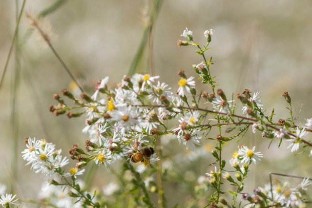 It’s that humble, unshowy appeal that makes its case through determination, repetition, and scale that gets me. And unlike the showier summer flowers, with the weedy fall wildflowers there’s not much unseen mystery. They may not be for us necessarily, but the distance between what pollinators might see and what we can see narrows considerably in the fall, and we have an opportunity in which the flowers and the pollinators both seem closer and more familiar to us. Like with Landretti’s marginal wastelands, our appreciation of the scenery becomes more intimate. More personal. These are not grand shows of color and majesty: there’s nothing that sublime about bees tumbling over tiny white petals in a ditch.