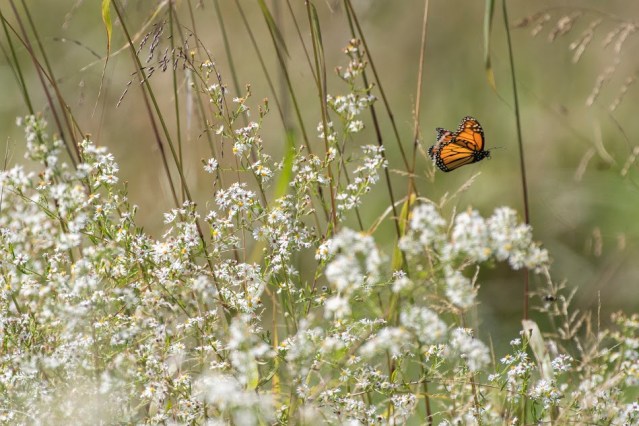 I’m not completely sure why these wildflowers all blossom at this time, but I can hazard a guess. Flowers take energy to produce, and weeds need time to settle in and make the soil their own. These aren’t lilies that have been soaking in the mud for weeks before it’s warm enough for them to send up their stalks. So no springtime blooms for them. They need to ensure they have time to do the hard work of colonizing new territory before they can blossom, and so they save it for the last possible moment of warmth. And it’s not for naught: while the frenetic activity of summertime has quieted into fall’s more somber pace, there are plenty of pollinators around eager for whatever nectar the flowers can provide. The asters and snakeroot seem to attract a lot of monarch butterflies, as the last generation of summer’s monarchs needs substantial energy sources for their migration to Mexico. Goldenrods seem to support an entire ecosystem of pollinators and the spiders and other insects that prey on the pollinators. If you scan enough goldenrod blossoms carefully enough, you’ll eventually find the goldenrod crab spider, an ambush predator hiding in the flowers that’s implausibly the same color. The spider can change its color from molt to molt, switching between white and yellow depending on which flowers it will be hunting from.