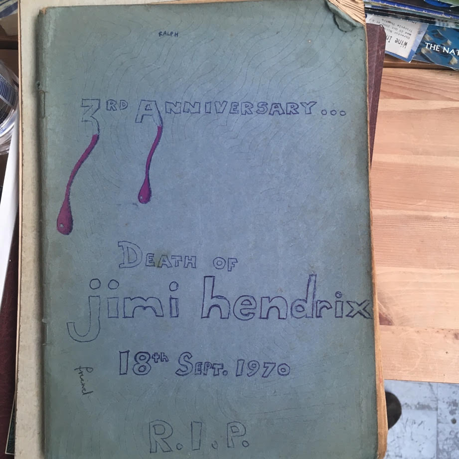 The house went into shock. I remember composing a giant memoriam on my blue school rough book which said Jimi Hendrix RIP Sept 18th 1970. Evidence revealed that it was the 3rd anniversary of his death still being felt. We listened to the four LPs – Are You Experienced?, Axis Bold As Love, Electric Ladyland and live album Hendrix In The West. Simon Korner later bought Cry Of Love the scribble-cover LP but I never listened to it because it was released after Hendrix died and so I wrongly suspected it of being inferior and somehow not meant to be.
