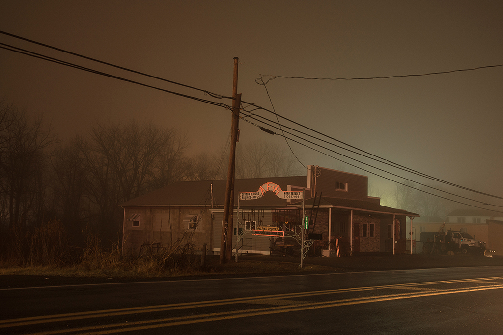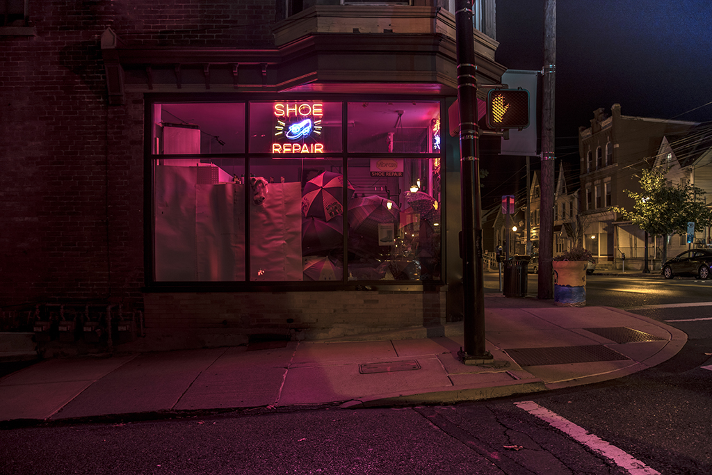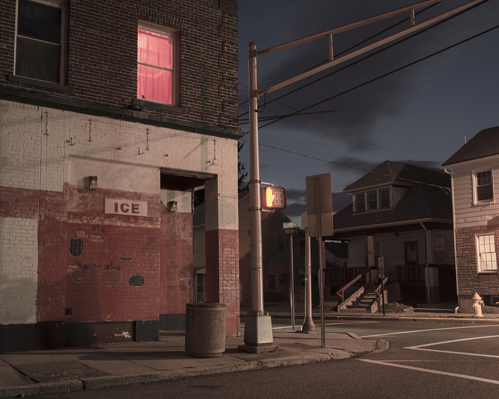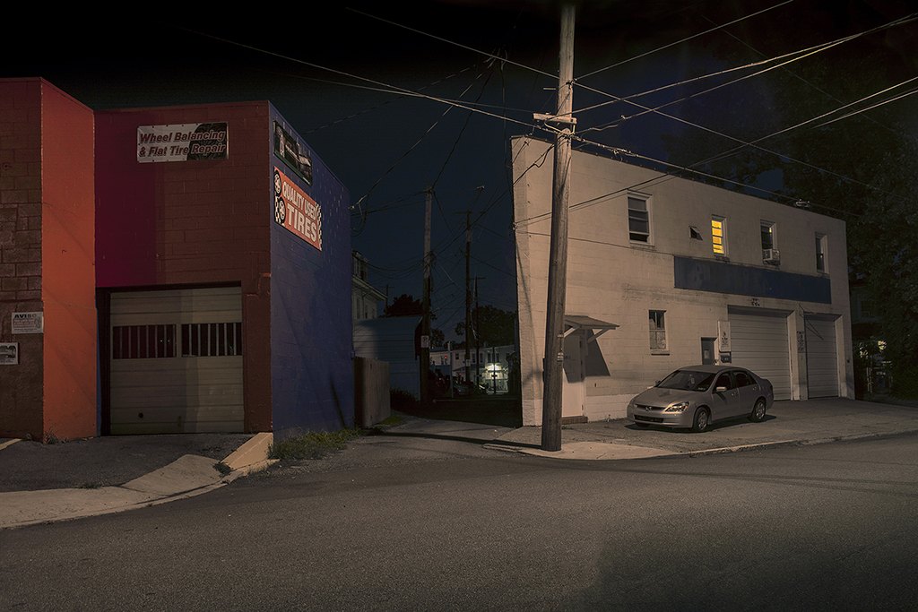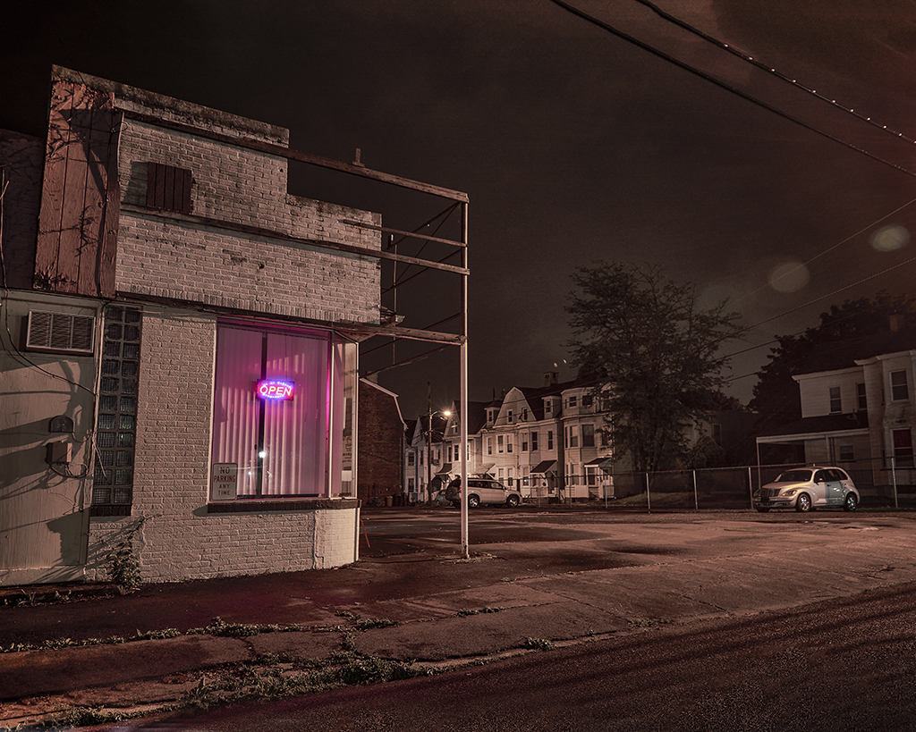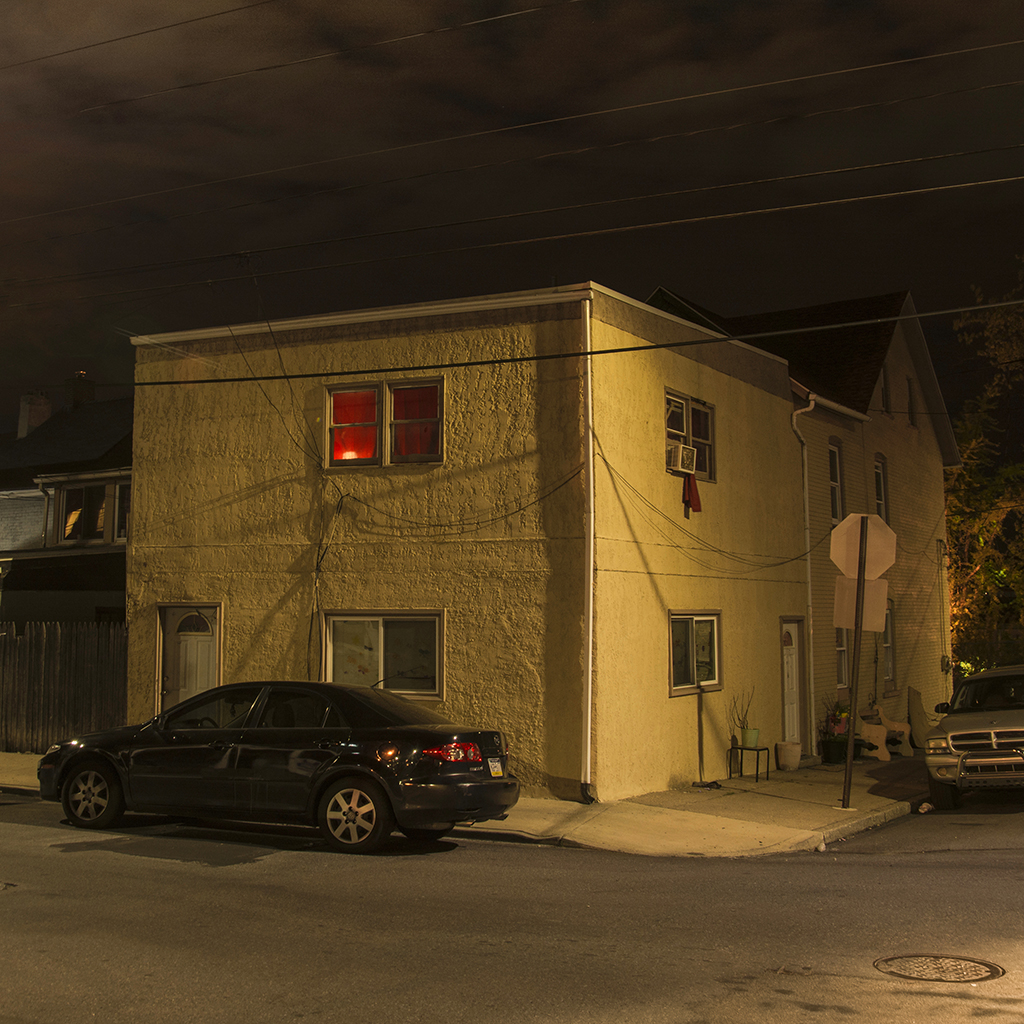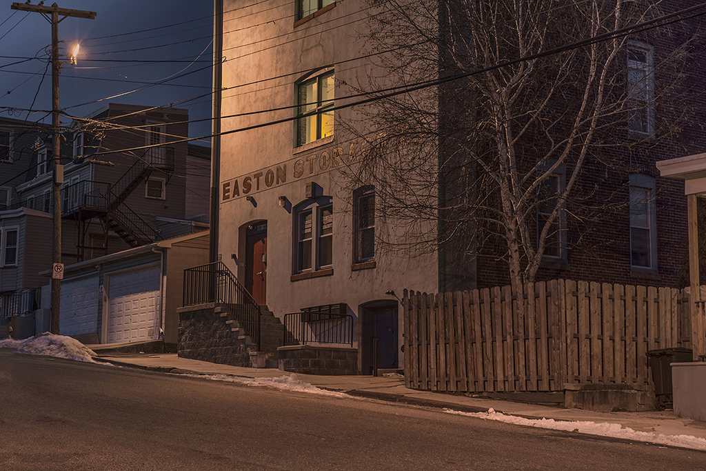 Since the close of 2015 I have been photographing at night in the Easton, Pennsylvania area. Easton Nights is a story which grew from the unique and uncommon valley in which the city lies, and is told with images of the unpeopled landscapes taken at night. The night has its own visual rules, its own color wheel, and its own ethereal presence. Here, in the small hours, the world we see as mundane, cascades into dream. City lighting is meant to light up objects in much the same way you would light a still life or a stage set. Coupled with the pink light emitted by the odd sodium vapor streetlights, Easton becomes a silent city of lit stages, all in unreal color and shadow. Every space acts as a reflection of the people who made it. An empty geometry, with its decades of formation, creates an unusual living lyricism; emphasized with paint stroke-like diffractions, animated distortions and the occasional painted words which connect to the moment in our time. Like a surreal scene from a Guilermo del Toro film: trash bins and Toyotas, stop signs and doorways all come to life; leaning, stretching, and emanating with umbrageous hues. These are our stages, with the houses our beehives, and the doors our portals. Complete they are a mimesis of our daily life, as can only be shown in the mystical emptiness of night. A world of ready-mades that would make R Mutt proud. Then with the dawn, comes the beginning, where we all wake, then act; all while these magical and romantic worlds return to sleep.