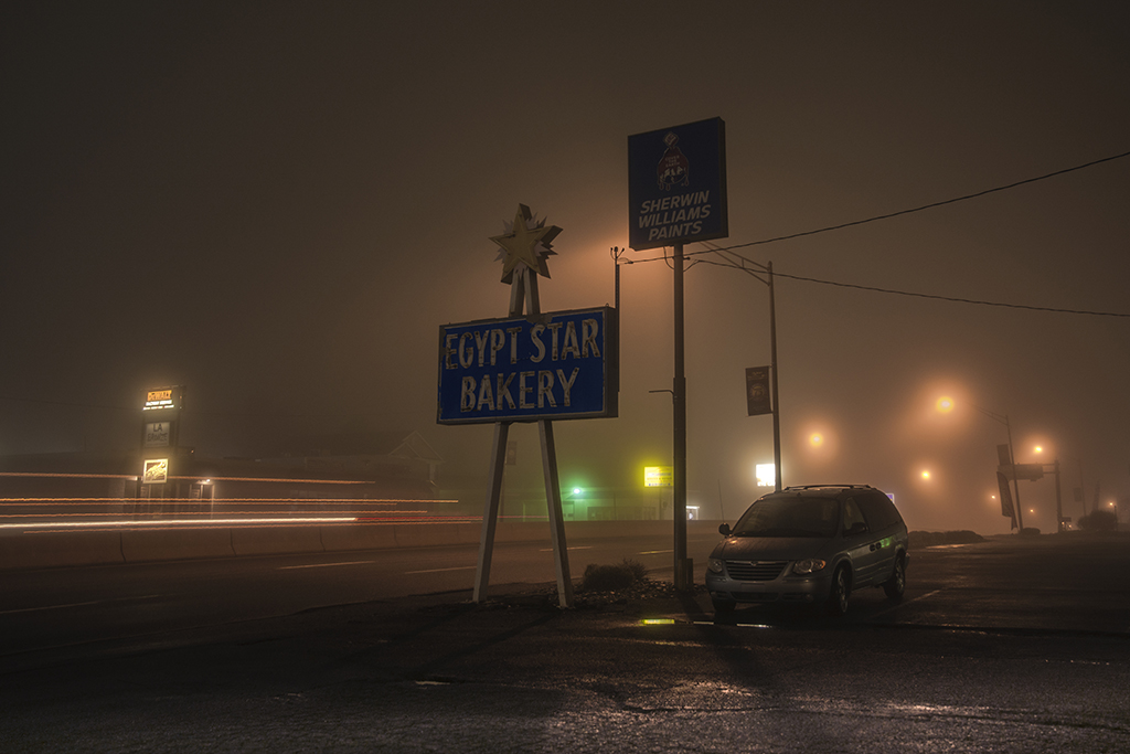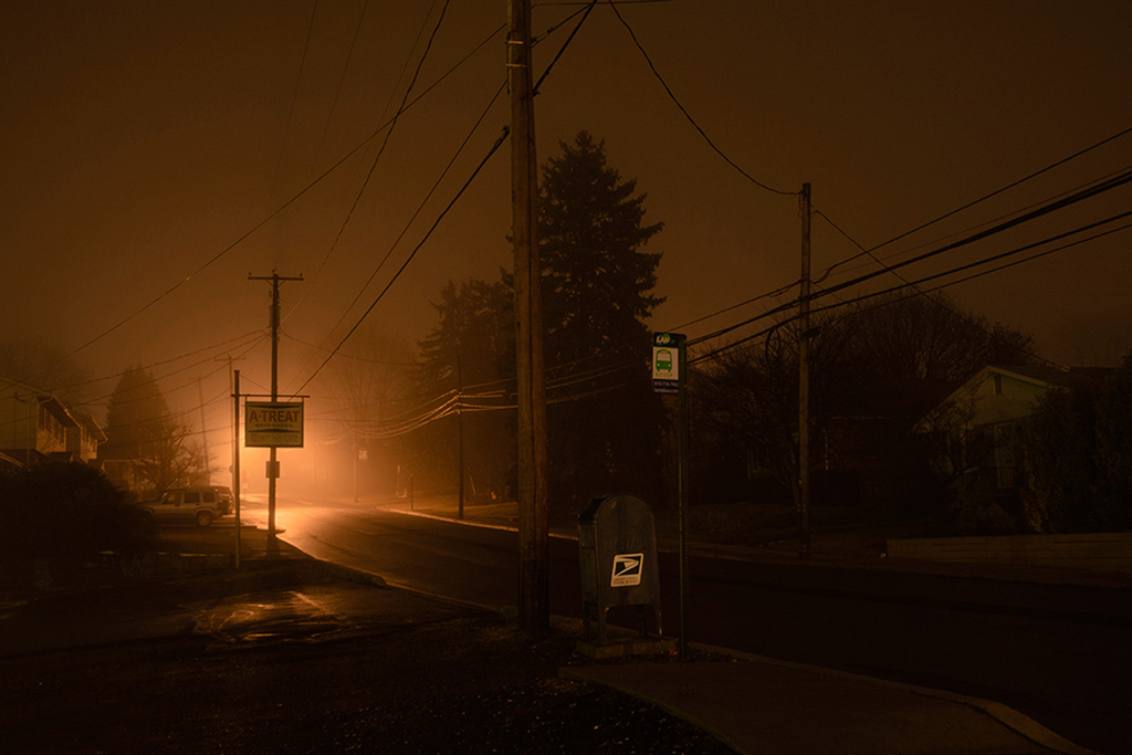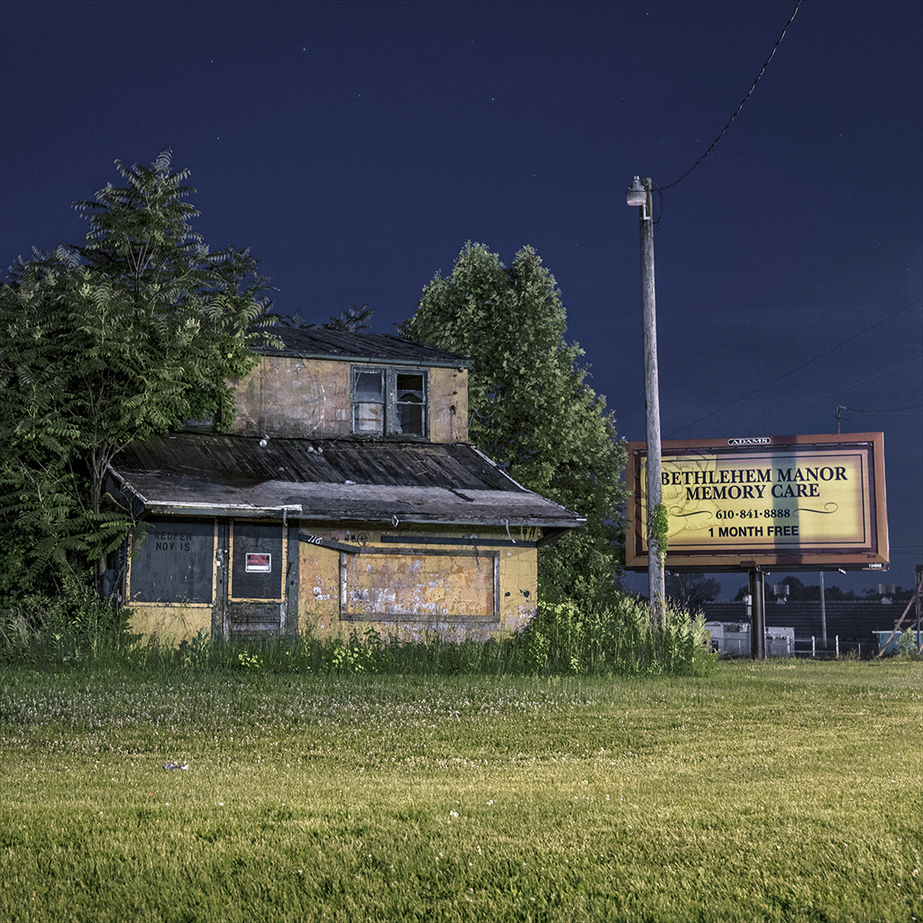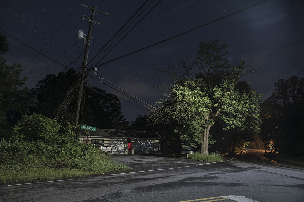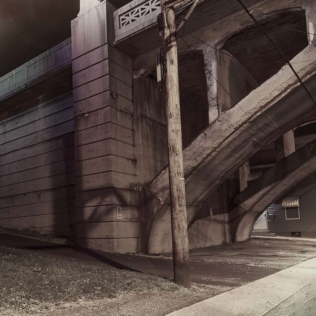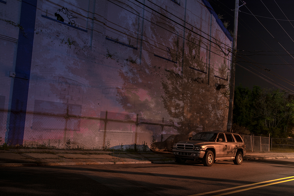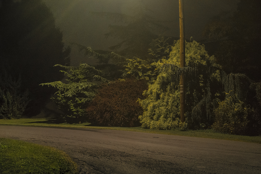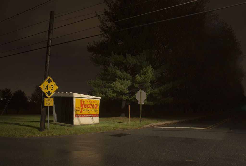 Since the close of 2015 I have been photographing at night in the Easton, Pennsylvania area. Easton Nights is a story which grew from the unique and uncommon valley in which the city lies, and is told with images of the unpeopled landscapes taken at night. The night has its own visual rules, its own color wheel, and its own ethereal presence. Here, in the small hours, the world we see as mundane, cascades into dream. City lighting is meant to light up objects in much the same way you would light a still life or a stage set. Coupled with the pink light emitted by the odd sodium vapor streetlights, Easton becomes a silent city of lit stages, all in unreal color and shadow. Every space acts as a reflection of the people who made it. An empty geometry, with its decades of formation, creates an unusual living lyricism; emphasized with paint stroke-like diffractions, animated distortions and the occasional painted words which connect to the moment in our time. Like a surreal scene from a Guilermo del Toro film: trash bins and Toyotas, stop signs and doorways all come to life; leaning, stretching, and emanating with umbrageous hues. These are our stages, with the houses our beehives, and the doors our portals. Complete they are a mimesis of our daily life, as can only be shown in the mystical emptiness of night. A world of ready-mades that would make R Mutt proud. Then with the dawn, comes the beginning, where we all wake, then act; all while these magical and romantic worlds return to sleep.