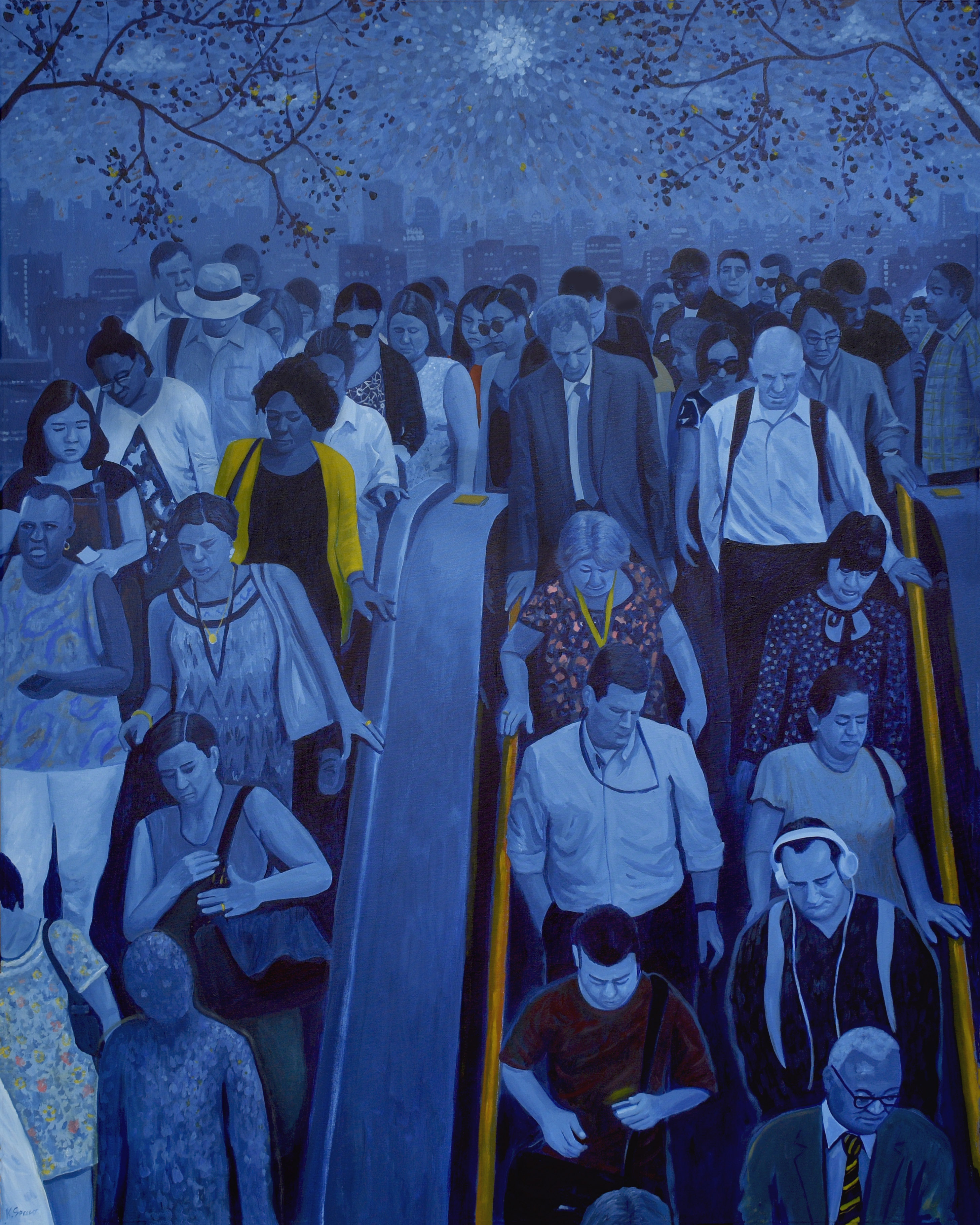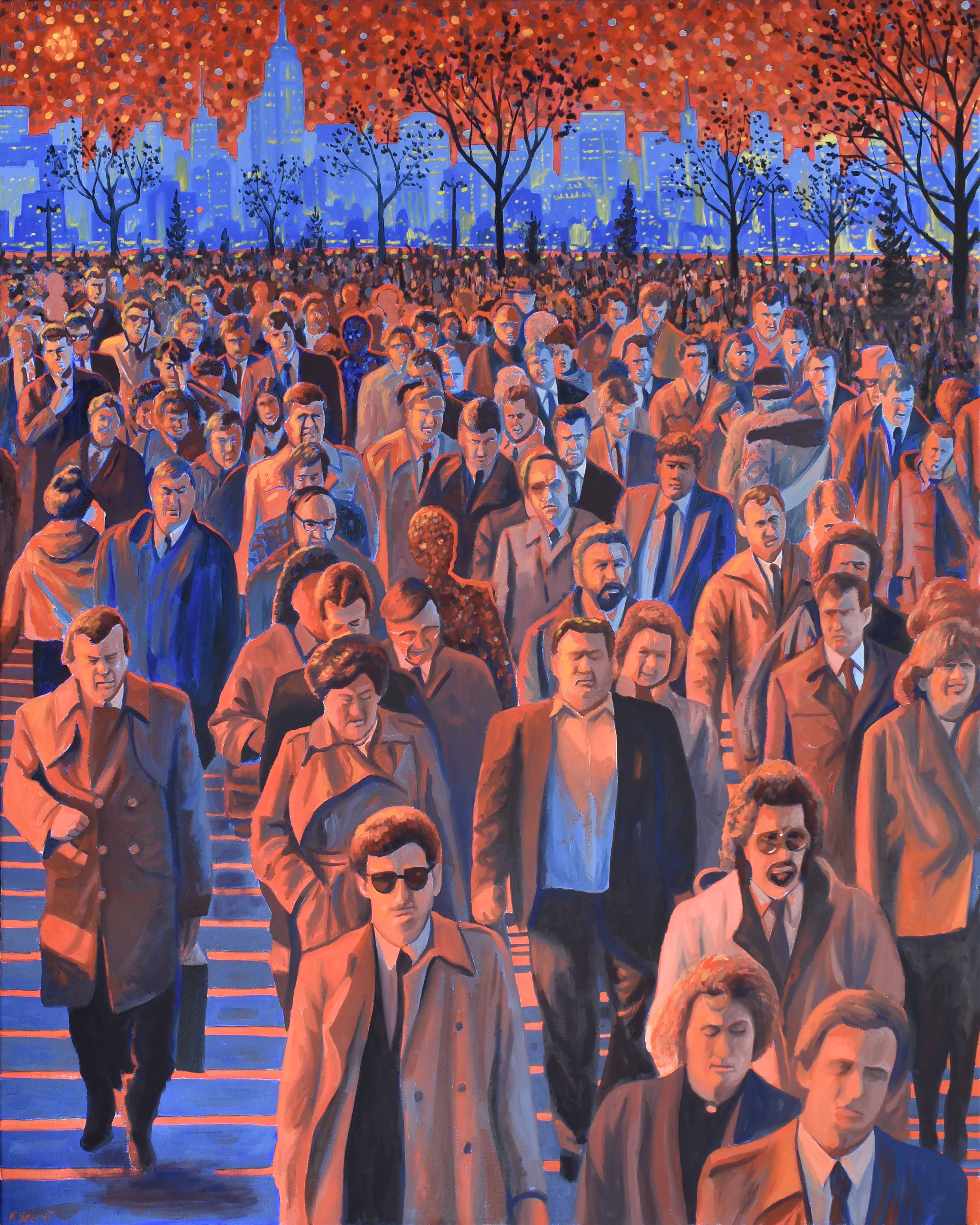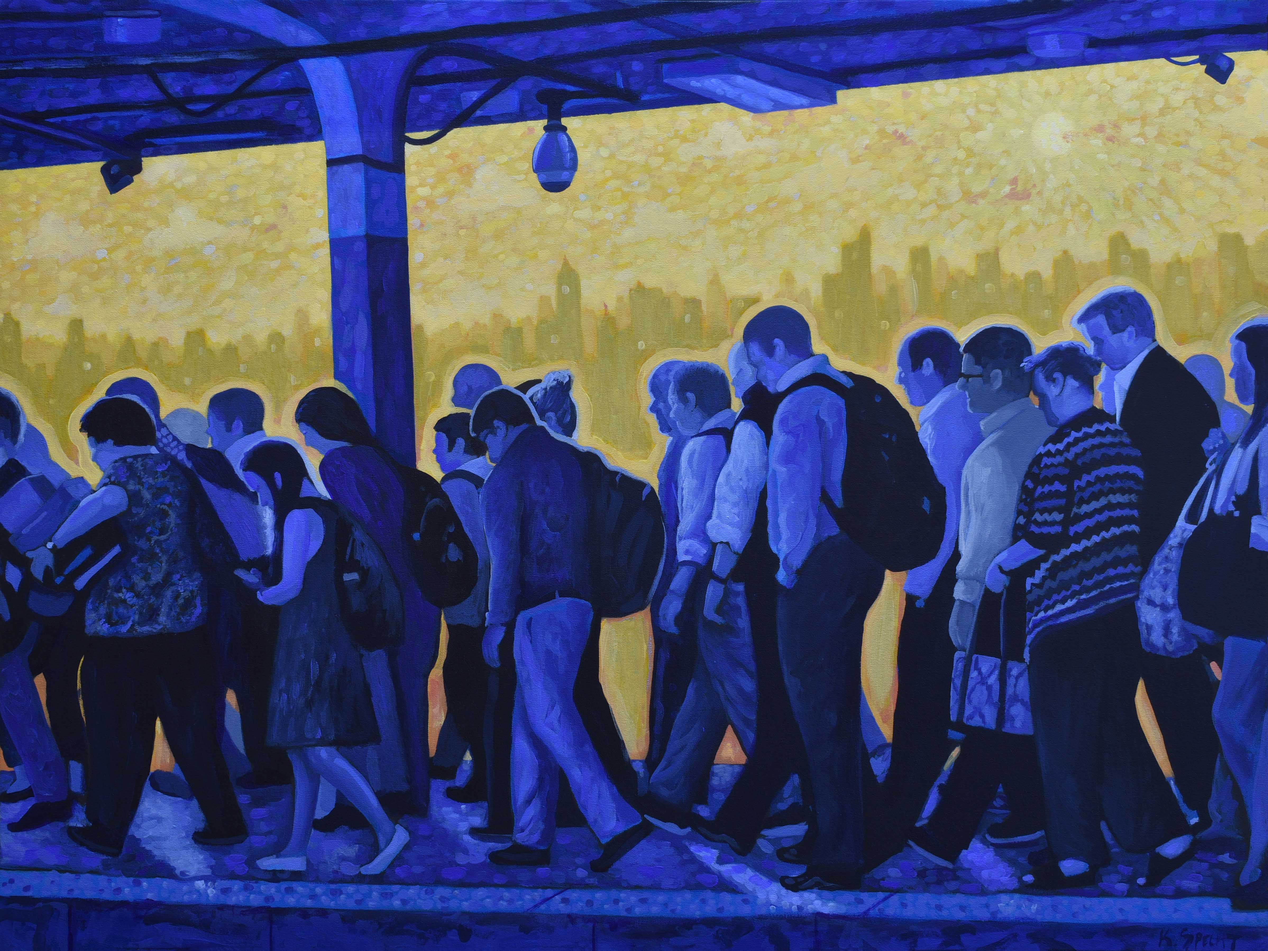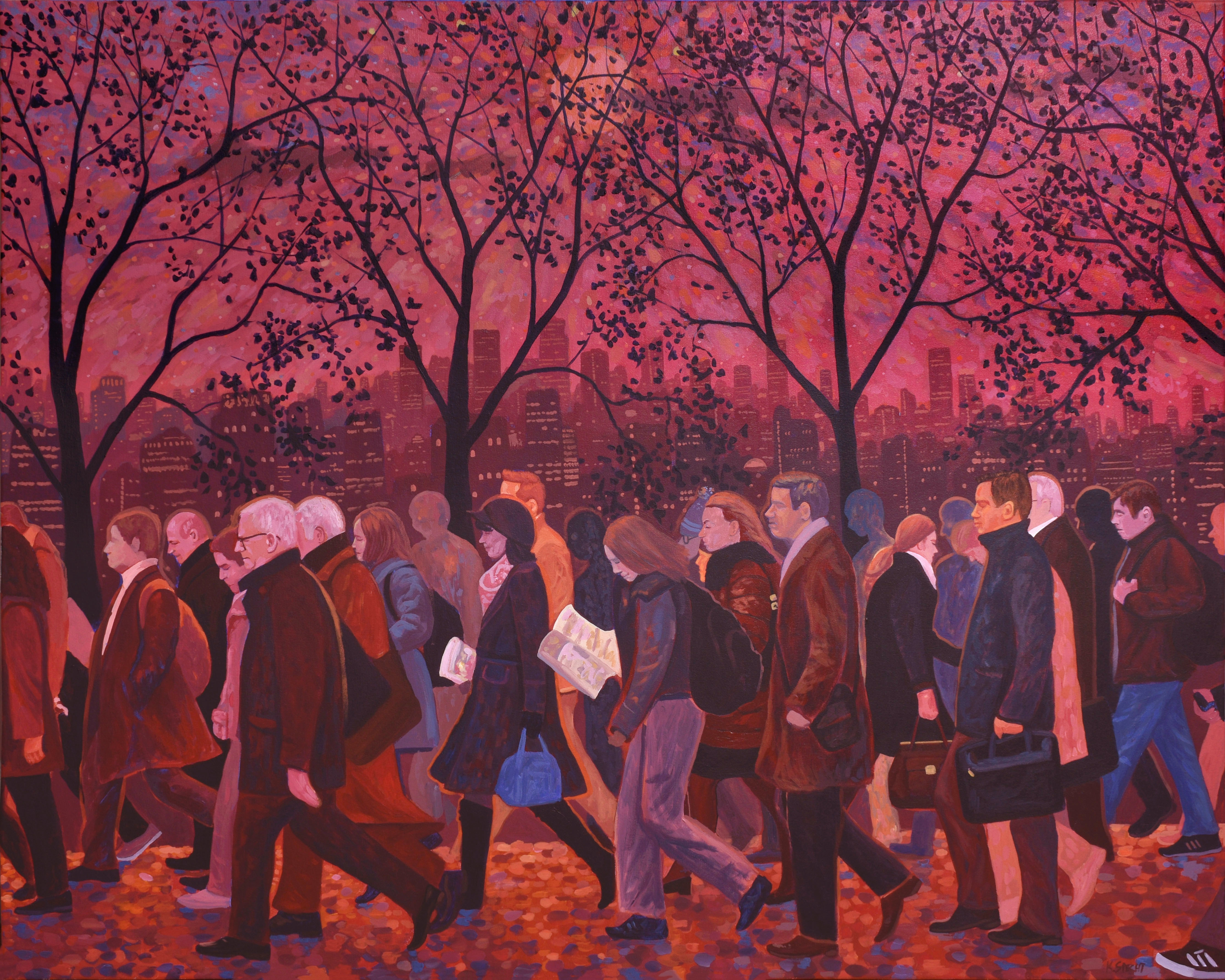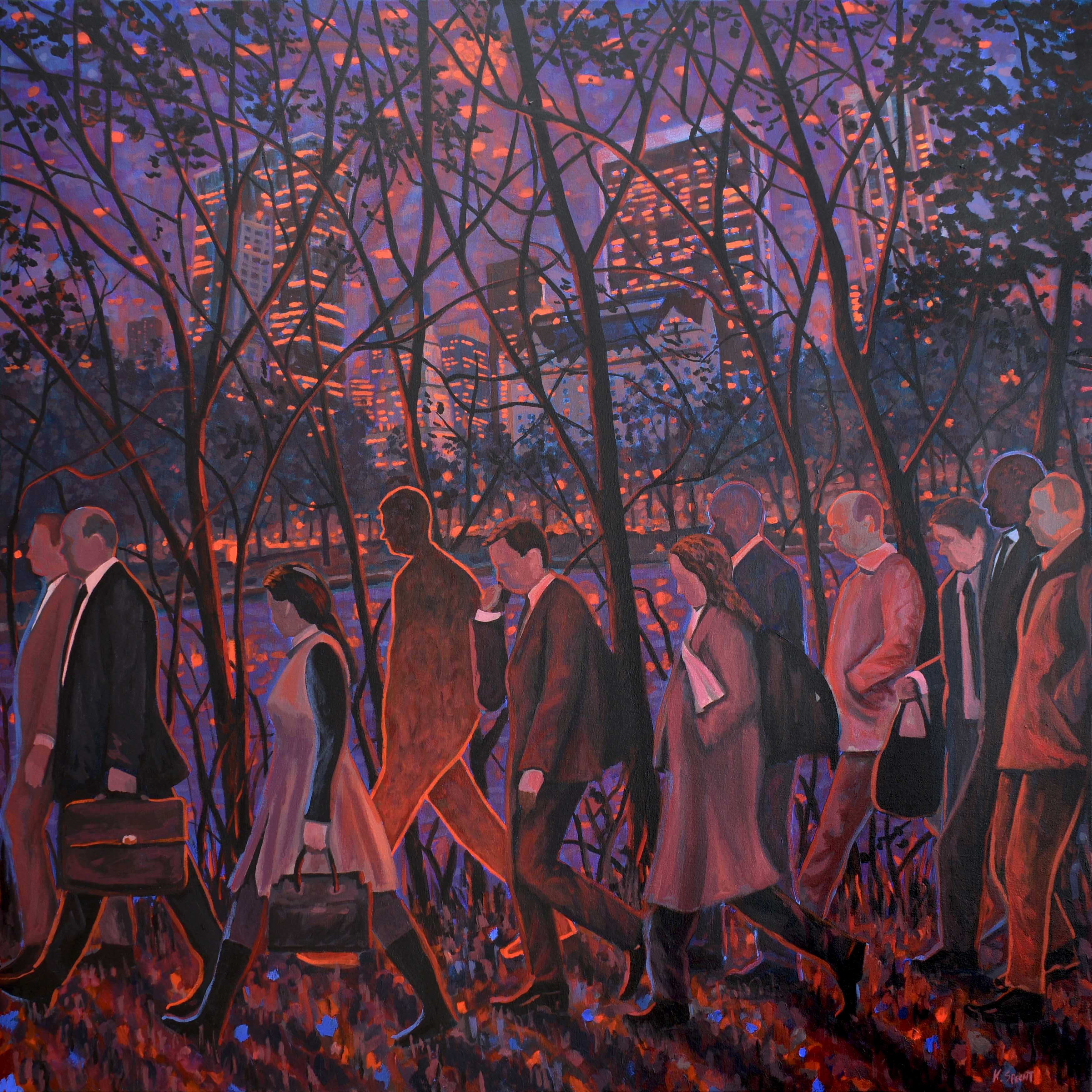 There’s an eerie beauty to Kevin Specht’s paintings of commuters filing to and from work. The figures, familiar and mysterious, pass through the shifting glow of dawn and dusk to shut out the light, and close themselves in their cubicles and offices. The walkers maintain a steady distance, with the studied loneliness of strangers who see each other every day, day after day. And yet there is a near-glow radiating from the figures and illuminating the space between them, suggesting the possibility of humanity and of connection.