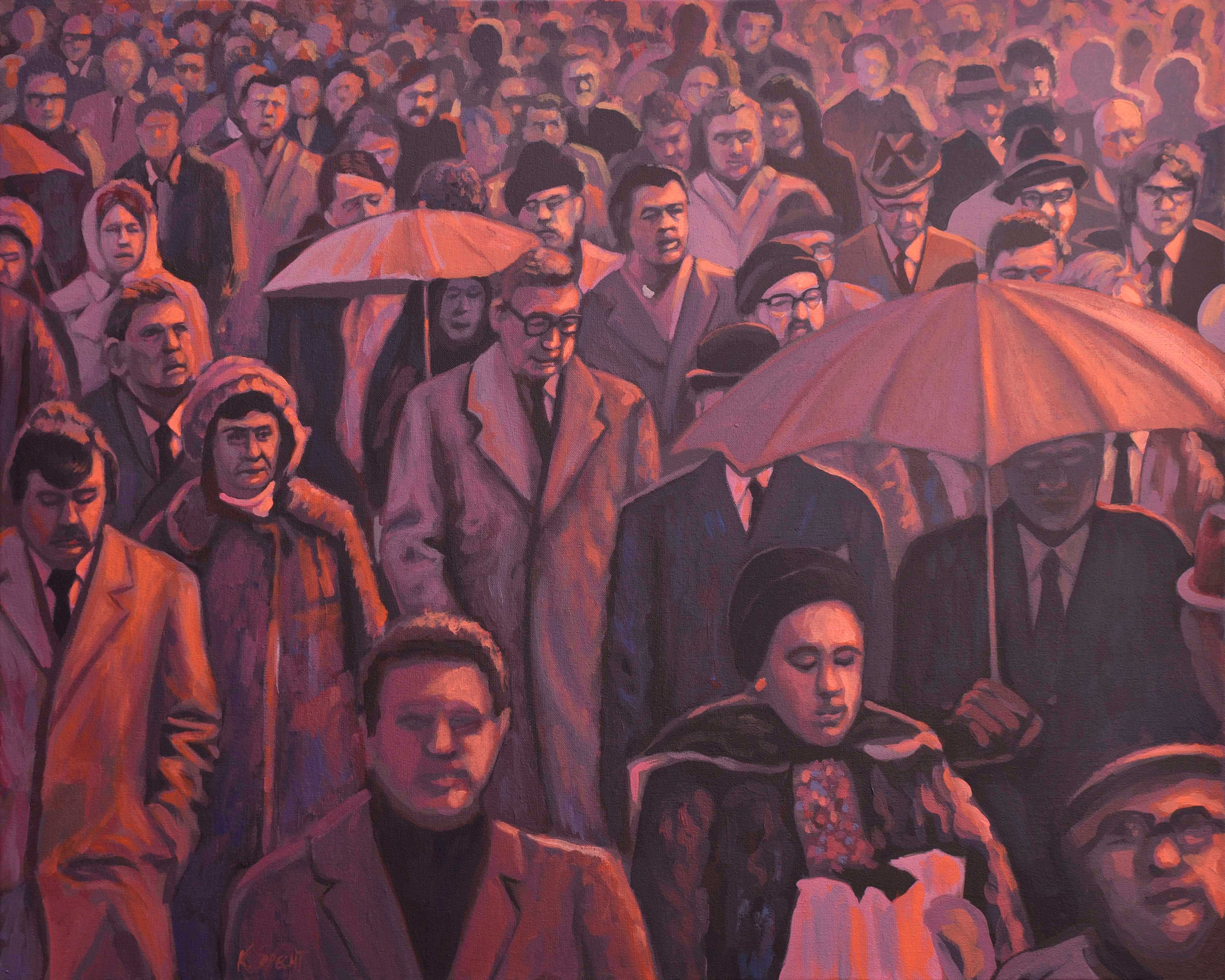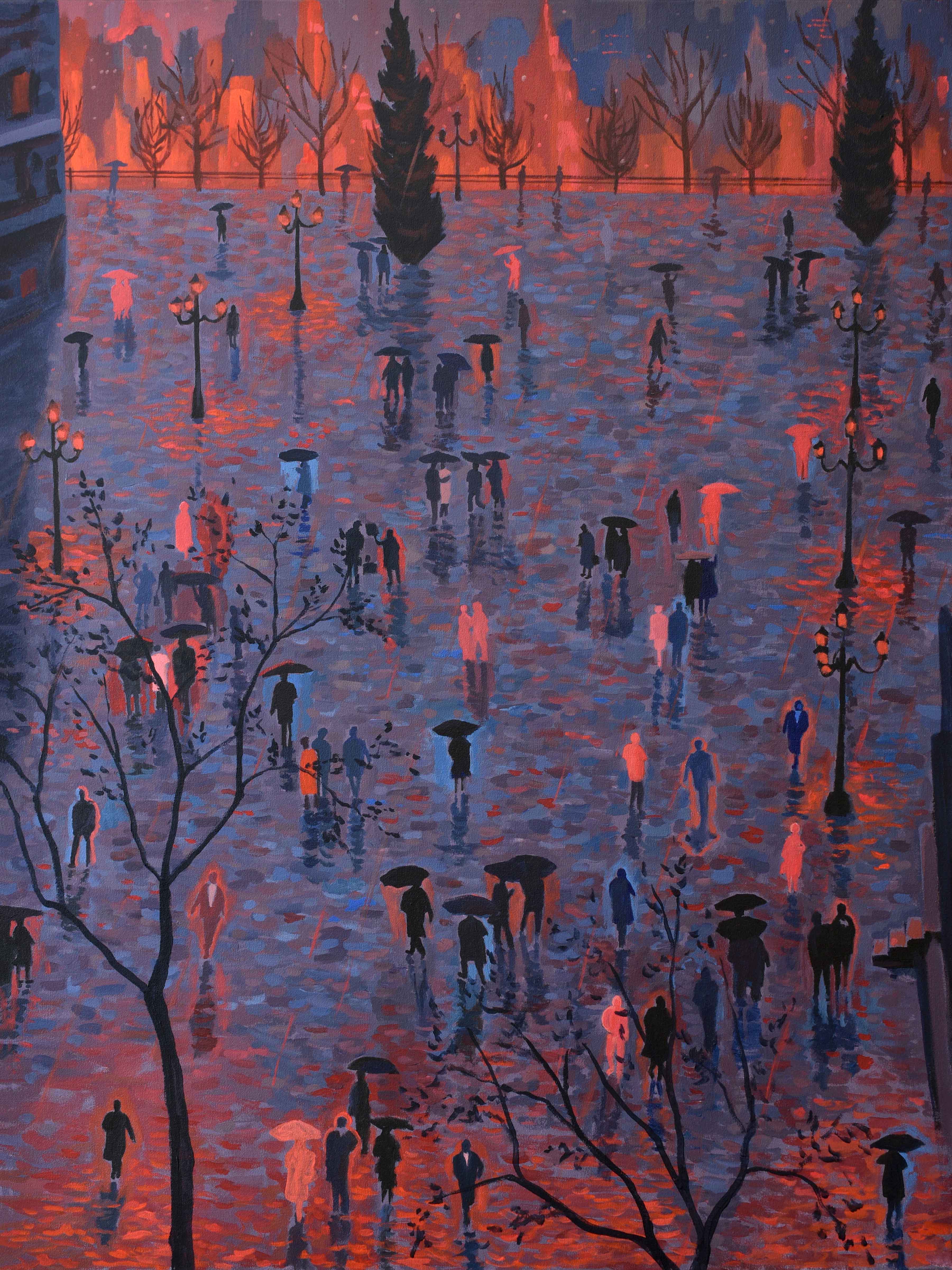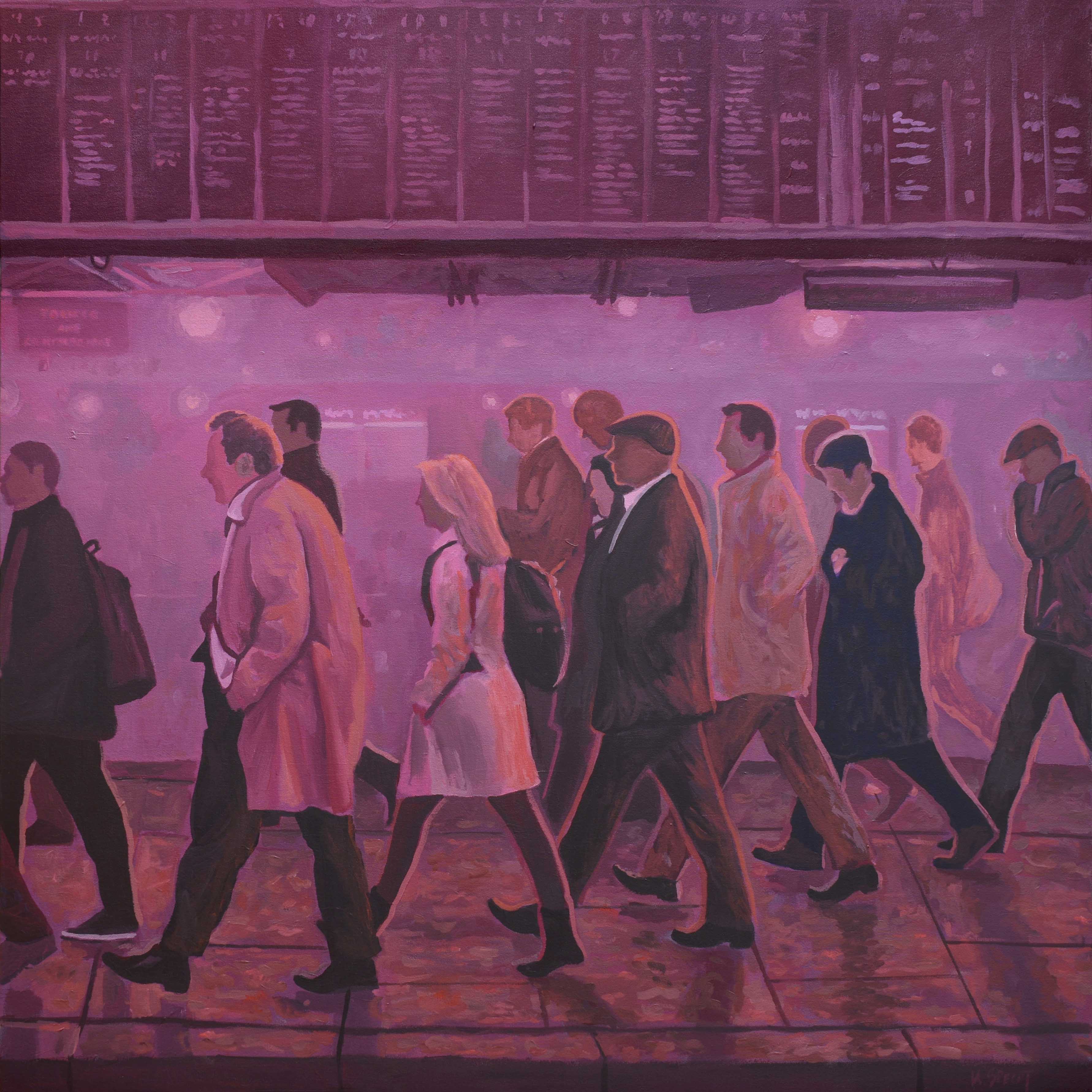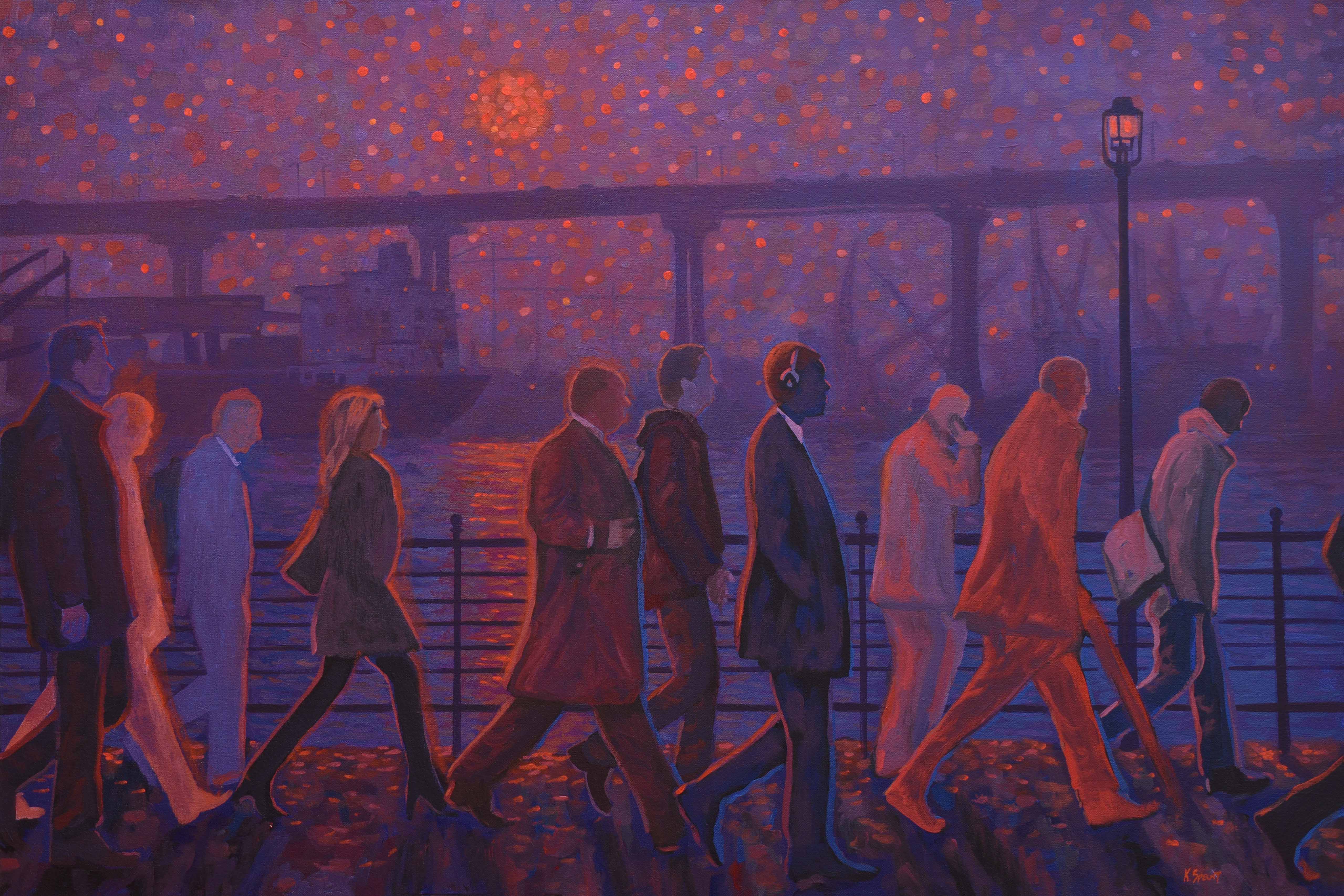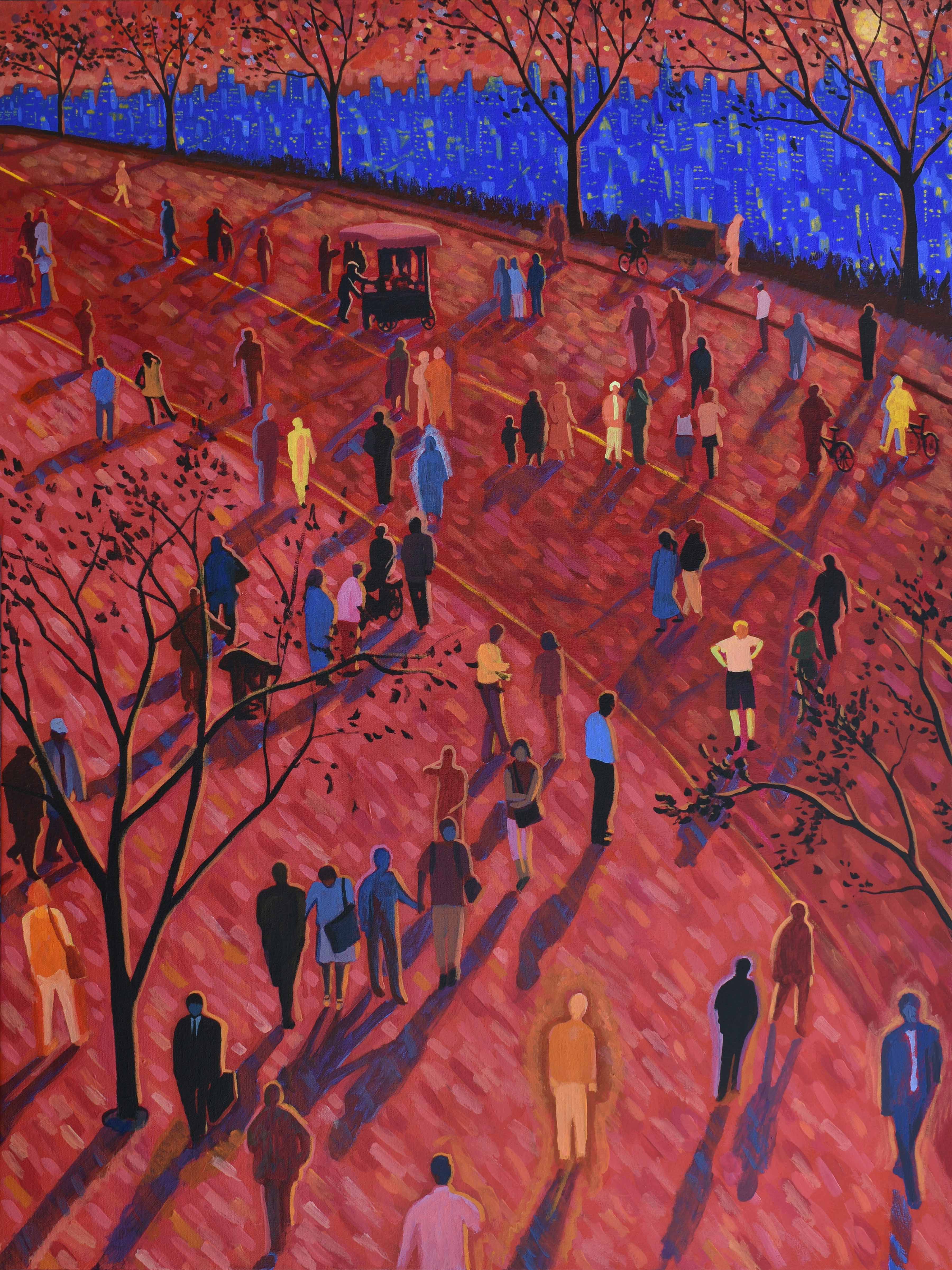 There’s an eerie beauty to Kevin Specht’s paintings of commuters filing to and from work. The figures, familiar and mysterious, pass through the shifting glow of dawn and dusk to shut out the light, and close themselves in their cubicles and offices. The walkers maintain a steady distance, with the studied loneliness of strangers who see each other every day, day after day. And yet there is a near-glow radiating from the figures and illuminating the space between them, suggesting the possibility of humanity and of connection.