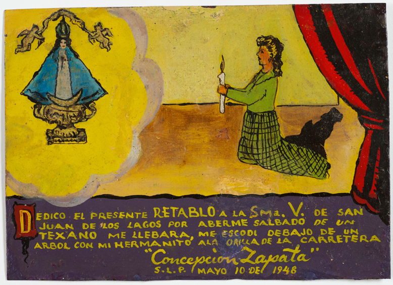 Retablo of Virginia Velázquez, mid-20th century. Thanks I give you little Virgin of San Juan de los Lagos for watching over me while crossing the Rio Grande with my four children. Virginia Velázquez. Houston, Texas
