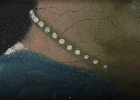 This was painted in about 1670, 40 to 50 years before the Watteau. Vermeer was a consummate artist. Everything about his work is exceptional, his compositions, which are subtle and restrained and his unique application of paint. Examined in close up, he looks as if he has dropped one pool of liquid colour upon another. If you want to see what I mean go the National Gallery website or the Google Arts and Culture page on this specific work. Here from the Google site is a close up of the pearl necklace she is wearing which shows the simple means whereby he created the 3 dimensional effect of the pearls: