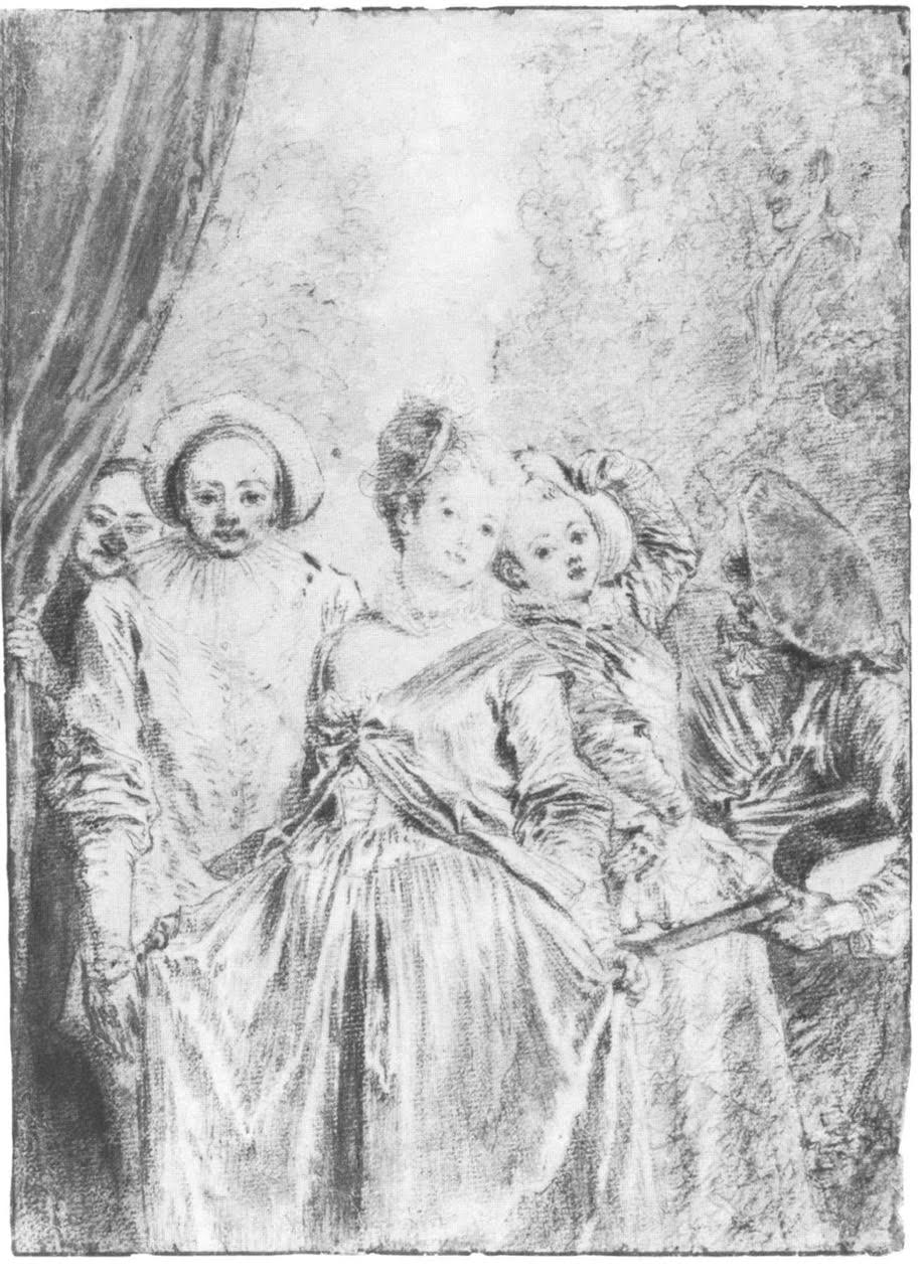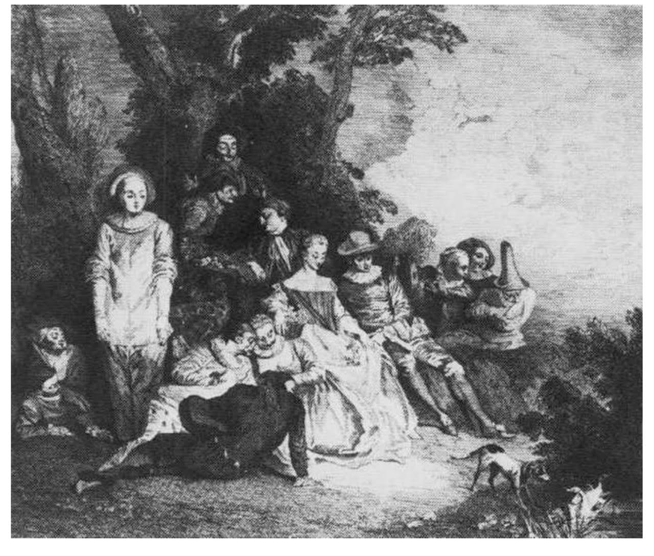 Watteau had a short life troubled by ill health. Like Vermeer he was a brilliant artist, who showed his gifts as painter and draughtsman of the clothed human figure in the style known as genre painting. I would like to concentrate on two preoccupations of subject matter that mark out Watteau’s work, the Fete Galante, which Watteau is credited with creating as an art form and secondly his obsession with the Commedia dell’arte or Comédie Italenne as it was performed in France. In concept they were diametrically opposed
