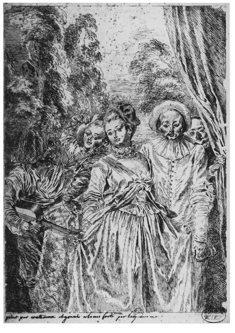 - The characters behind him have all been identified as members of the troupe- the Doctor with his donkey on the left, the lovers Léandre and Isabelle and the Captain on the right. Léandre appears to be wearing a coxcomb hat, which would tend to identify him as a vain and shallow man.