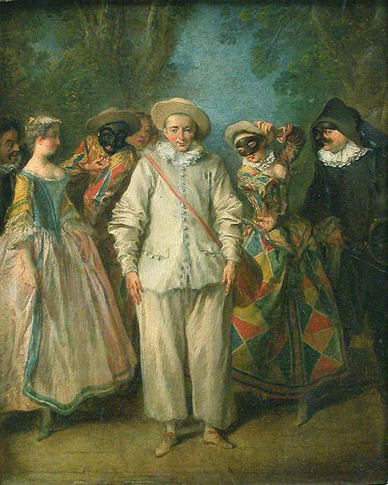 The Comédie Italienne however was a totally different kettle of fish. Bawdy, risque and low brow, and very popular with the public, this form of entertainment, in contrast to the Comédie Française, had by Watteau’s time been banned from mainstream theatres in Paris and was being performed in the streets and in fairgrounds on makeshift stages around the city, its appeal based more upon the movement and gestures of the players than upon learned dialogue. The plots varied but the characters were stock characters, many still well-known to us through film, music and modern art, such as Harlequin, Columbine and Pierrot.