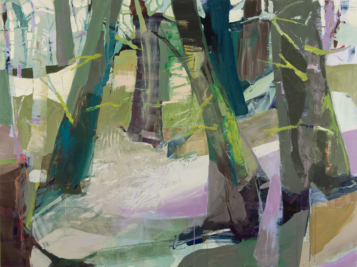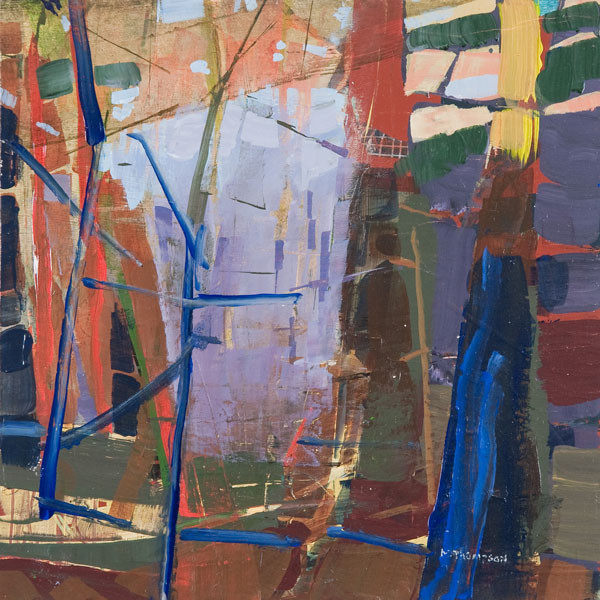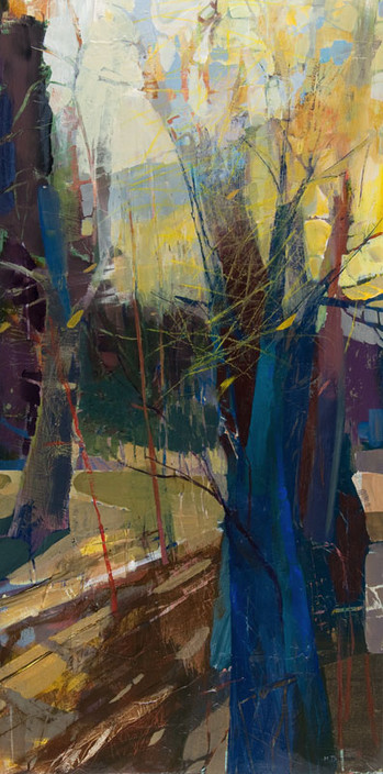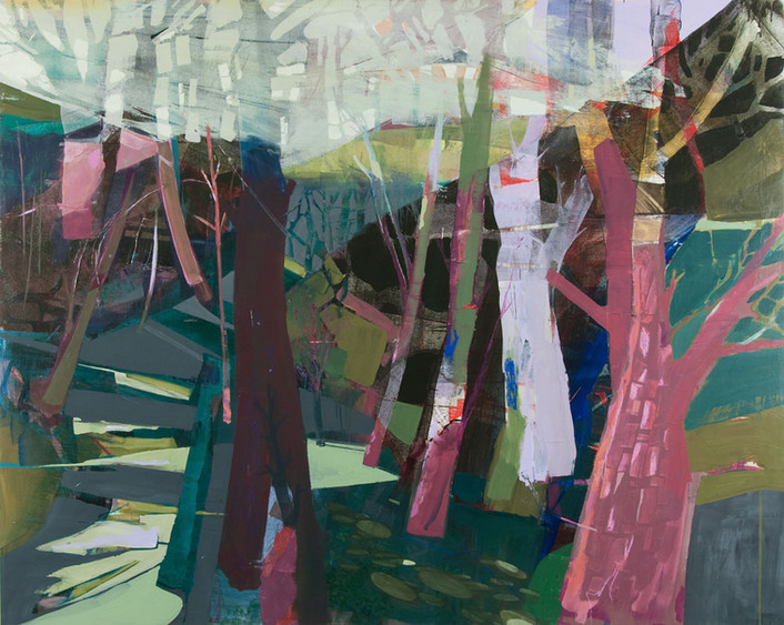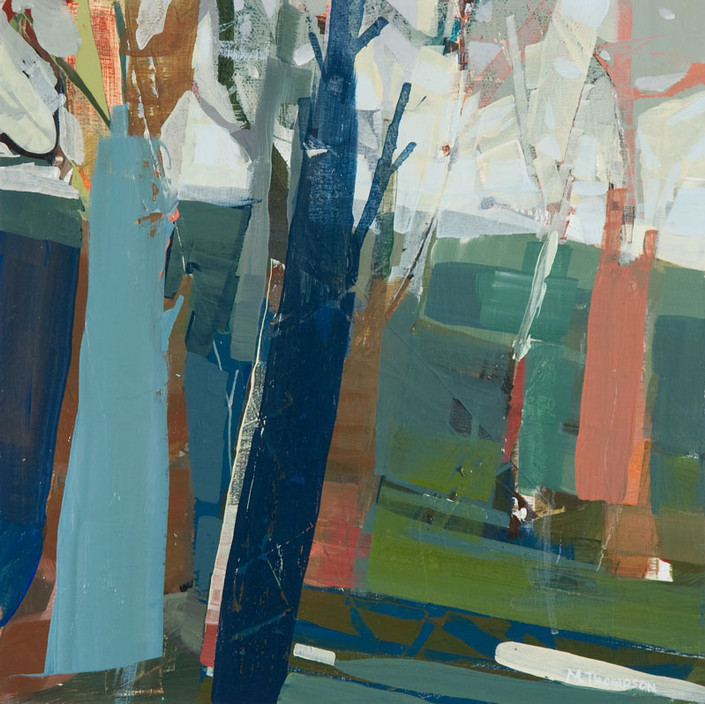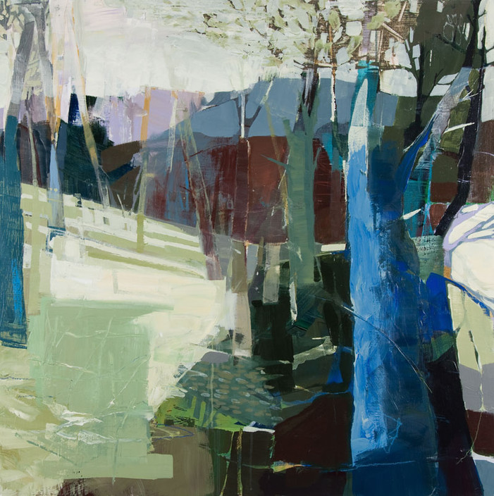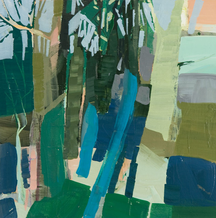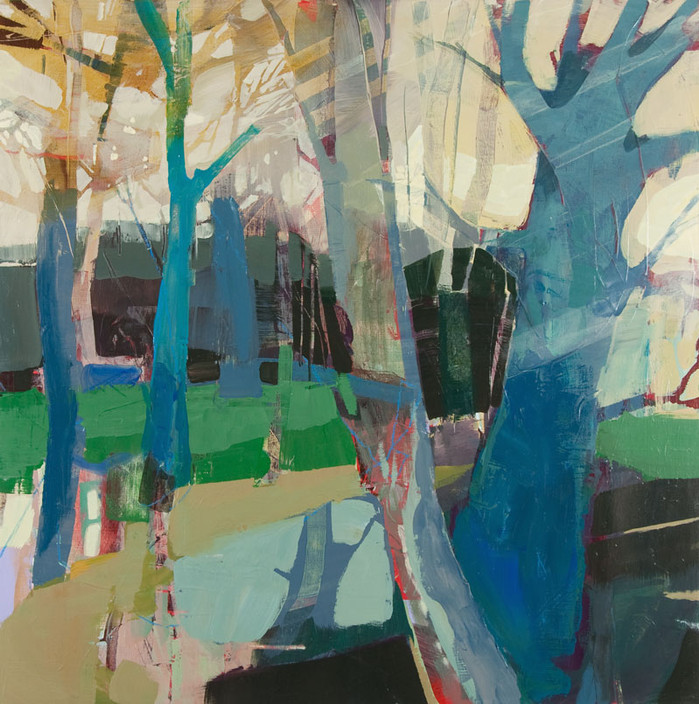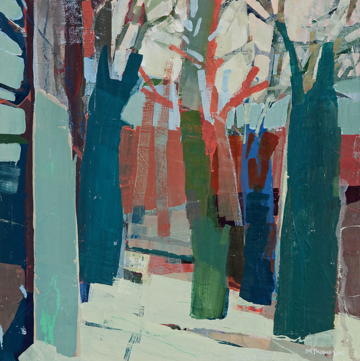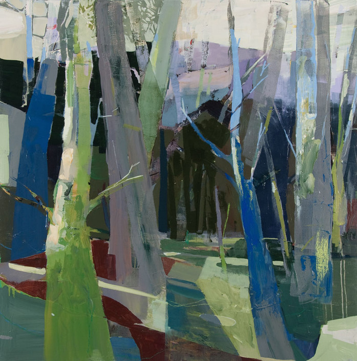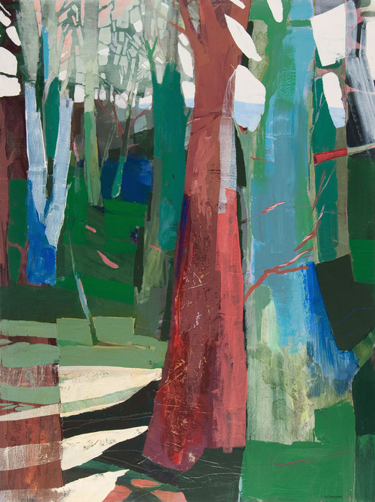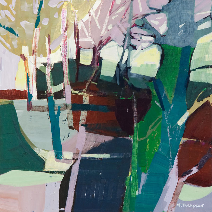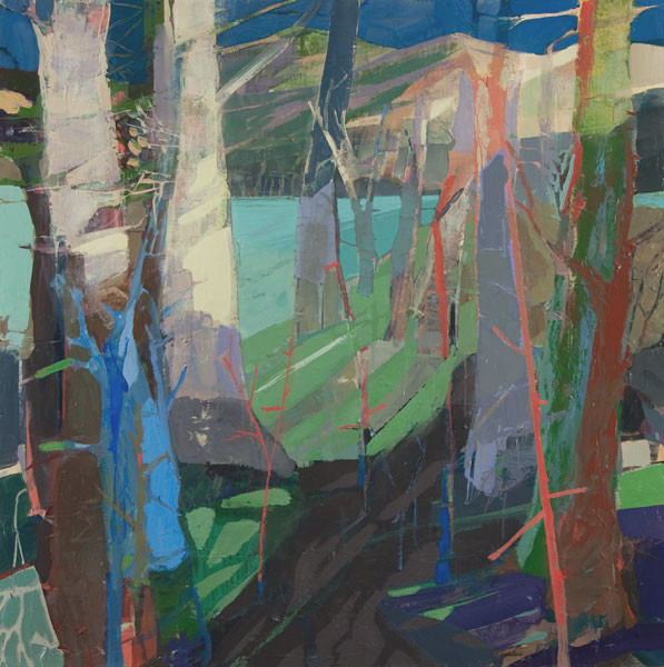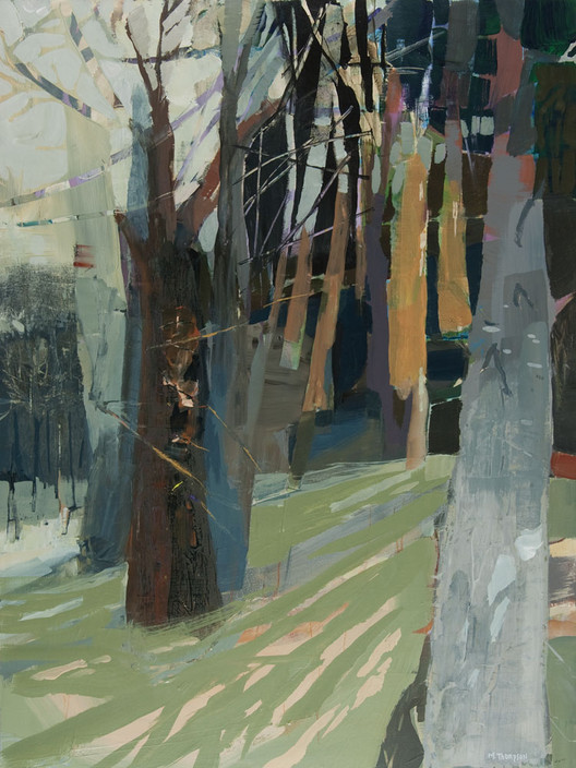 Marjorie Thompson’s paintings are full of shifting light and shadow; you can feel the warmth and coolness of them, as you can feel the texture of tree bark, moss, and the dappled air itself. The colors are moving on a different level, they resonate like musical chords, with true, ringing tones. Though Thompson works from her imagination, these feel like portraits, not just of certain beloved landscapes, but of specific moments spent in nature, of the birds you talked with, of the speaking scents of new growth and dead leaves, of the way the hour of the day and the season of the year hit you with their surprising inevitable force.