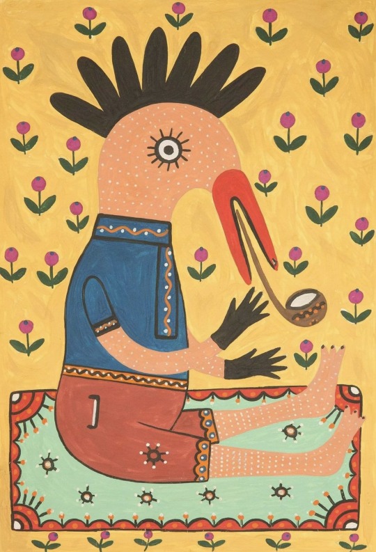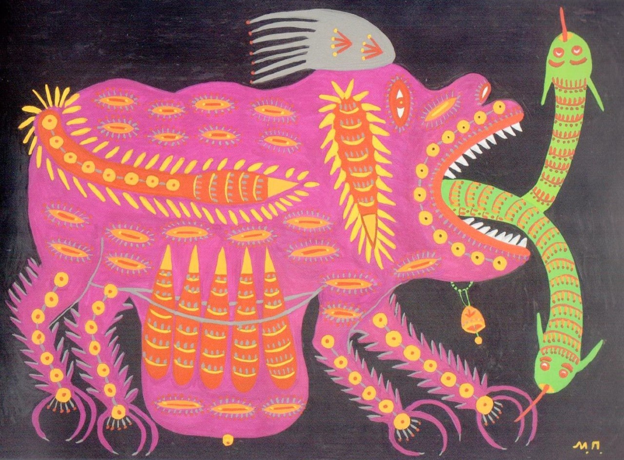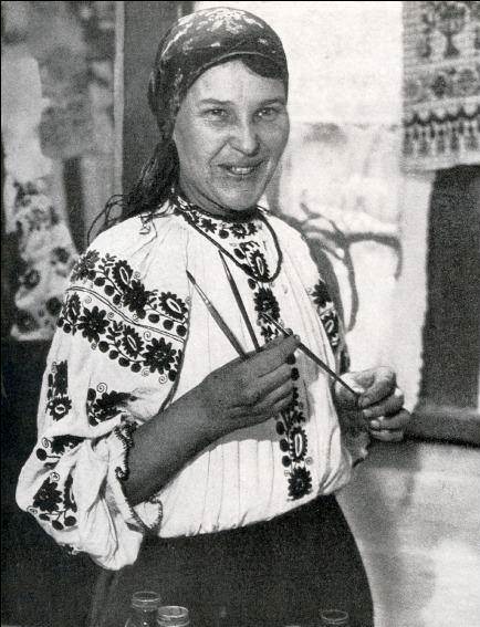Prymachenko began her career as an artist by tracing figures in sand “Once, as a young girl, I was tending a gaggle of geese. When I got with them to a sandy beach, on the bank of the river, after crossing a field dotted with wild flowers, I began to draw real and imaginary flowers with a stick on the sand… Later, I decided to paint the walls of my house using natural pigments. After that I’ve never stopped drawing and painting.” Her mother taught her embroidery, and when her skill was recognized, she was invited to work at the Central Experimental Workshop of the Kyiv Museum of Ukrainian Art in 1935. She went on to draw and paint, first in clear thin water colors, but eventually in bold and tactile gouache.
