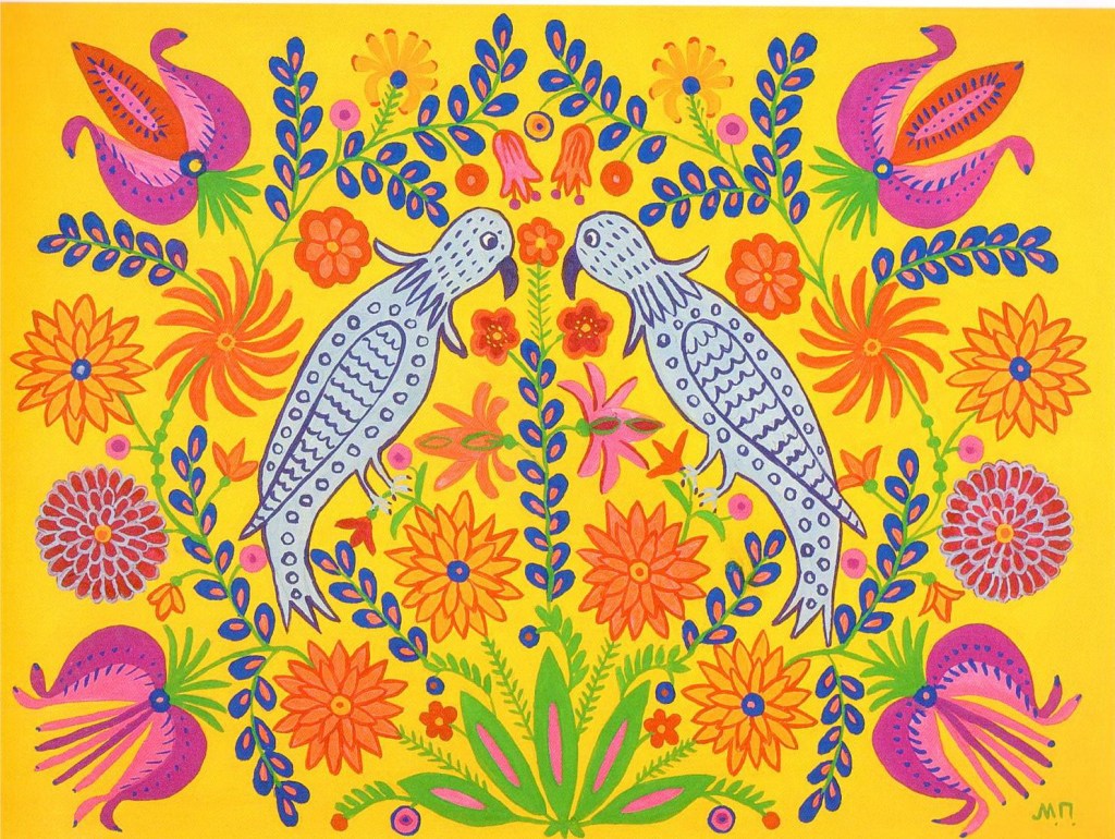 Prymachenko went on to have a successful career as an artist. She was appreciated, her voice was heard. She was awarded the Taras Shevchenko National Prize of Ukraine. She became a symbol of national pride and identity. Picasso said of her work, “I bow down before the artistic miracle of this brilliant Ukrainian.” But as the cycle of violence continues, during the current Russian invasion of Ukraine it is reported that a museum containing many of her works was burned to the ground. But it is also reported that a man risked his life to enter the burning building and save her paintings. The facts are blurred, frustrating, frightening, like so much news of the war.