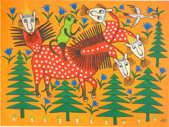 Prymachenko lived from 1909 to 1997, and her life’s story reads as a remarkable account of the atrocities of the century she lived through. As a girl she developed polio, which left her impaired. She lived through the Holodomor, Stalin’s concerted effort to starve Ukrainian peasants, in a man-made famine that killed millions of people. People turned to cannibalism to survive, feeding on the corpses of the dead. Her partner, the father of her son, and her brother were killed in World War II. Hitler invaded Ukraine, and began his campaign of mass murder, dumping the bodies of more than 30,000 Kiev jews in a mass grave in a ravine outside the city. Of course this is also the history of Ukraine itself–the struggle to hold onto their spirit, their identity, and their lives, in the face of the ruthless reckless pressure of the ambitions of evil men.