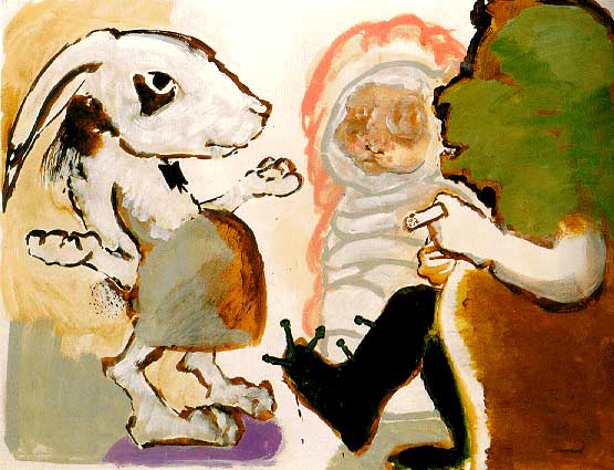 these unplanned pregnancies. She opted for these abortions because if not, she would have been forced to quit her studies and return to Portugal. She was steadfastly unwilling to give up her dreams of becoming an artist. Eventually Rego decided to keep the latest of Willing’s children and begrudgingly moved back to Portugal, having to face the judgement of her parents, especially her mother’s. Willing also made good on his threats and temporarily returned to his wife. Later, when Rego and Willing were married with several children, it was discovered that he was involved in multiple affairs. Once when she was painting, she went downstairs and found him kissing another woman, so she ran to the neighbour’s in tears. The neighbour, too, burst out crying because she had also slept with Willing. Rego told her son that after that she went back to the studio and painted in the lover as a “lewd monster with her tongue hanging out.” Rego was, apparently, both in love with and in awe of Willing while also being deeply hurt by him. He was frequently cruel and demanding, even unwilling to say that he loved her. In 1967 Willing was diagnosed with MS and Rego became his carer; over time his condition worsened until he became completely dependent on others for all aspects of care. This situation also created a strange shift in power within her marriage, a peculiar mingling of love and resentment. He passed away in 1988, after which Rego experienced a long and deep depression.