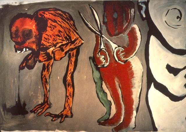 Of Paula Rego’s array of muses, the most potent seems to have been fury. An extremely fearful child (a disposition that she apparently contended with her entire life), she found therapeutic comfort in stories. Not soothing stories, mind you, but violent and terrifying tales through which she could exorcise her own anxieties. In one story from her childhood a woodcutter’s wife cuts off her own breasts, cooks them and serves them to the family when they run out of food, her husband sighs when he realizes the children must be eaten next. Rego used such fables as starting points for paintings and drawings throughout her career. She also explored the darker versions and interpretations of tales such as Snow White (Figure 1), Sleeping Beauty, Red Riding Hood and Pinocchio. While living with her grandmother as a child she was introduced to Portuguese folklore and later she was also influenced by philosophy, the work of other artists (such as Robert Mapplethorpe) (Figure 2), plays, novels and other fairy tales. She adopted these as ways of addressing larger issues, but also her personal dramas. What is so affecting in most of her work is the taut aggression expressed in them (Figure 3). It seems that while Rego experienced terror and bouts of depression, she was also extremely ambitious and career-driven; these disparate drives and temperaments gave rise to frustrated anger, but they also generated a wild productive fury in her.
