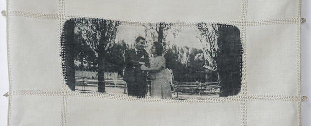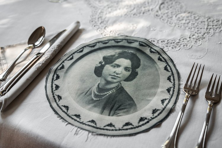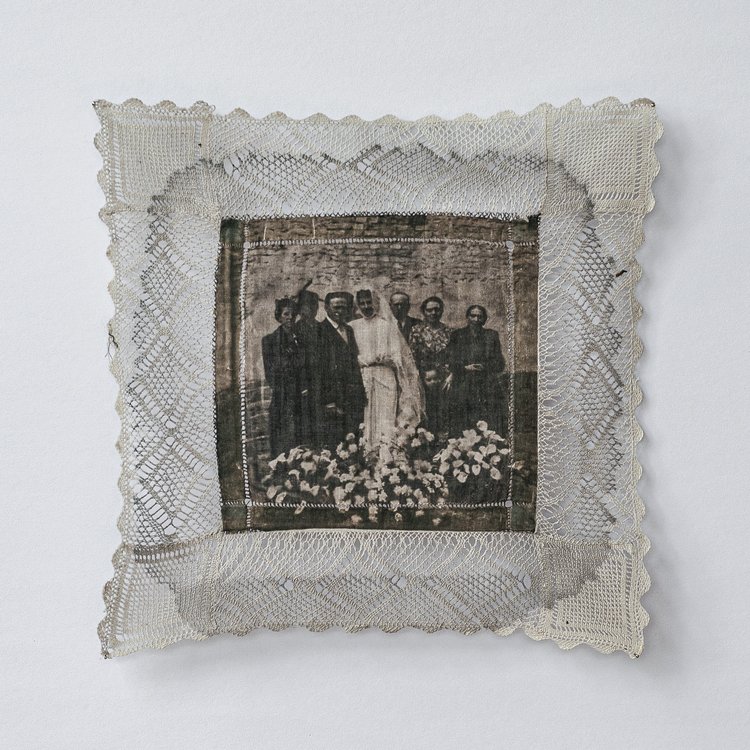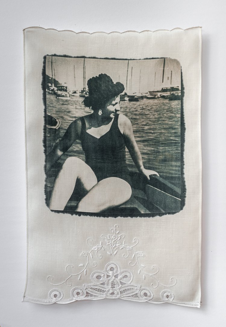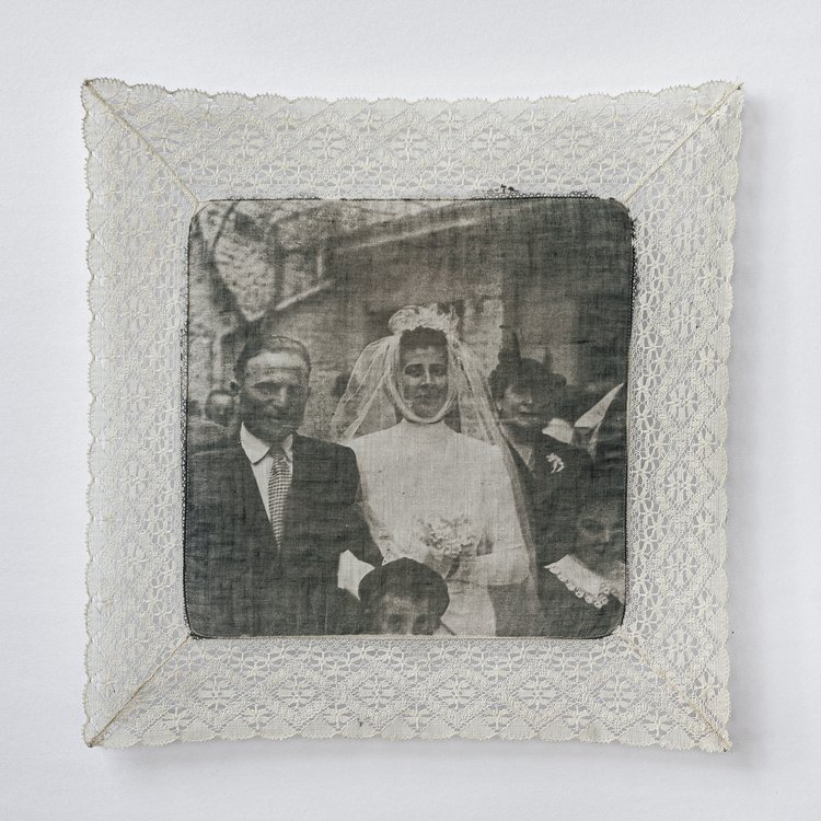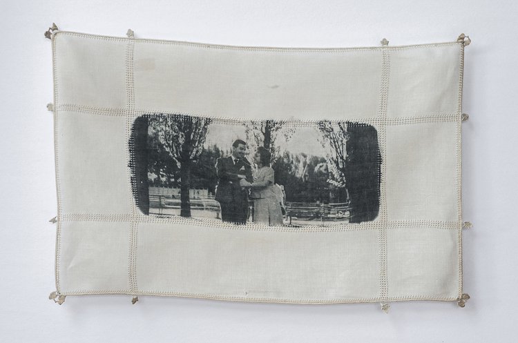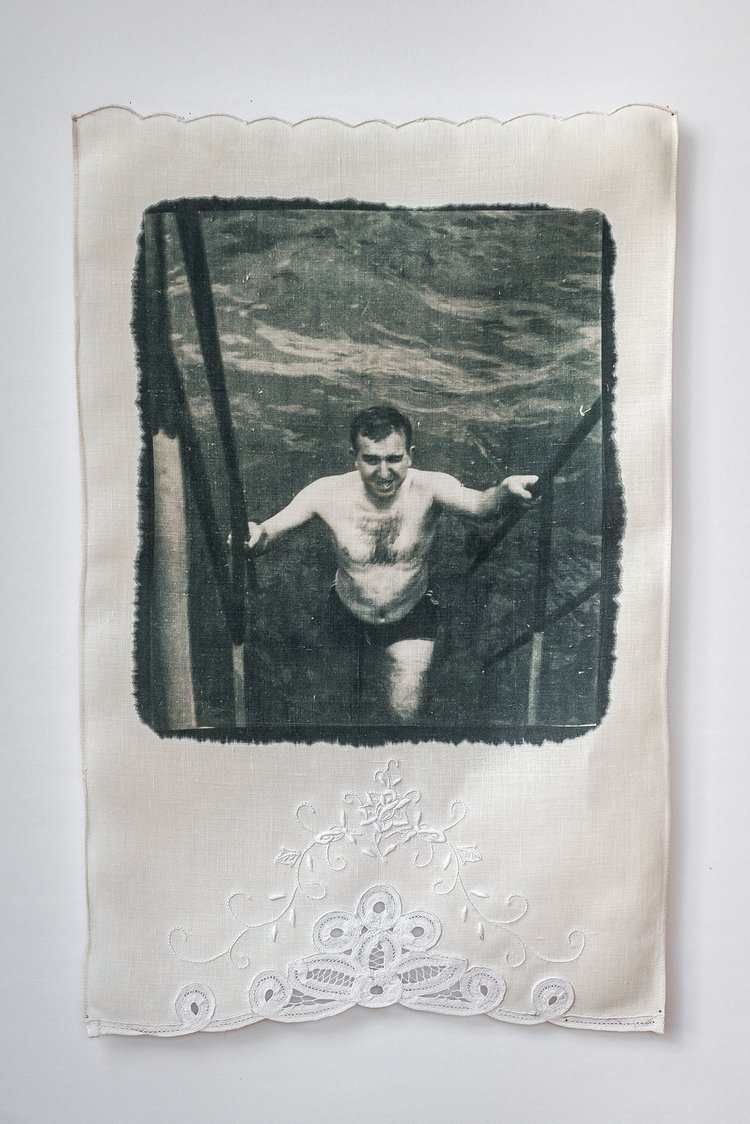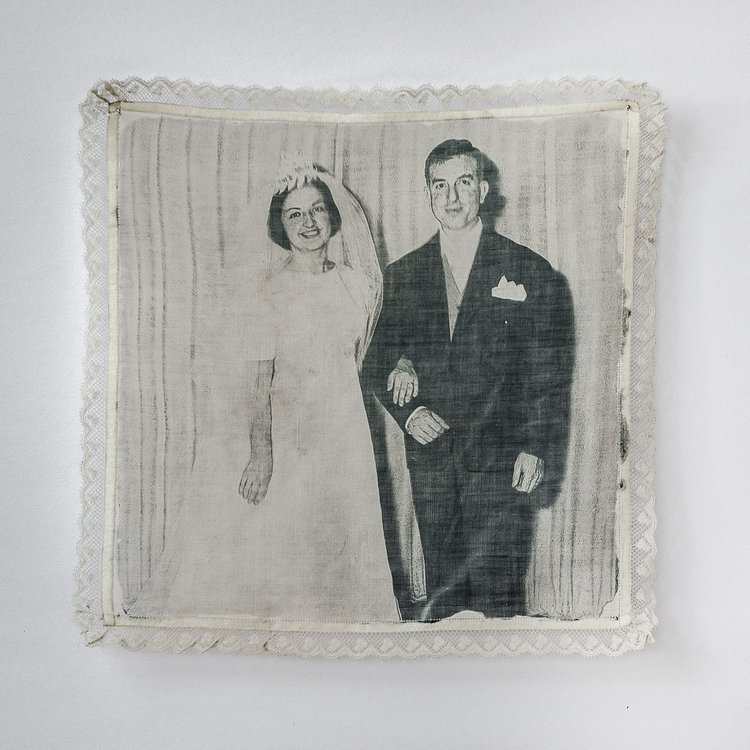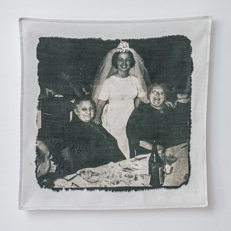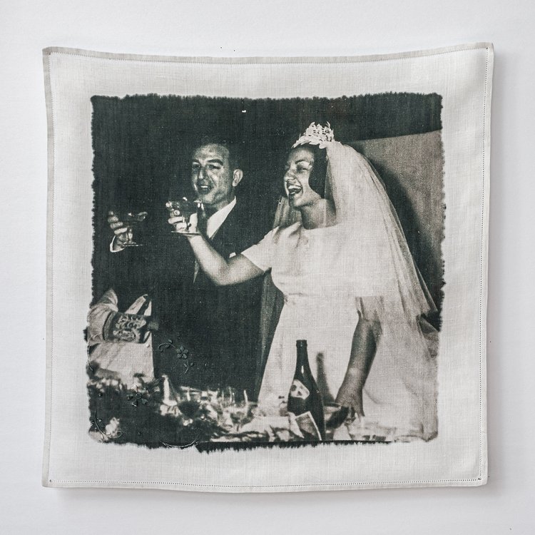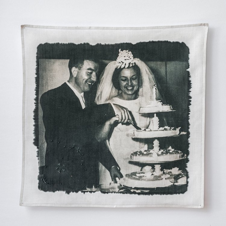 In the project The Dowry, images of my parents’ early years together are transferred to vintage textiles through the cyanotype process and further toned using natural dyes such as green tea, giving the images the sepia color of the original prints. Through this alchemy, the fabrics that were originally used in the course of family life acquire new meaning. Blending the materiality of the fabric with the ephemeral nature of memory, the dowry becomes the final inheritance after my parents’ passing.