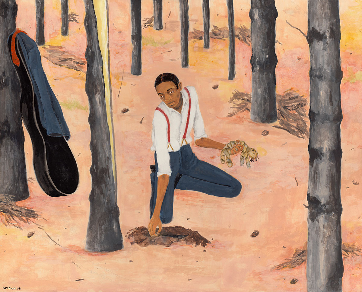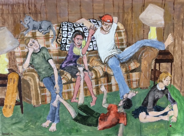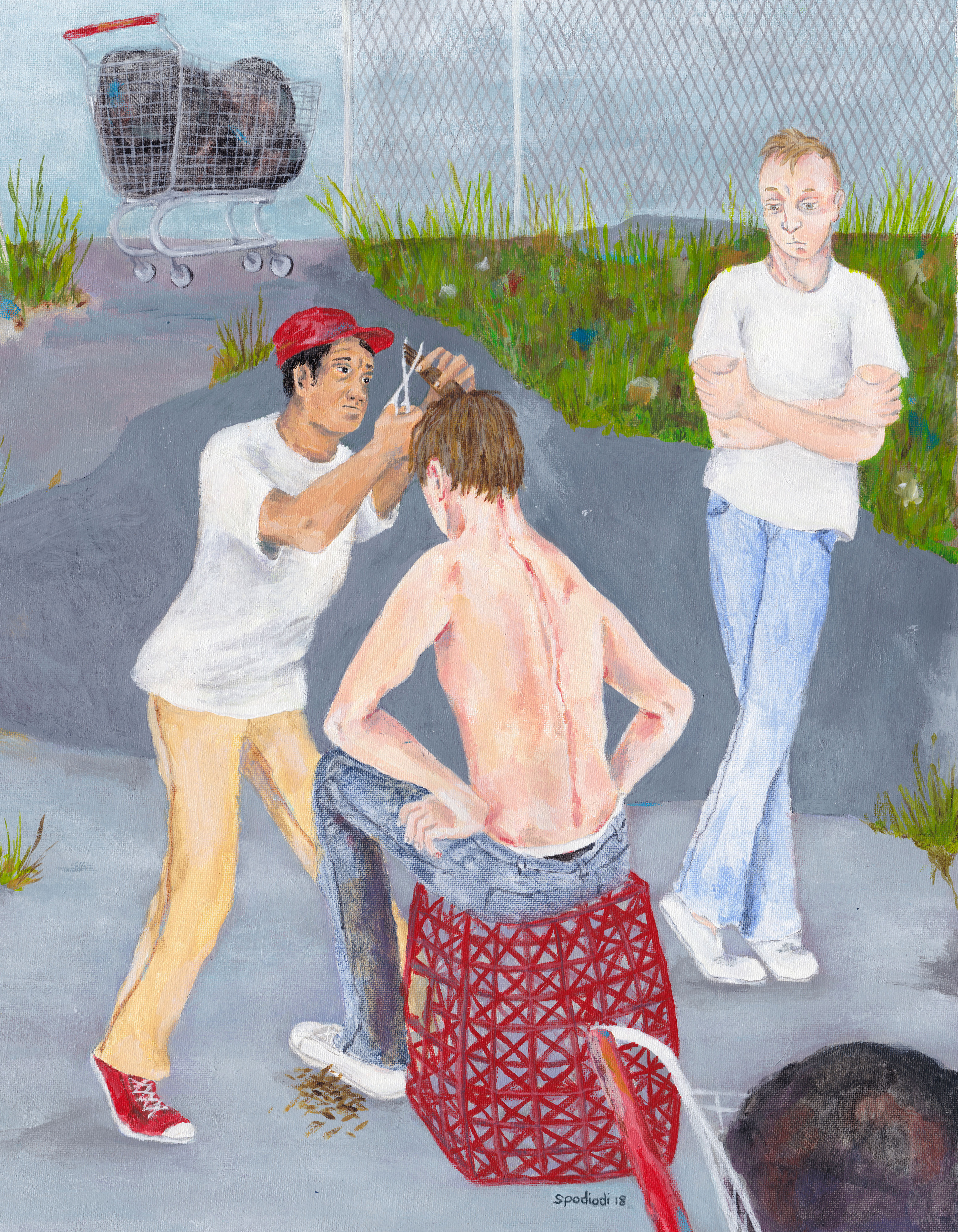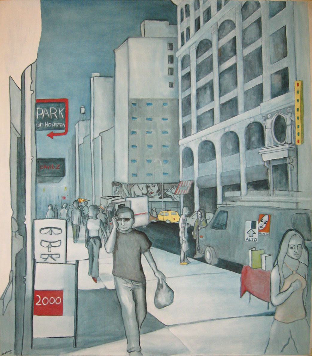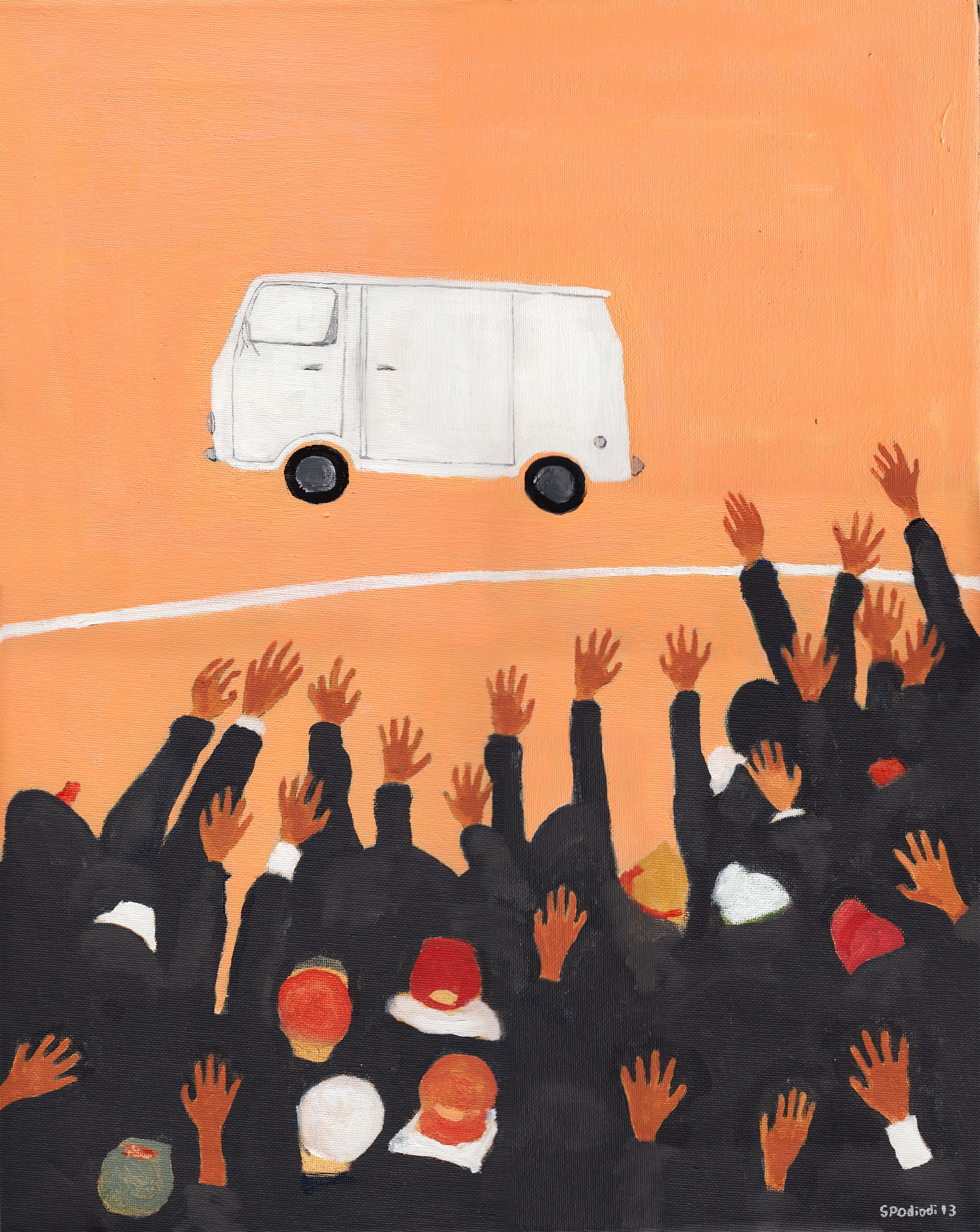 In the painting “White Van,” day laborers are competing for work that’s provided from whoever is in the white van, doing anything to be chosen to work that day. You never see whoever is in the white van––they are faceless, anonymous. Also faceless are the group of men competing for work. This just shows two anonymous forces, those that have and those that want.