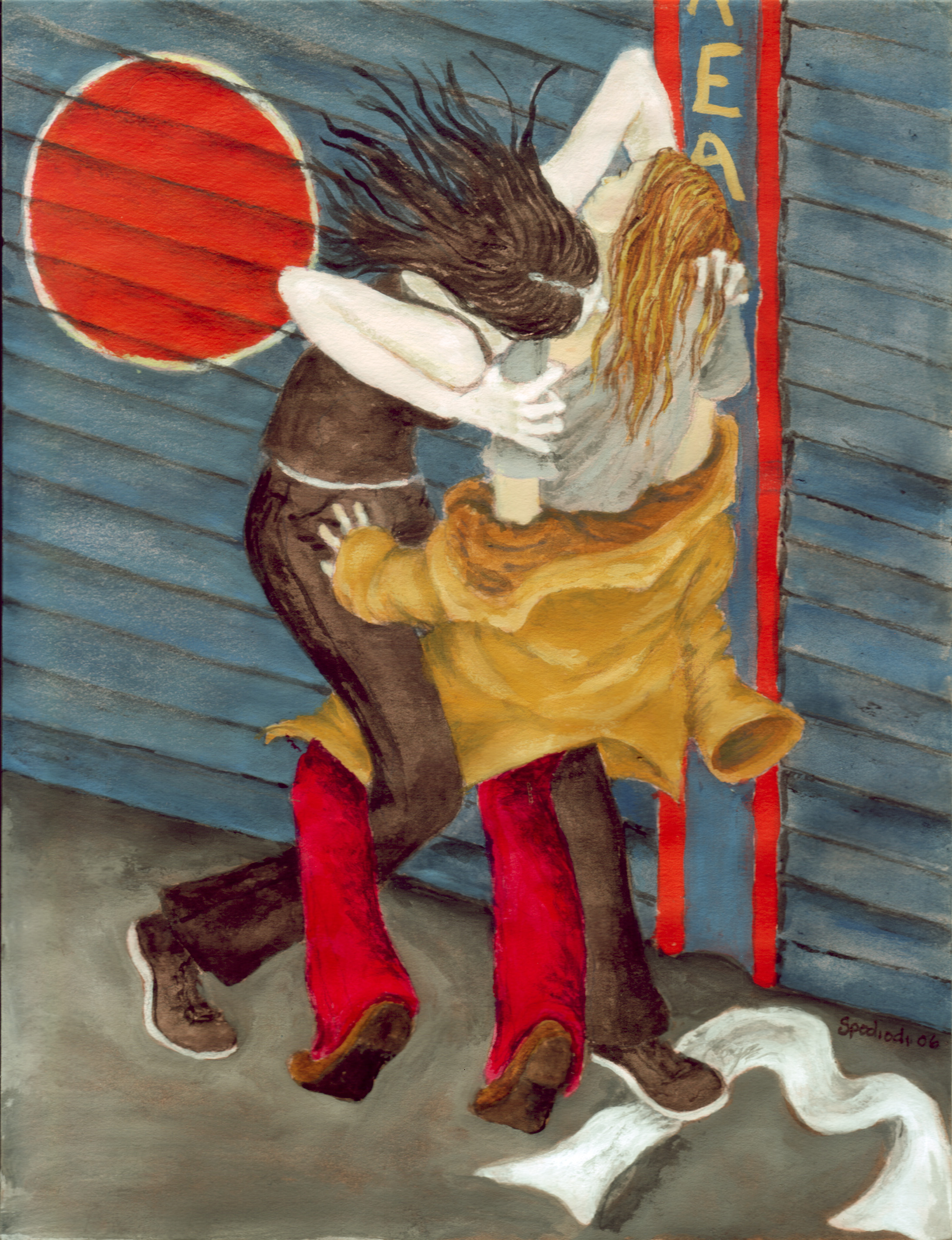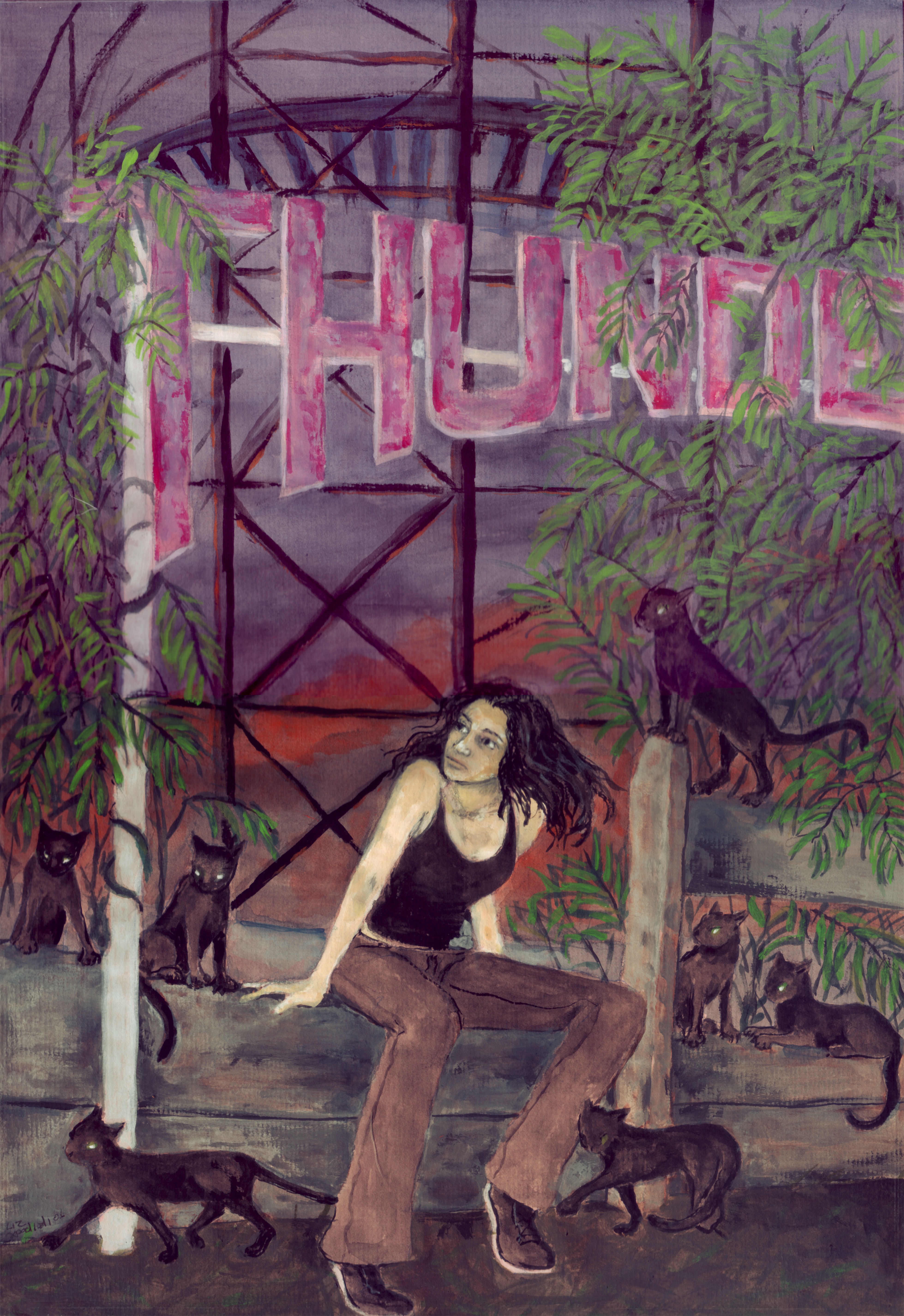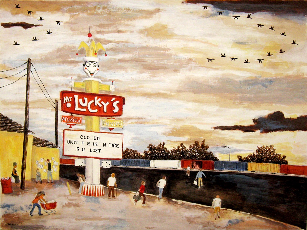 In “At Mr. Lucky’s, Heading South,” the joker sign is laughing. He’s scary, dwarfing the human travelers under him, promising but not delivering. I thought that these people were sort of nomads traveling to seek fortune elsewhere, relying on a kind of unreliable luck, the joker’s luck of America. The repurposed text in the picture, R U Lost, just emphasizes what these travelers have lost by not having a home or a place in the world, or even just being spiritually lost.