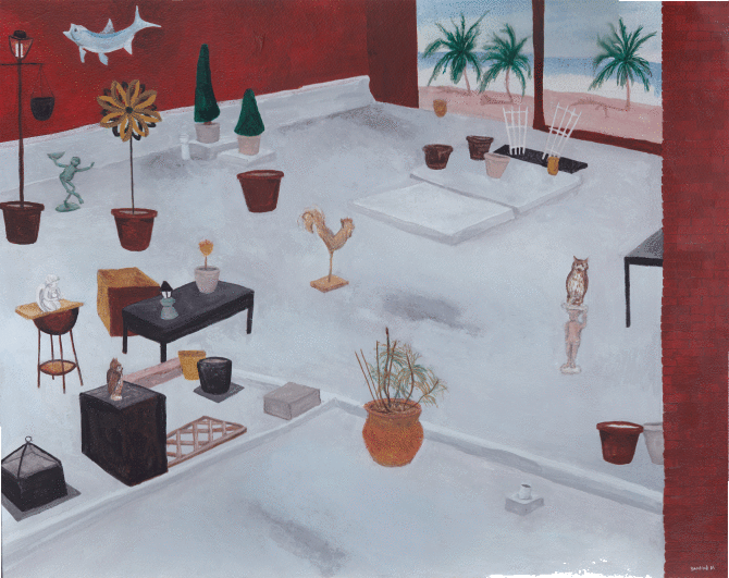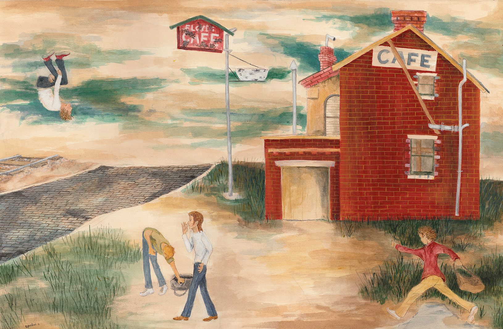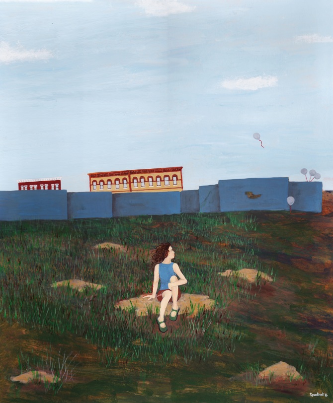 I also really love the wonky but perfect perspective and framing, as well as the depth of field, the sense that stories are unfolding in the distance or just out of our sight. There’s sometimes an in-between-place or in-between-time feeling in the worlds you create. How do you approach space in your work?