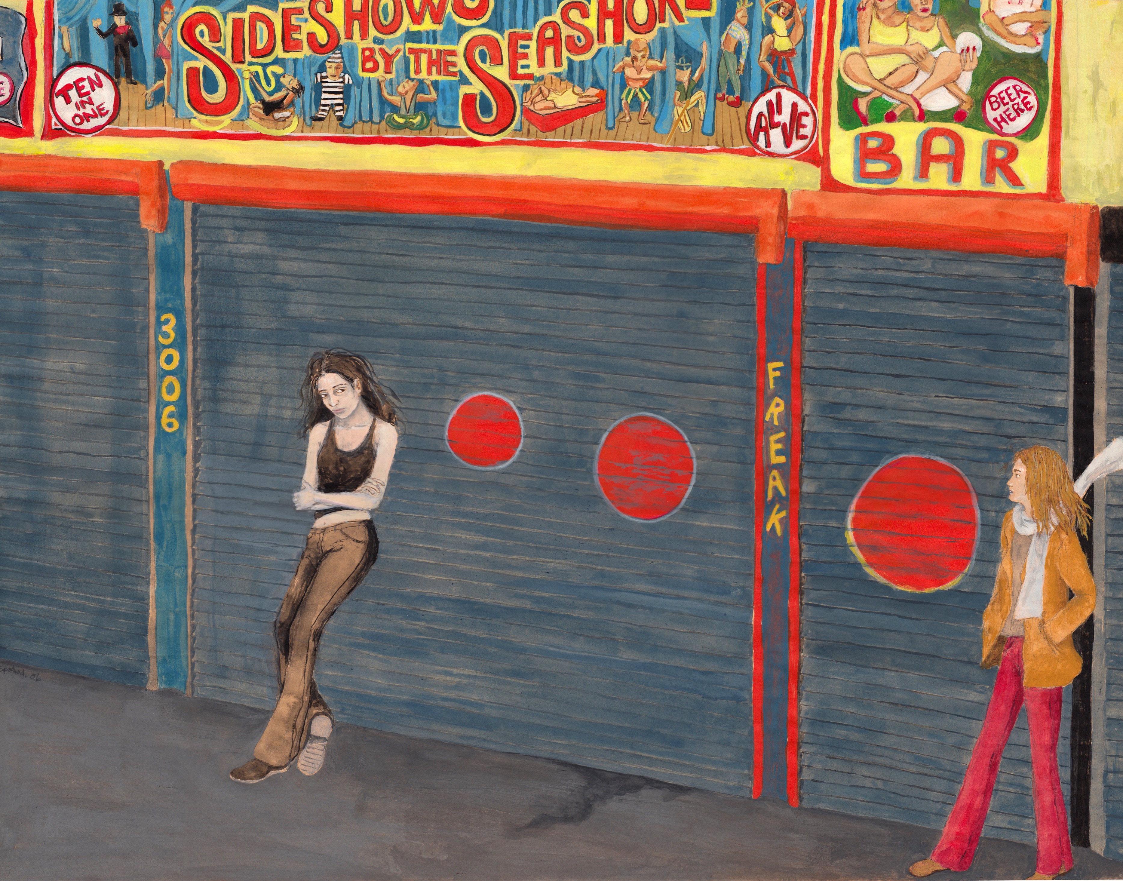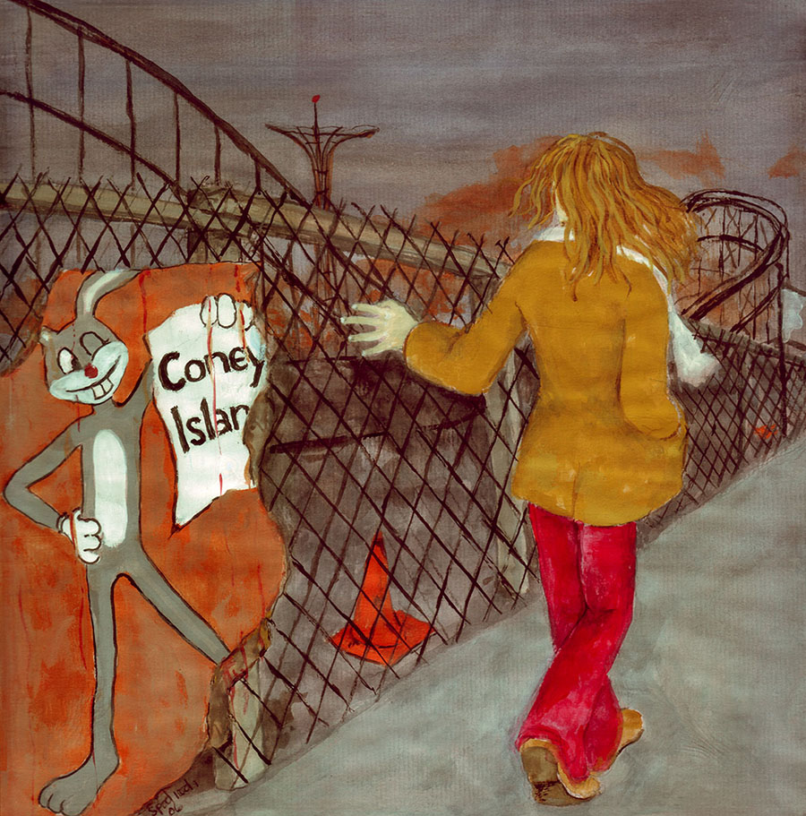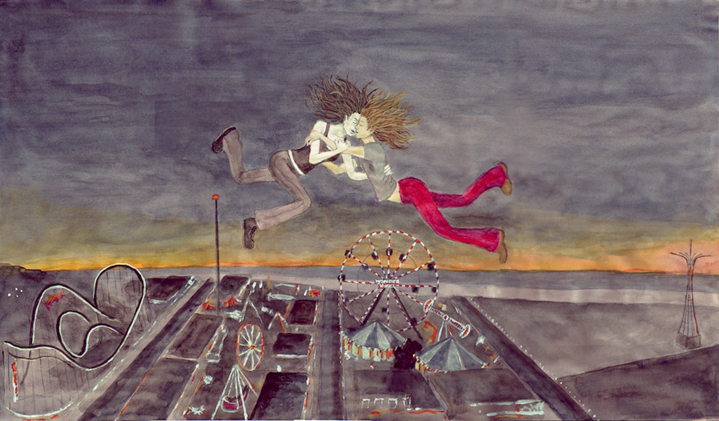 In the series “Coney Island 1-6,” I thought the six paintings should tell a story about attraction, and by acknowledging that attraction––a truth that was kept hidden inside, and perhaps was thought bad or wrong––that could possibly set one free. In mythology, a person’s ability to fly is a form of transcendence, escaping some kind of boundary or especially unpalatable situation. I like to think that the act of the two women flying means that we have power to overcome difficulties or problems going on in our lives, and become free of them.