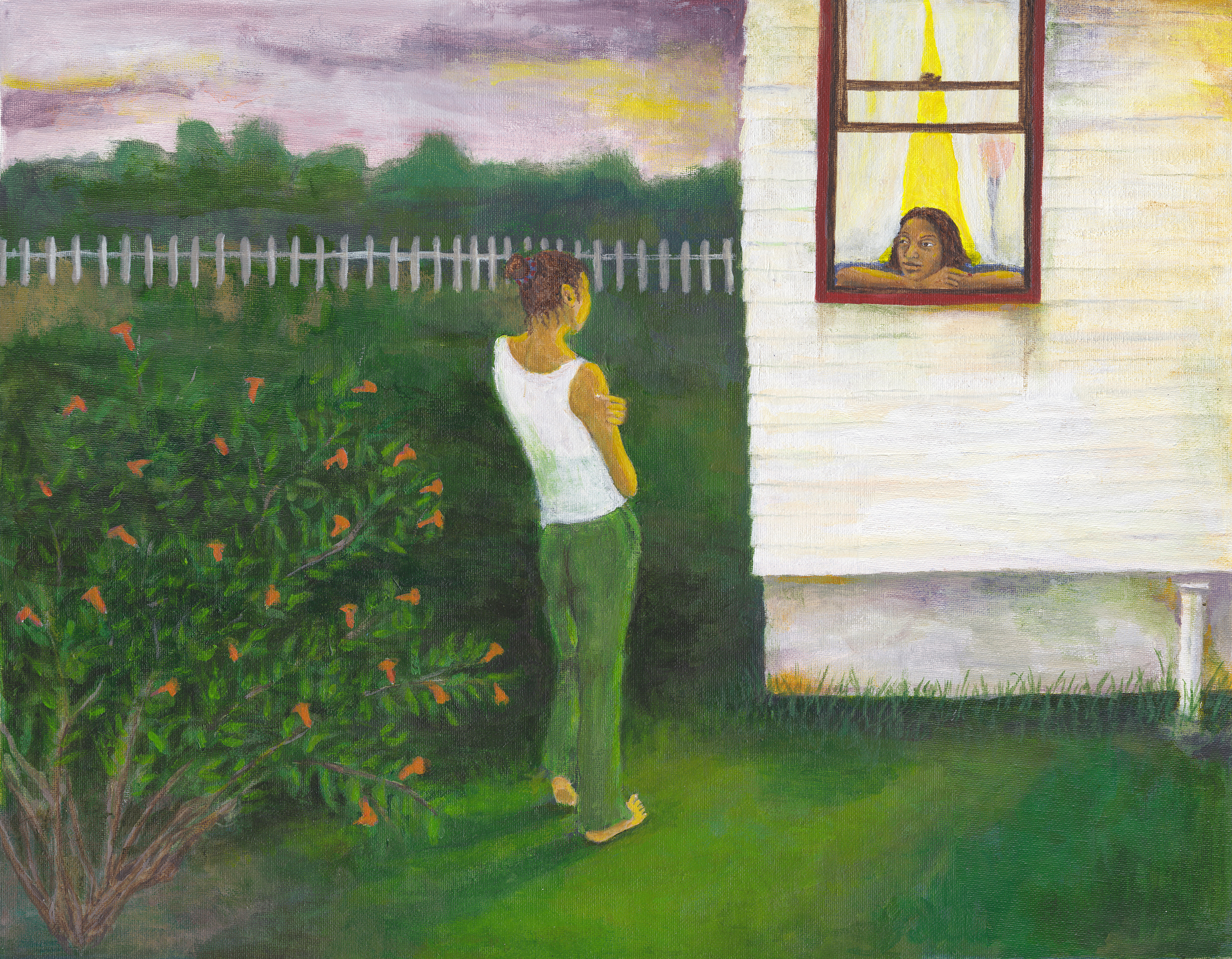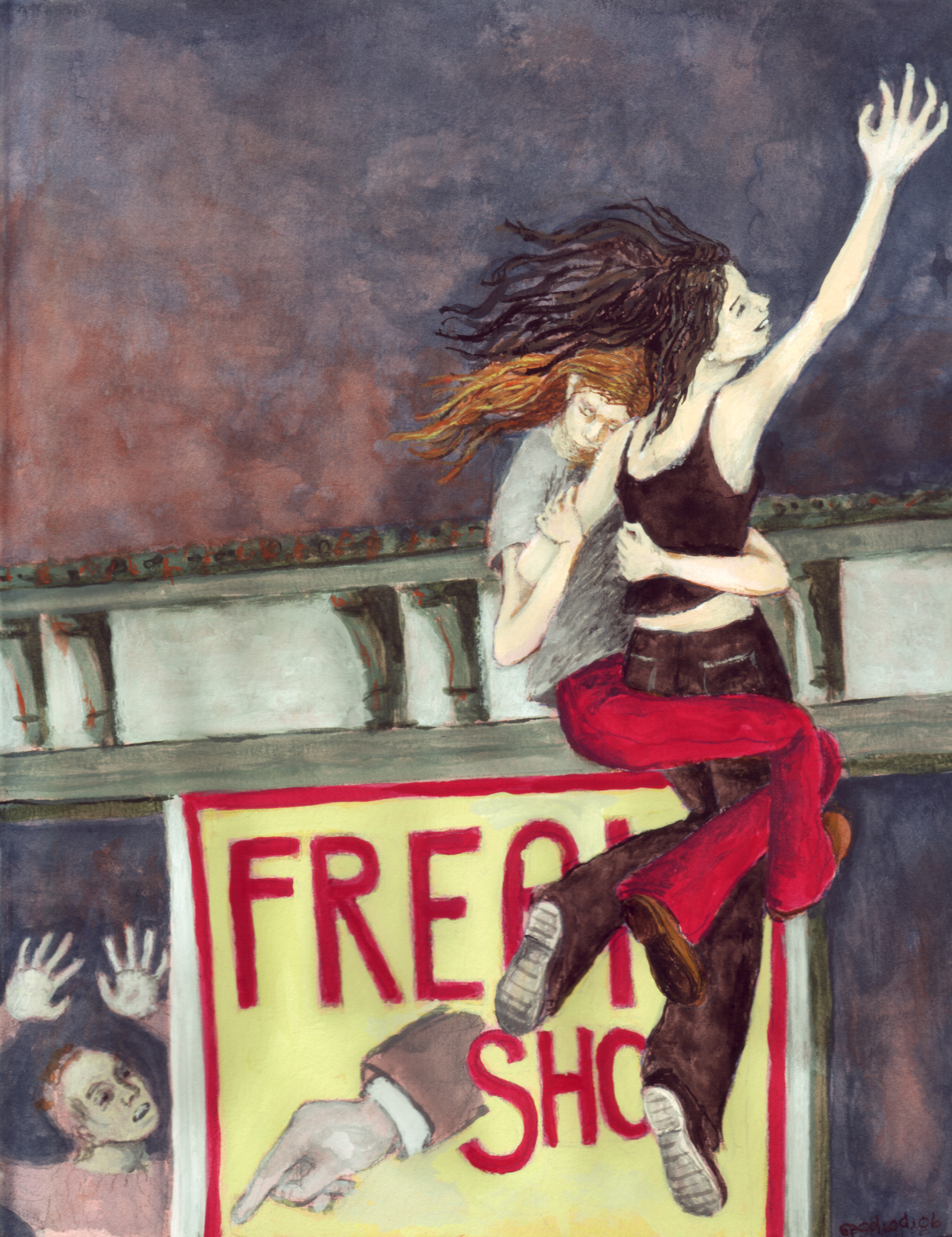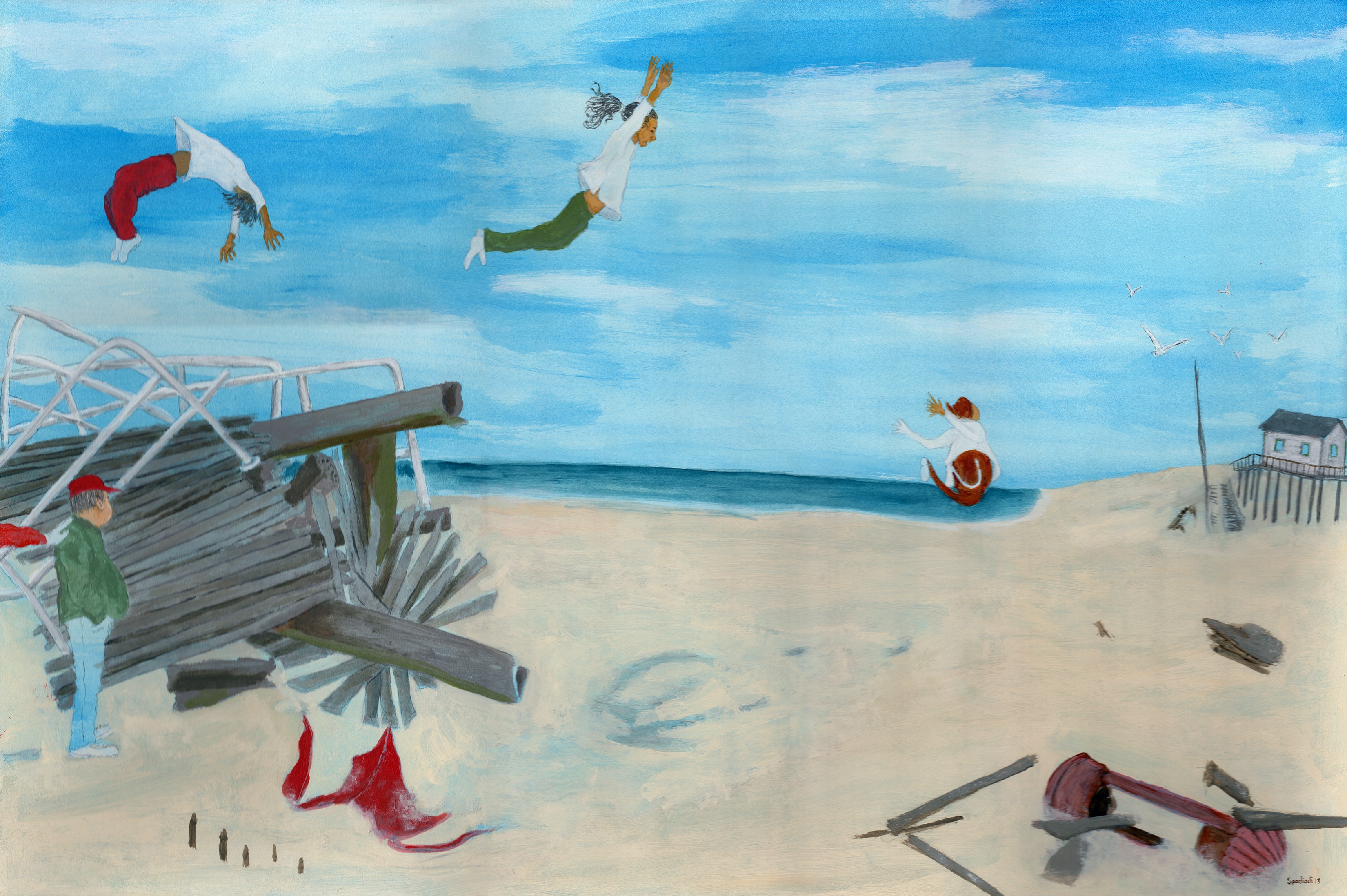 In the series “Coney Island 1-6,” I thought the six paintings should tell a story about attraction, and by acknowledging that attraction––a truth that was kept hidden inside, and perhaps was thought bad or wrong––that could possibly set one free. In mythology, a person’s ability to fly is a form of transcendence, escaping some kind of boundary or especially unpalatable situation. I like to think that the act of the two women flying means that we have power to overcome difficulties or problems going on in our lives, and become free of them.
