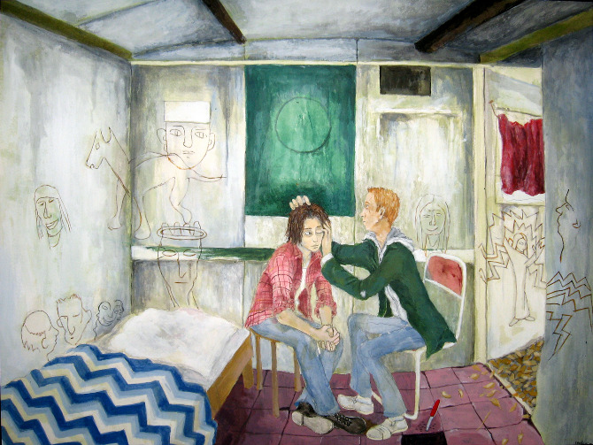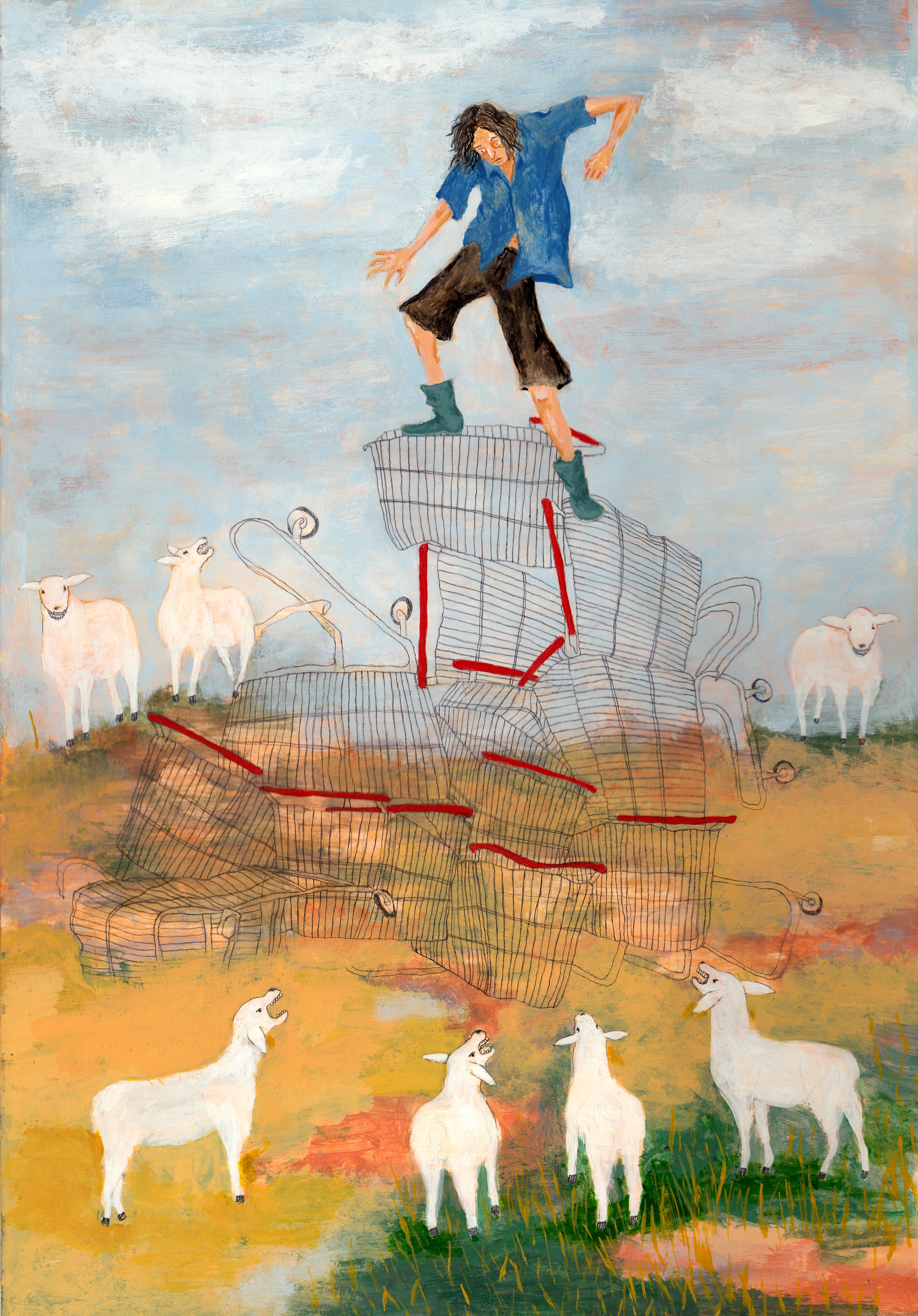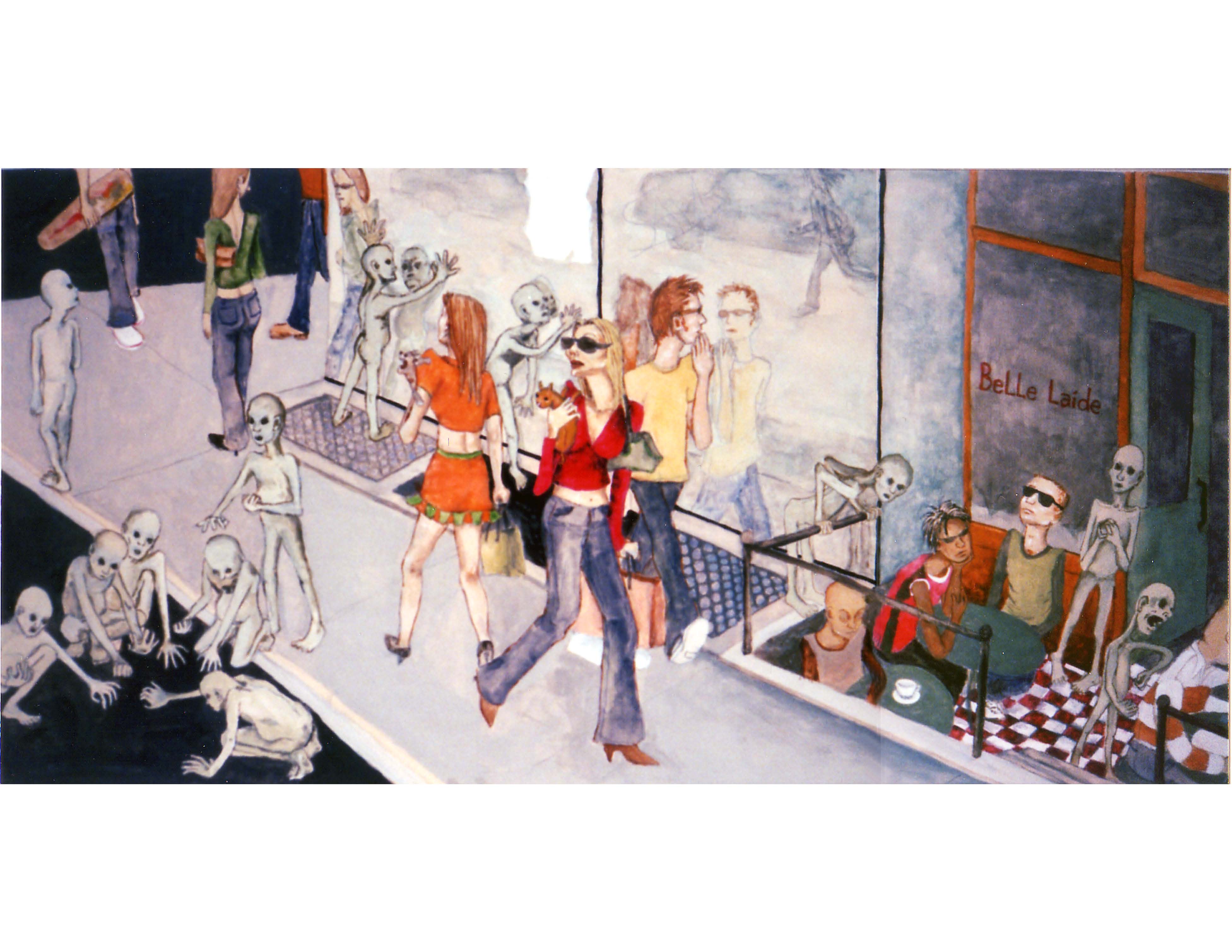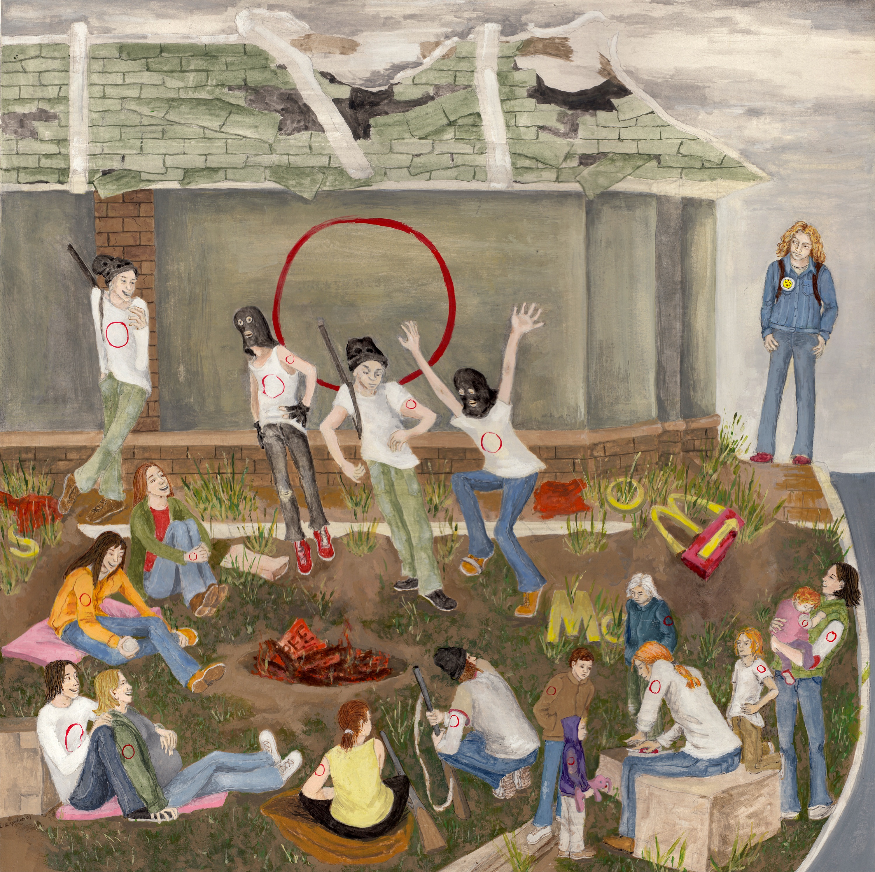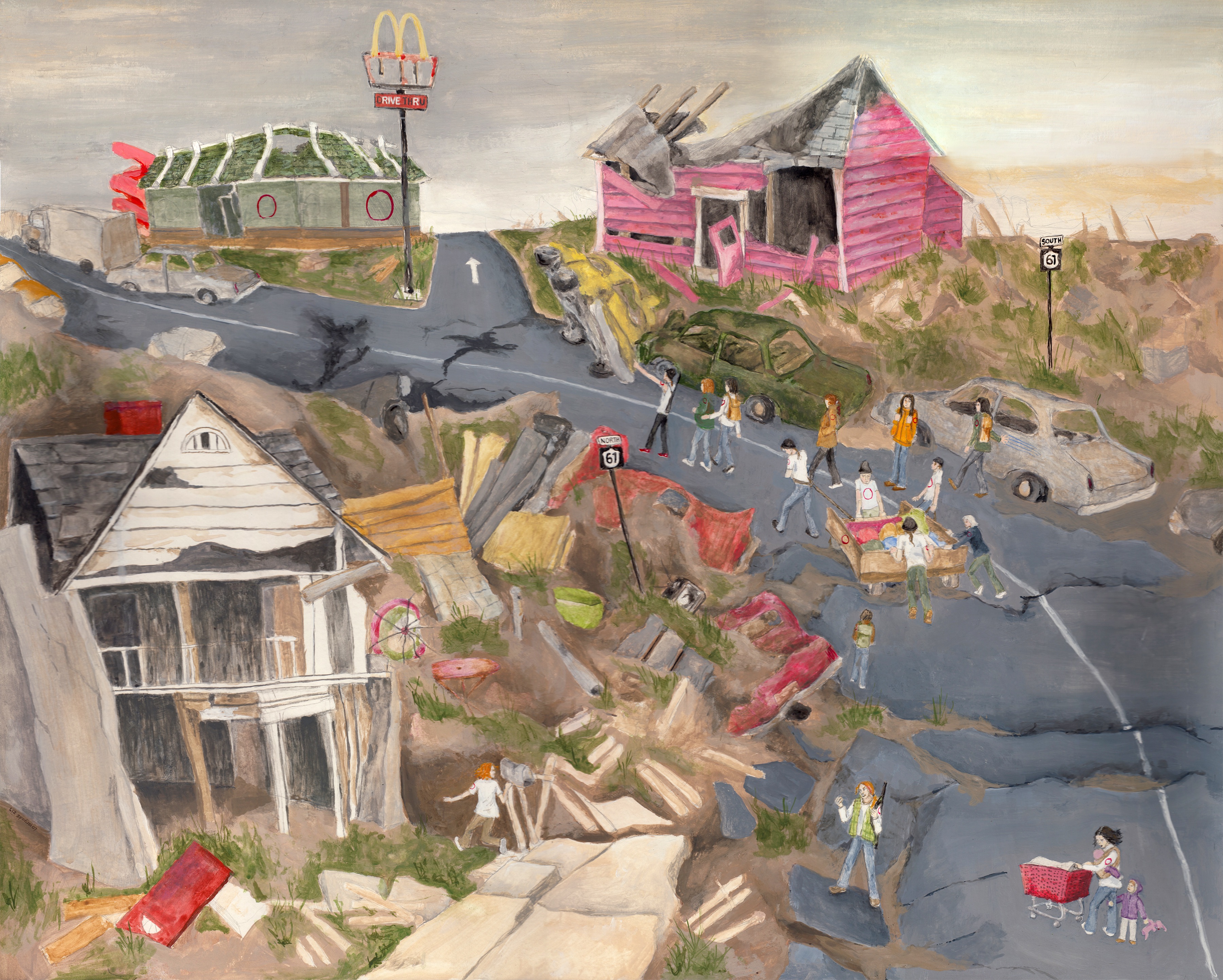 World Gone Wrong and ‘O’ are companion paintings. I was wondering what a post-apocalypse world would be like. What would be the good and bad of that kind of world? In the painting, it is many years after the apocalypse and people are together in some sort of a nomadic tribe called ‘O’. There are no restaurants, highways, or cars, and houses are destroyed or remain as curiosities. The destination, a former McDonalds, has been converted into a dwelling place or a way station.