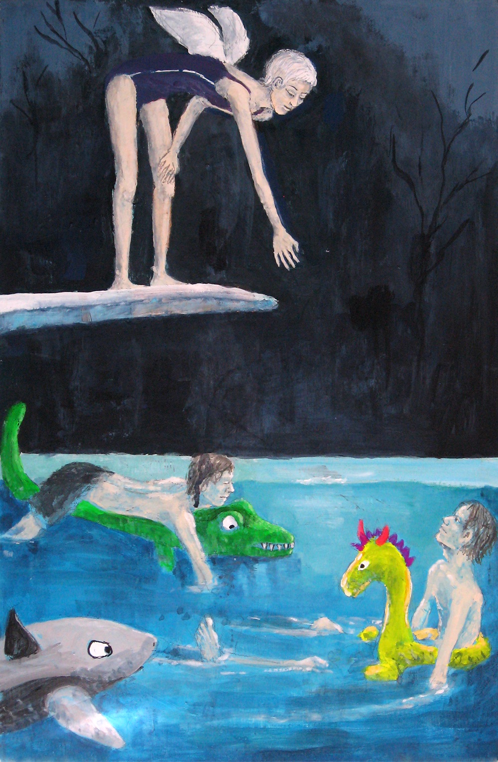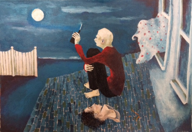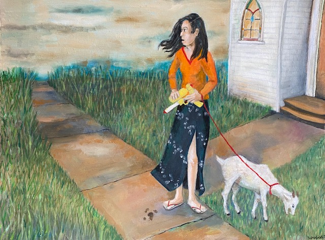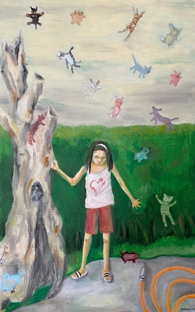 Liz Johnson’s paintings seem to scratch away at the surface of everyday life to reveal remarkable visions that we don’t take time to notice. With subtly surprising composition and perspective, she casts us, along with a host of familiar but unlikely characters, into a world “upended” and enticing. Though beautifully rendered, the hint of stylistic naiveté or eccentricity adds an element of folklore or mythology, and everything speaks to us: signs, animals, monsters, wayward balloons. The perfect balance of light and dark, silence and noise, despair and hope, teeters on the edge of chaos, but some endearing sense of connection between humans and between humanity and the magic all around us is ultimately transcendent.