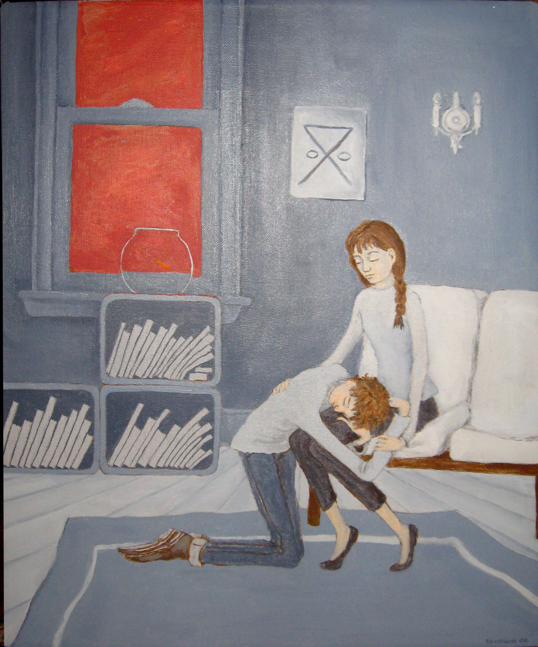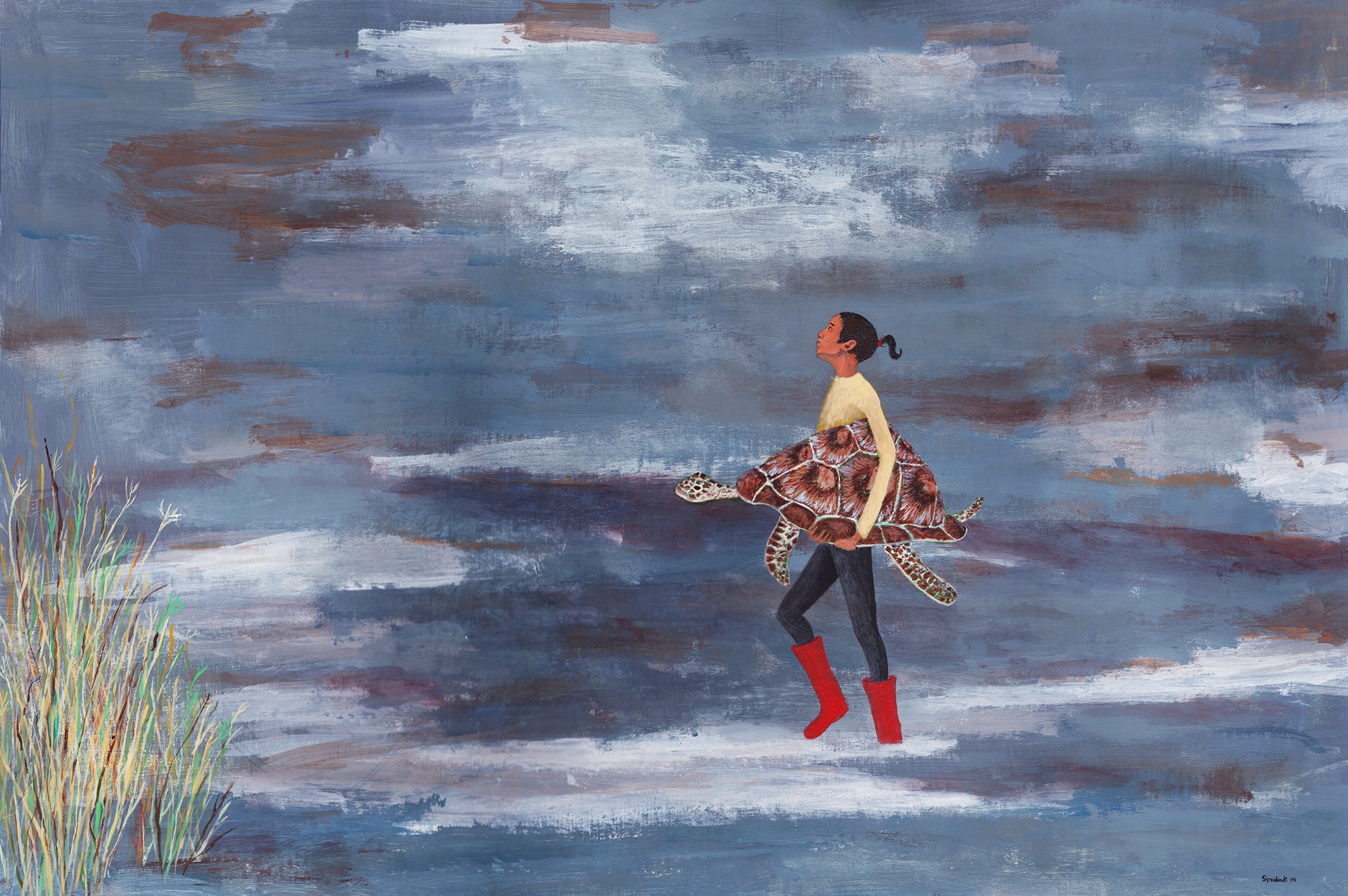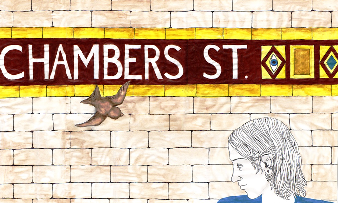 I do a lot of paintings of animals with humans that have a symbolic meaning to what’s going on in the work. For example, in the painting “Chambers Street,” a girl is waiting at the Chambers Street subway station in New York City. At Chambers Street, there are a lot of stray birds, sparrows mostly, that actually hang out and fly around down there. I wanted the bird to be a symbol of something the girl was experiencing inwardly while she was waiting for the train. Even at a grimy subway station, someone can have some sort of epiphany. In “Girl with a Turtle,” I thought the turtle could represent something that the girl was struggling with, and that even though she was struggling and it seemed too large for her, she was successfully carrying it to the shore.