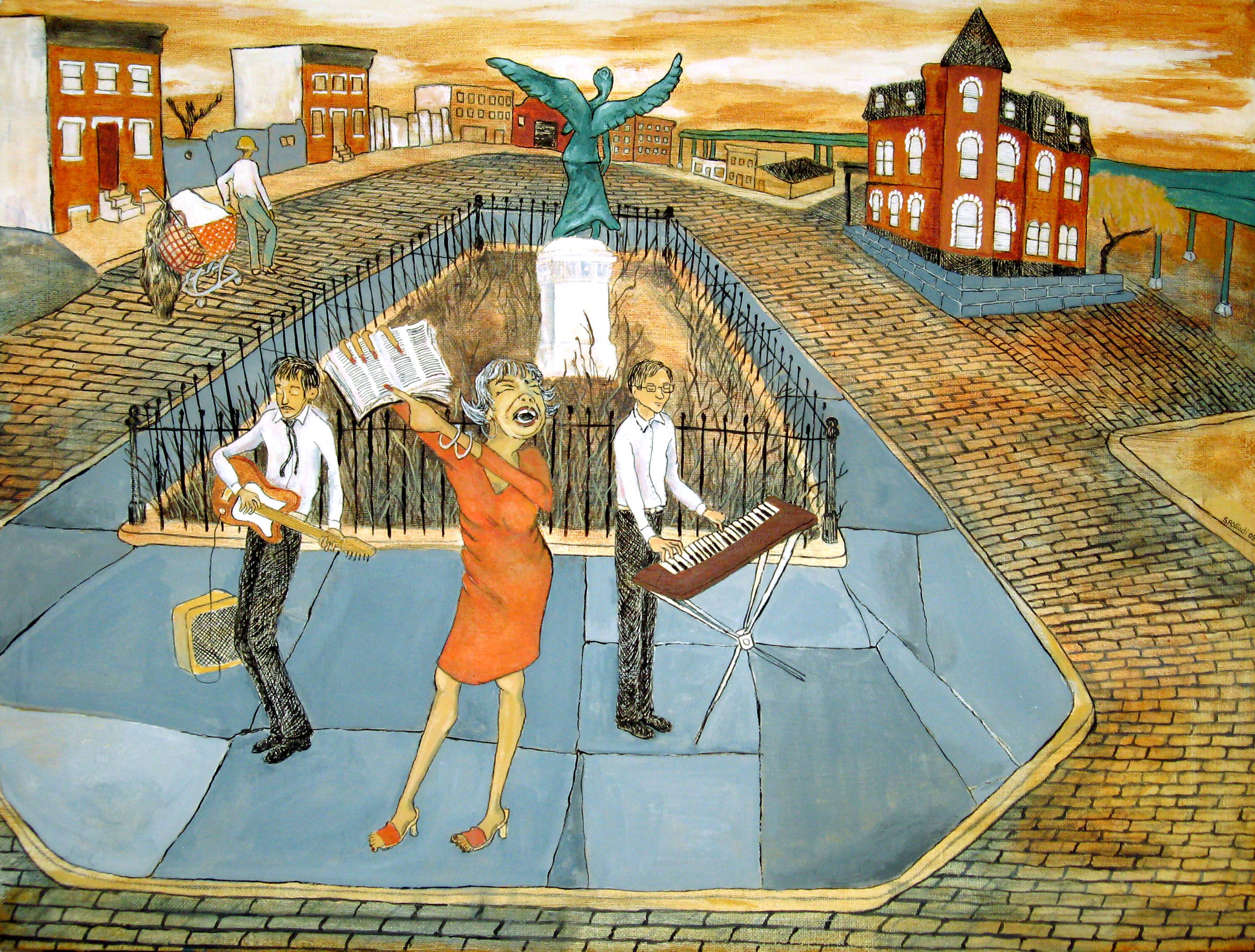 I sometimes play with the painting space to make things more immediate, or tilt things to make a more dramatic, symbolic, or surreal effect. In “Freedom Square, Bushwick,” I wanted to make a painting about aspiration. I took an ordinary city street and sort of upended it, leading the eye upwards. The three religious people are aspirational through preaching and singing, the man attempts to pull the shopping cart up to the top of the street, and the iron statue of the angel reaches the sky, and may or may not be ready to come to life and fly off the pedestal.