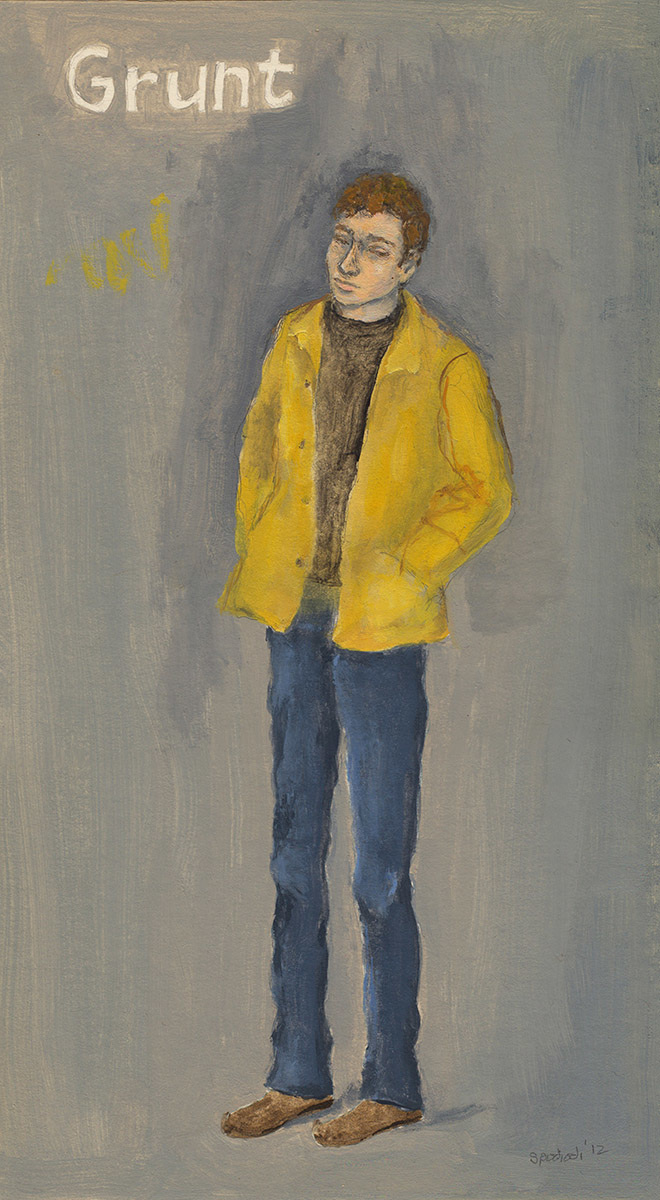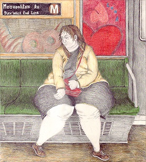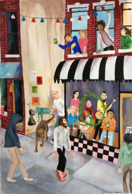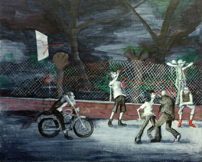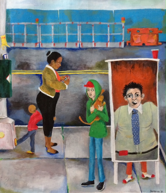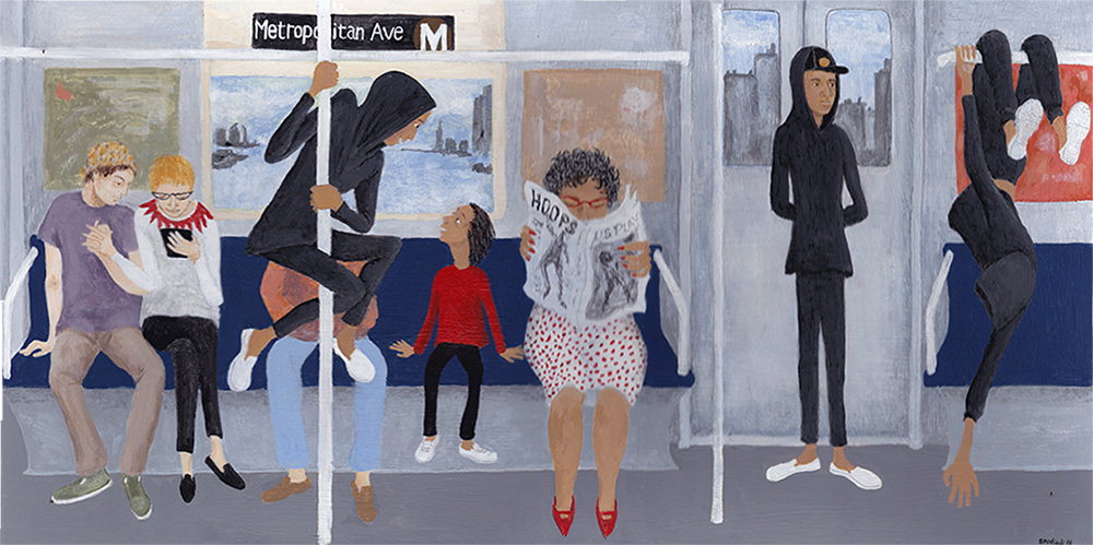 Though the setting for your paintings is often kind of ordinary or every day—a subway car, a city street, a park bench–there’s a sense that if people paid more attention they’d see something remarkable…if they didn’t have their head buried in the newspaper or glued to their phones they’d see anything from subway dancers to ghosts or zombies or people flying through the air. Do you think of a balance between quotidian and remarkable, reality and surreality when you choose subjects to paint?