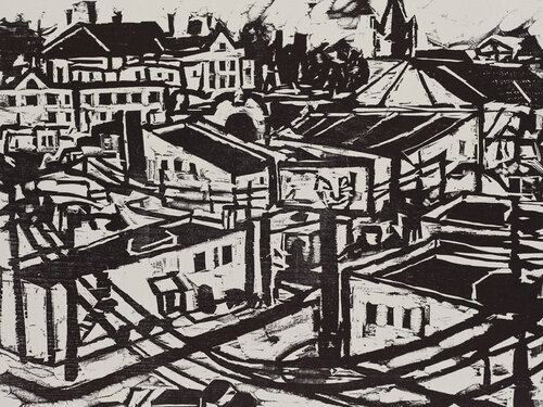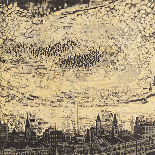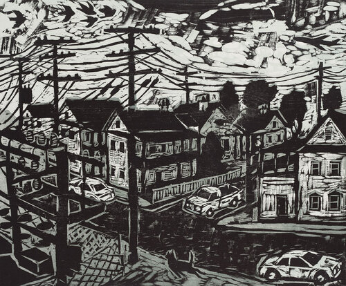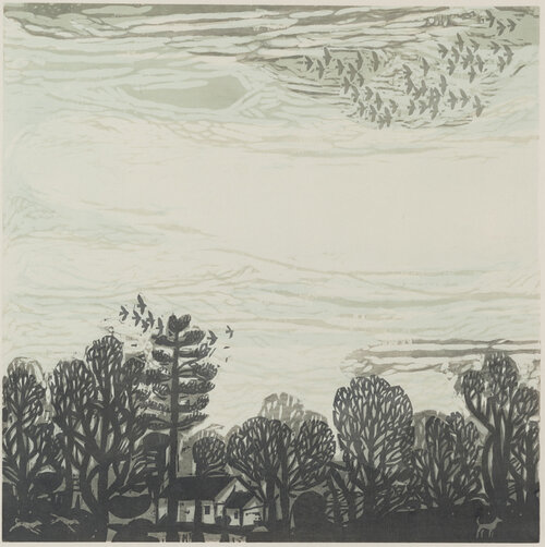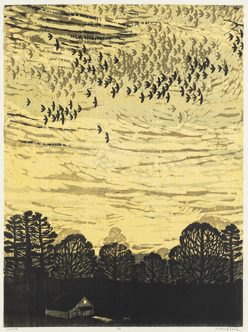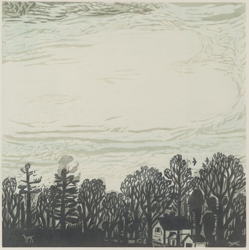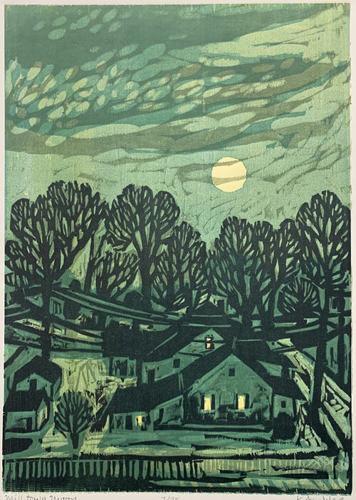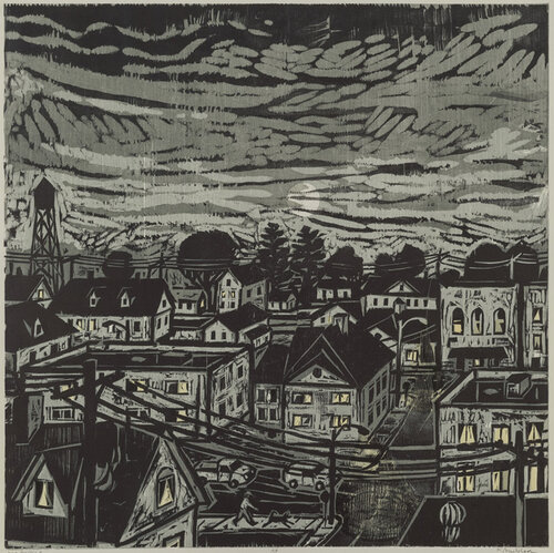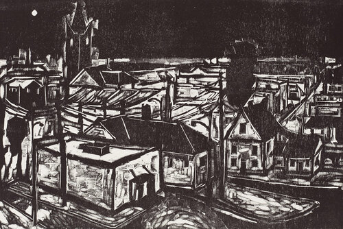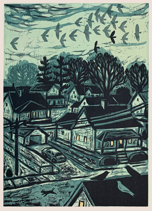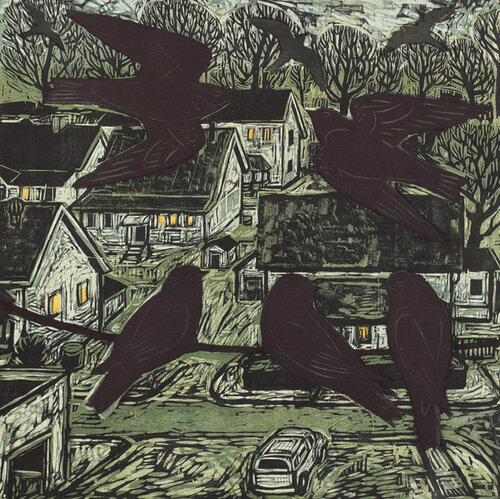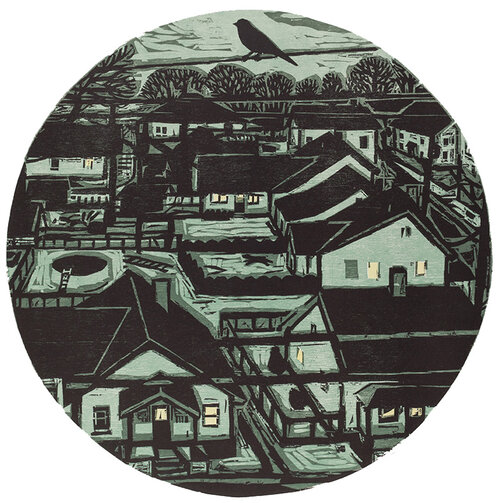There’s an unusal depth of light in Kent Ambler’s fine, strong woodcuts. He captures the quietly teeming shadows of distant nighttime streets, and the odd loneliness of the glow from other peoples’ windows. The familiarity of sleeping towns and cities is edged with magical dreamlike images–fast-moving clouds, racing foxes, flocks of birds. Their presence adds poignancy to the sense of loneliness–we’re not alone, though we don’t always notice. We’re part of something bigger than we’ll ever understand, though we can search for meaning in the clouds and the birds, reading the auspices of their flights.