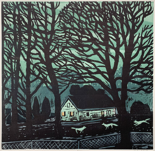 My surroundings offer endless subject matter; my three dogs, two cats, my wife Peggy, the lake, the woods, birds, flowering trees, neighbors goats, the list goes on and on. My work usually starts with an observation or a quick sketch. The images that I sketch then become a leaping point for the exploration of aesthetic qualities. Mark making is the main focus in my woodcut prints, while surface and paint application are the main focus in my paintings.