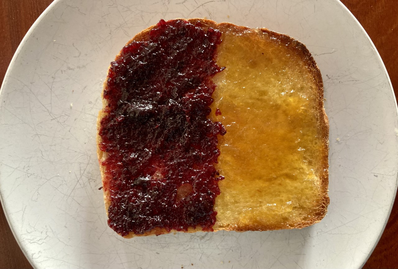 In my recent years of toast-eating, I’ve been adjusting my recipe in search of the best bread for the most perfect piece of toast. I like whole wheat toast and toast with nuts and raisins, and toast with olives and rosemary, and probably most other kinds of toast you could think of, but I was going for here was a very simple loaf, the kind we would buy from the bakery when I lived in London off-and-on over the years. A childhood memory of comforting toast. I wanted the crust to be crisp but not tooth-shattering, I wanted the crumb to be a bit loose, not too fine and cakey. I wanted the bread to be a little chewy under the crispy exterior. After many many loaves of bread, this is the recipe I have arrived at. Lately I’ve been eating it with half blackcurrant jam and half apricot jam. It’s a real treat.