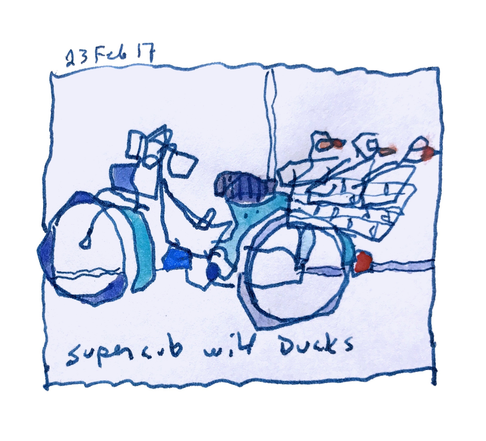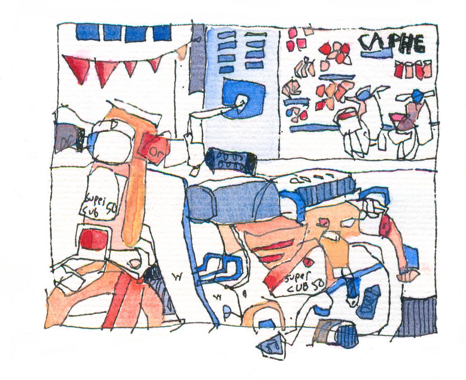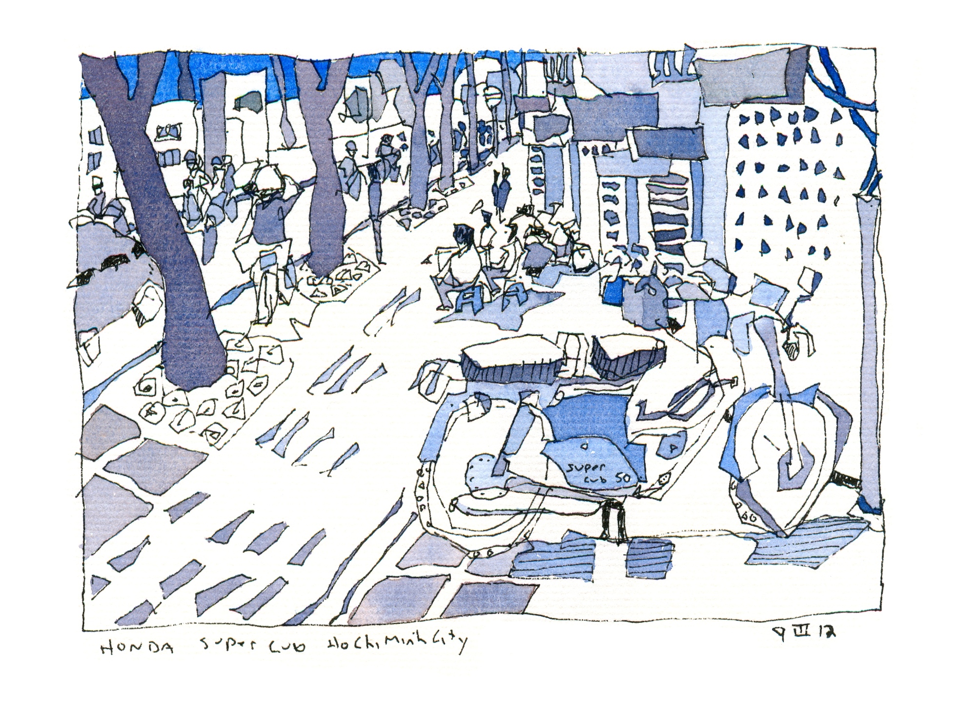 Walk until you find a Super Cub and then draw it, all from Vietnam where they still honor the trusty little motorbike.