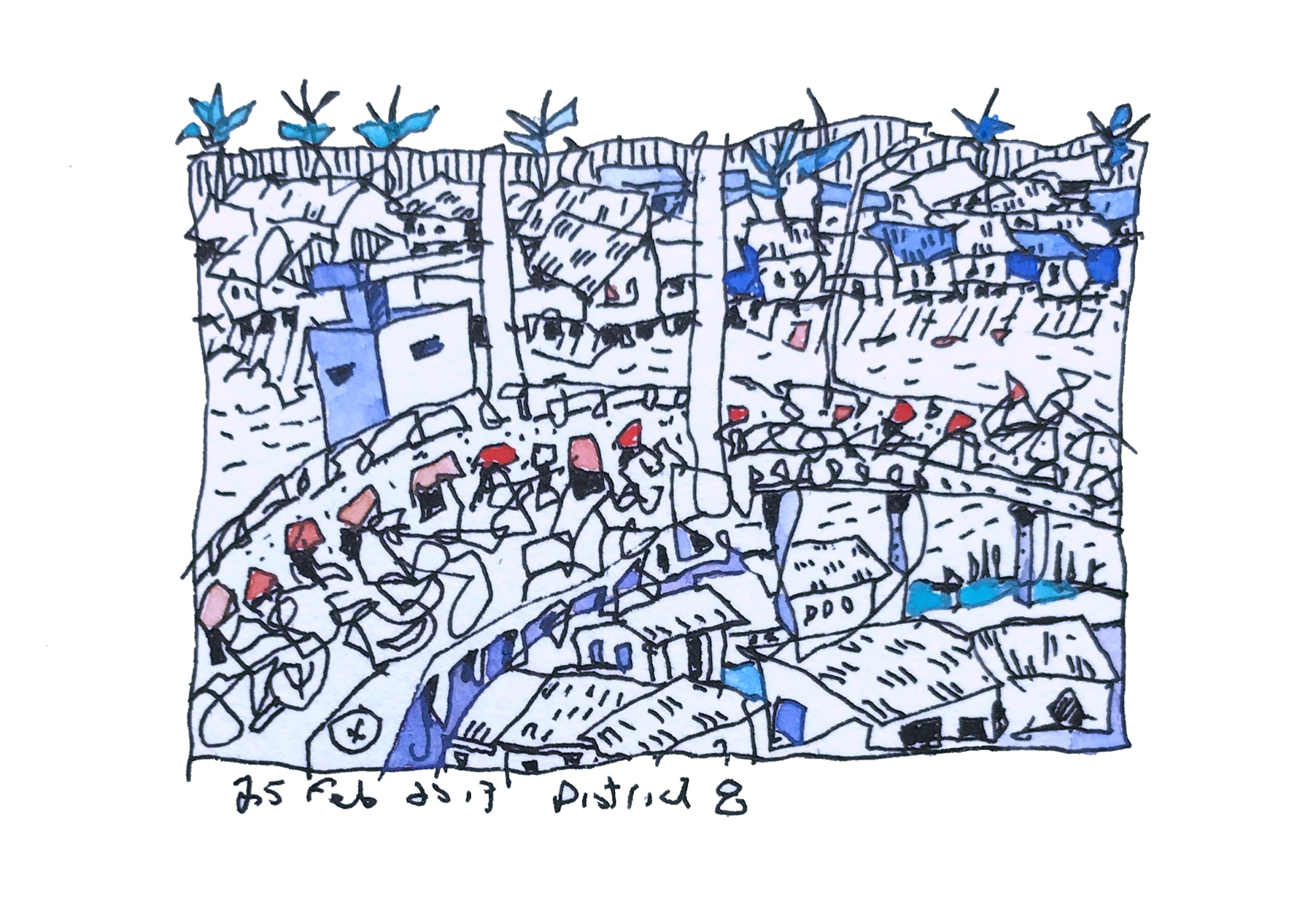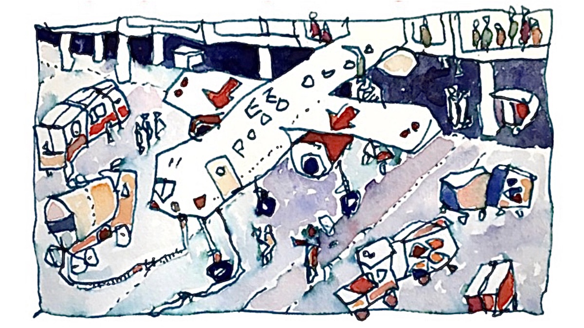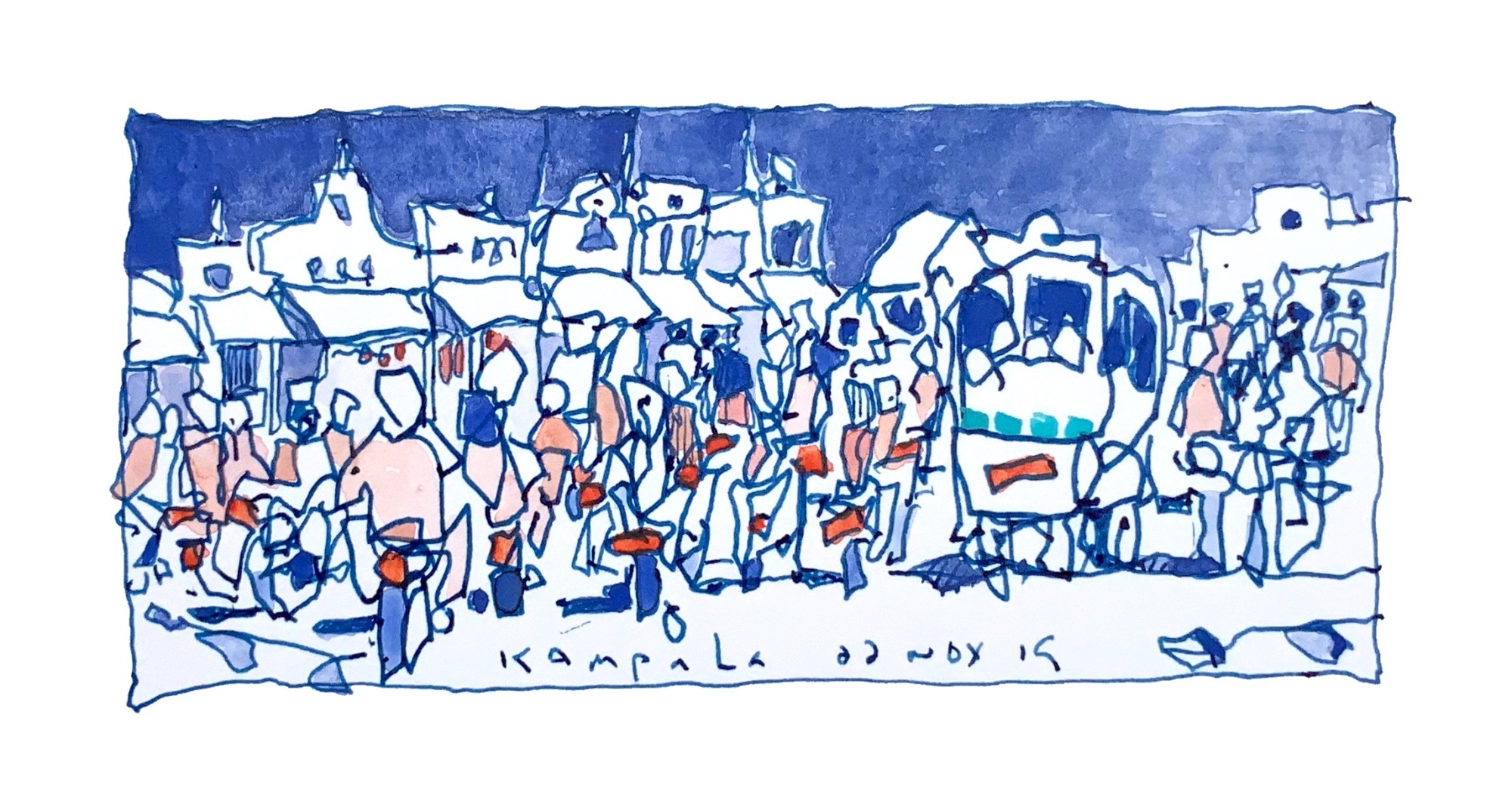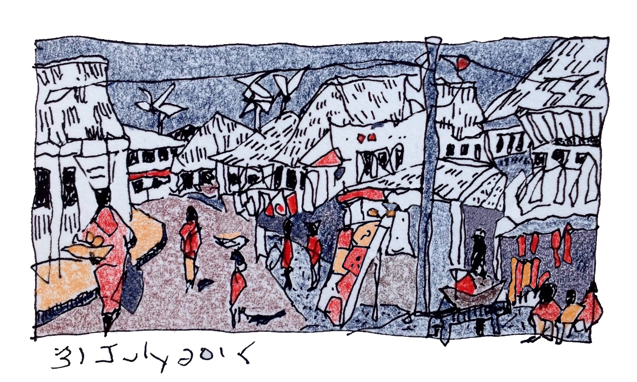 Learn some perspective: receding parallels converge. I use to stand someplace that I found interesting and imagined I was 50 meters above looking down and drawing what I saw. This was Serekunda, the population and shopping center of Banjul, The Gambia.
