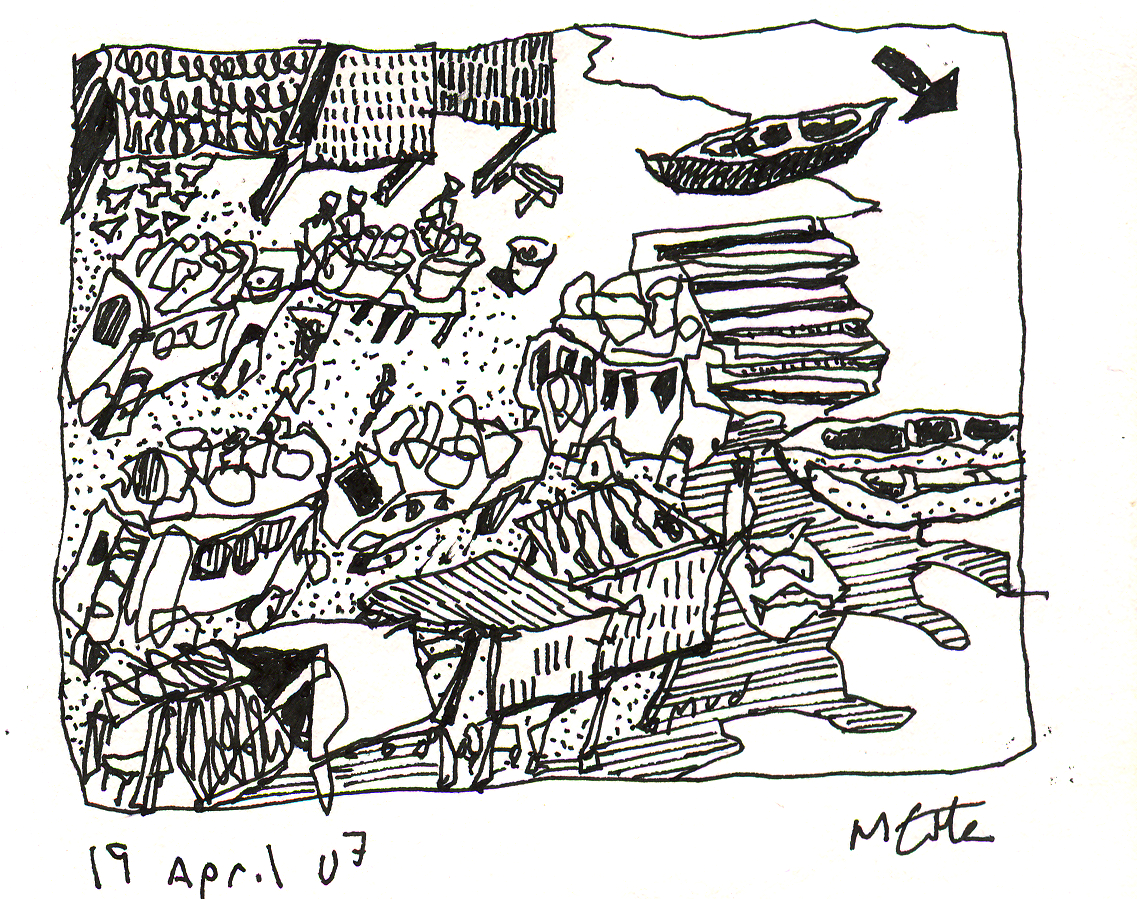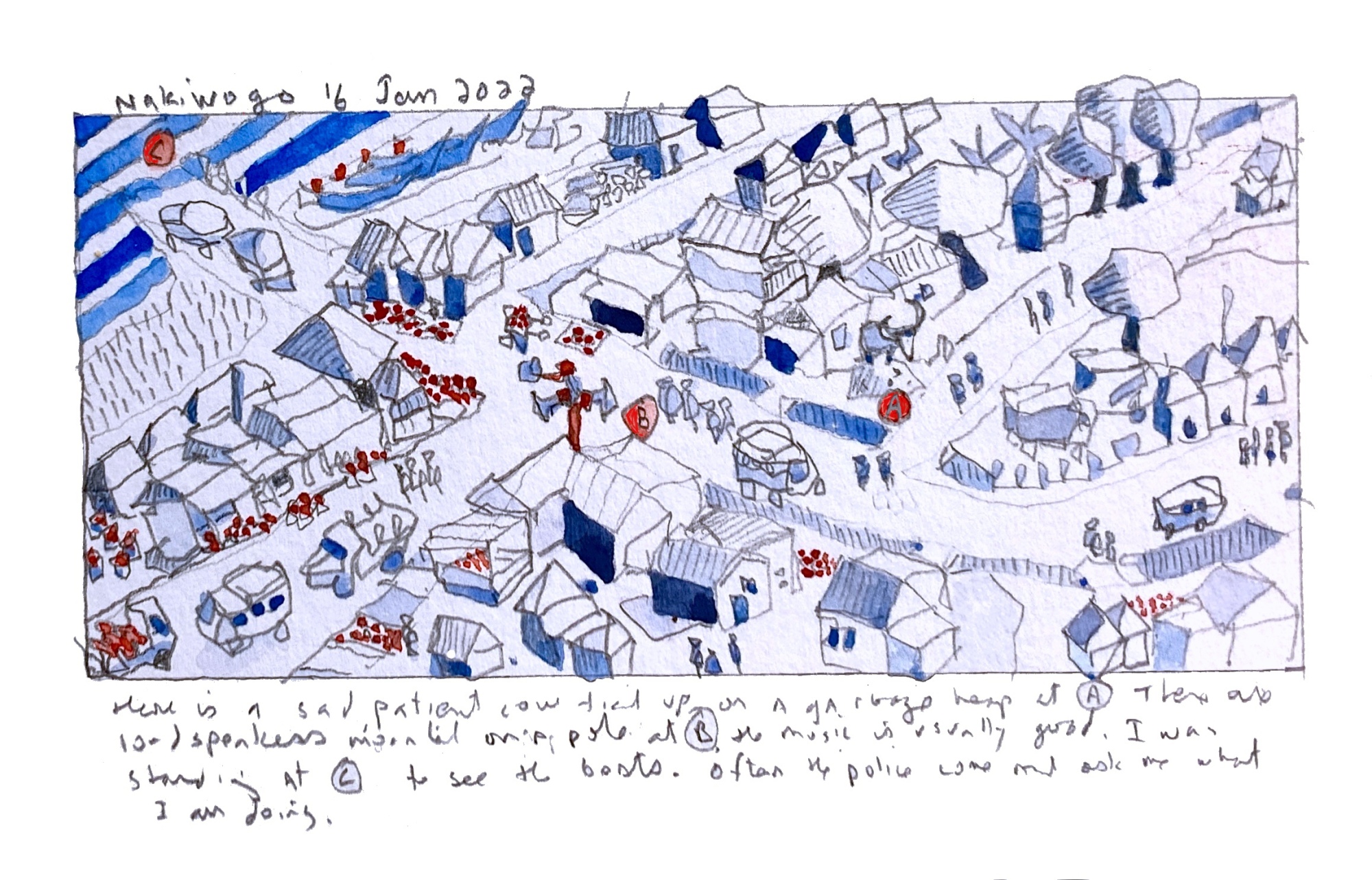 Draw the biggest tree you can find. Trees are useful signals to draw, especially large trees. I worked at an HIV-2 study site in Caio, Guinea Bissau. The village was divided into zones, each zone had a sacred meeting place, a Tumba, usually under one or several large cotton silk trees. I tried to draw most of the Tumbas in Caio. Here is the Zone 2 Tumba.
