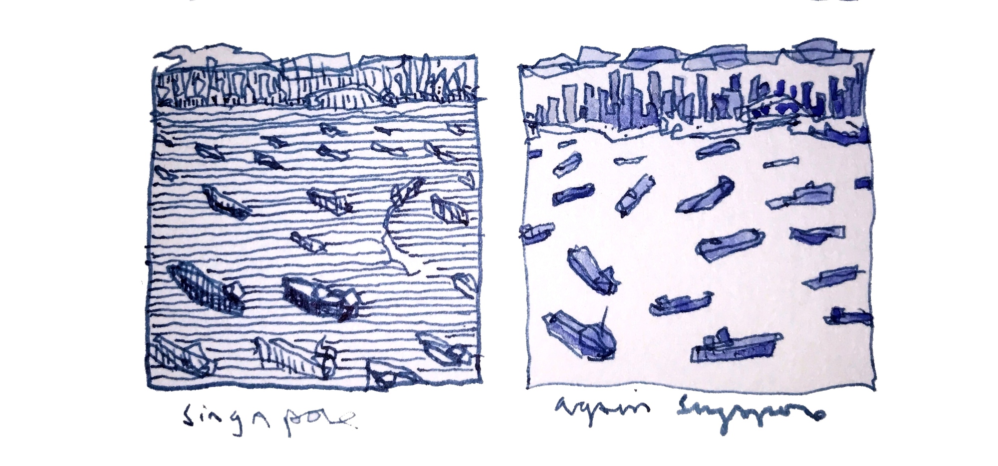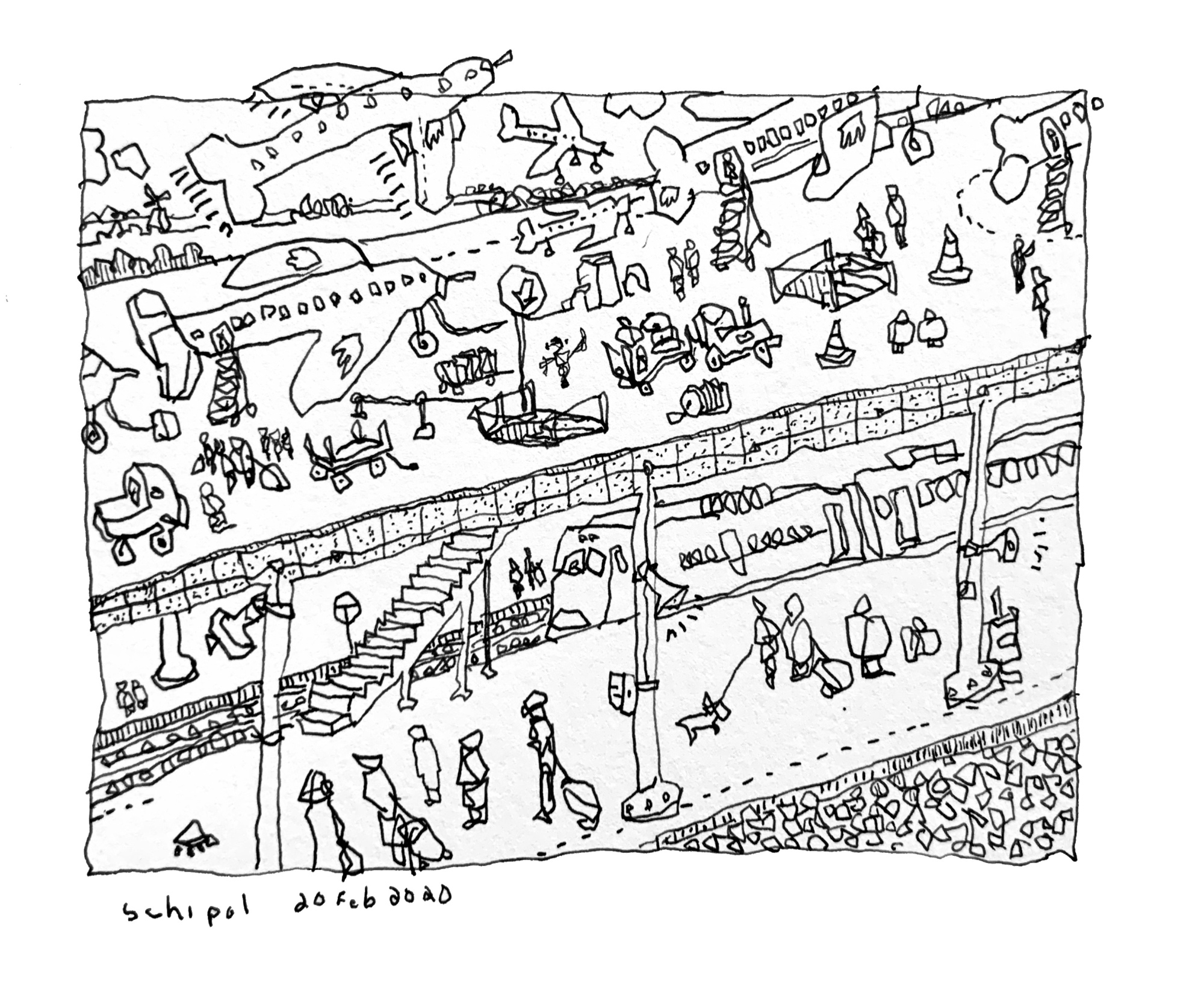 Draw airports, airplanes or what you see looking out of your window seat window. I still have a little kid fascination with planes and trucks and tractors. These were from (upper left then clockwise) Banjul, Stansted, Schiphol, Berlin Tegel, over Ho Chi Minh City, over Singapore.