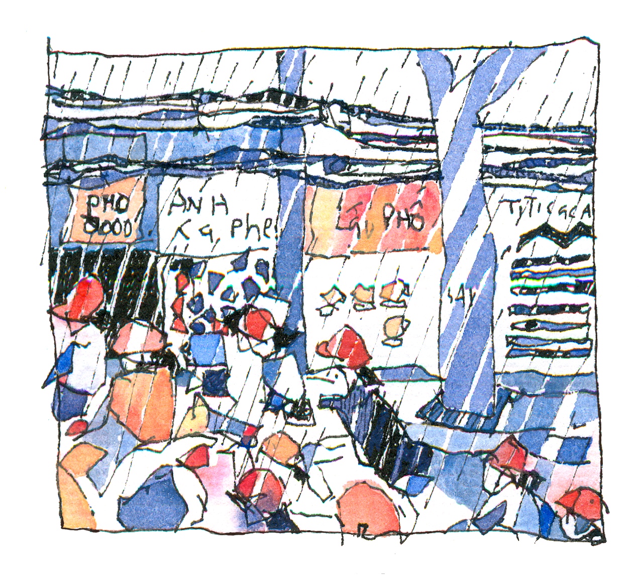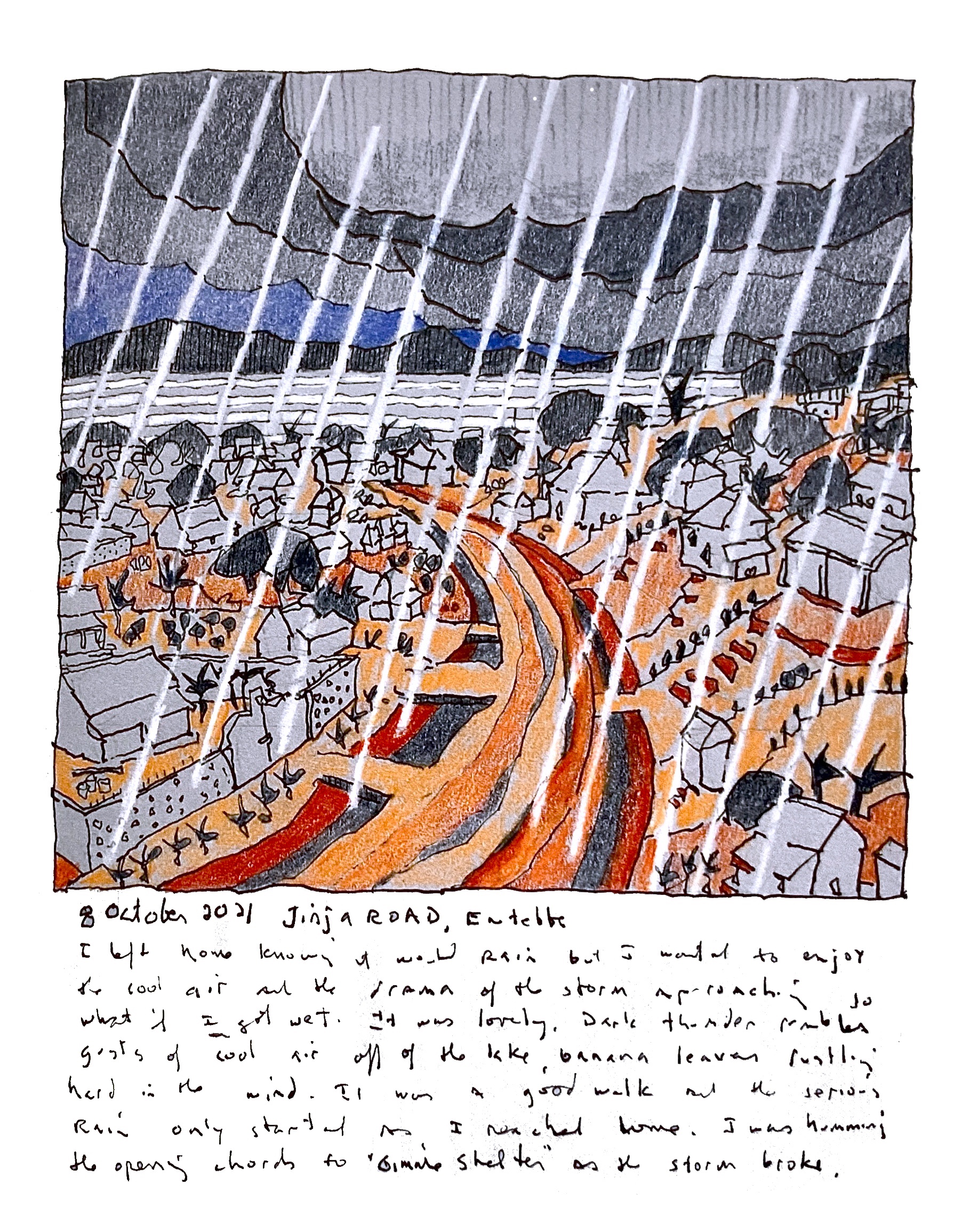 Draw the rain. These were from (upper left then clockwise) Entebbe, Uganda, Fajara, Gambia, Ho Chi Minh City, Vietnam, Da Nang, Vietnam, Makeni, Sierra Leone and Caio, Guinea Bissau.
