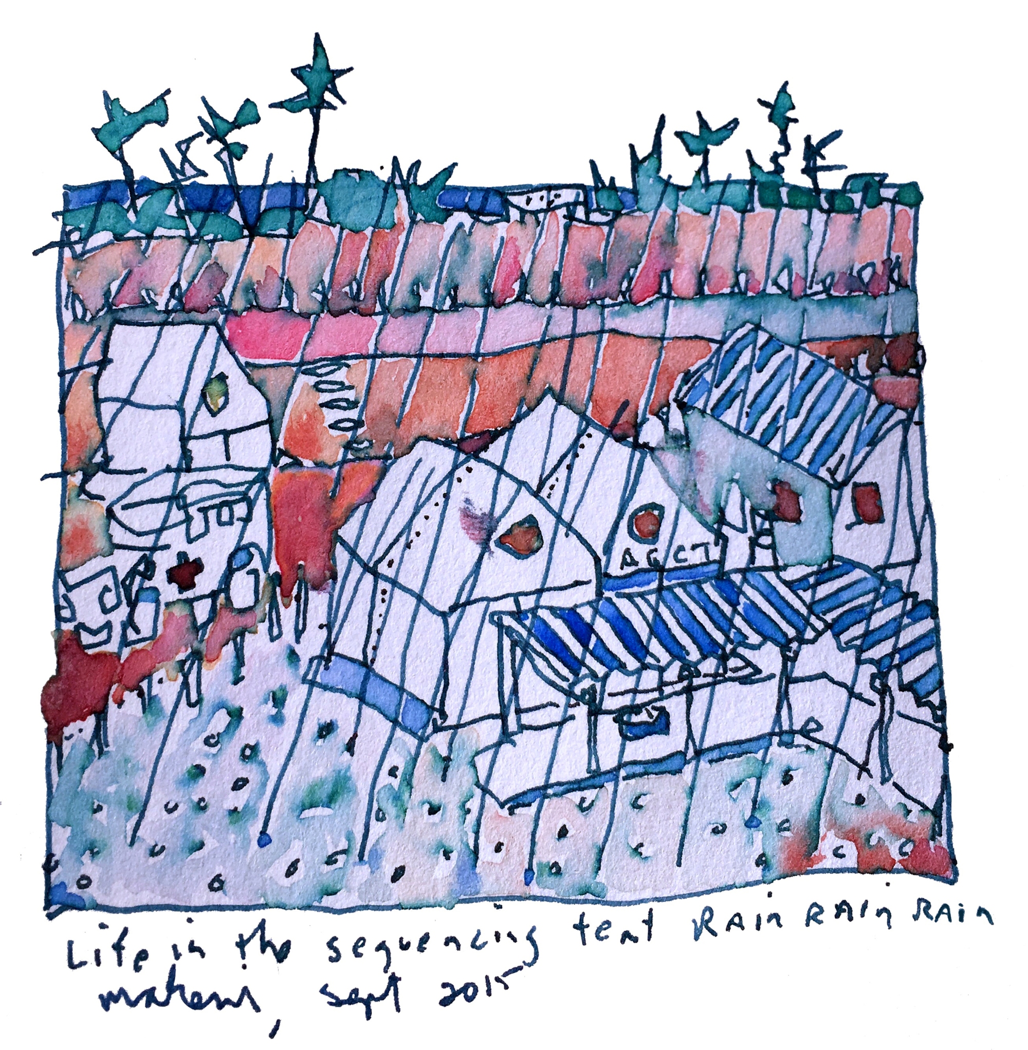 Draw Your Breakfast. It was an old drawing exercise used to answer the question “What should I draw?”. This example was from the kitchen in the rental house in Makeni, we were there to sequence Ebola virus during the big West African outbreak. We had a camping stove “Plein Air”, a cheap pan from Rotterdam, C206 gas canisters from the local grocery store, a coffee press that Armando had left us, a few packages of Italian espresso, the most recent brought in by Ian, and a box of Parrot matches with the cool logo. The palms trees and strong shadows because we were close to the equator. On this morning we had no electricity, either a big storm had come through in the night or we had forgotten to top up the credit or a fuse had blown or something. But we were prepared and could have our coffee.